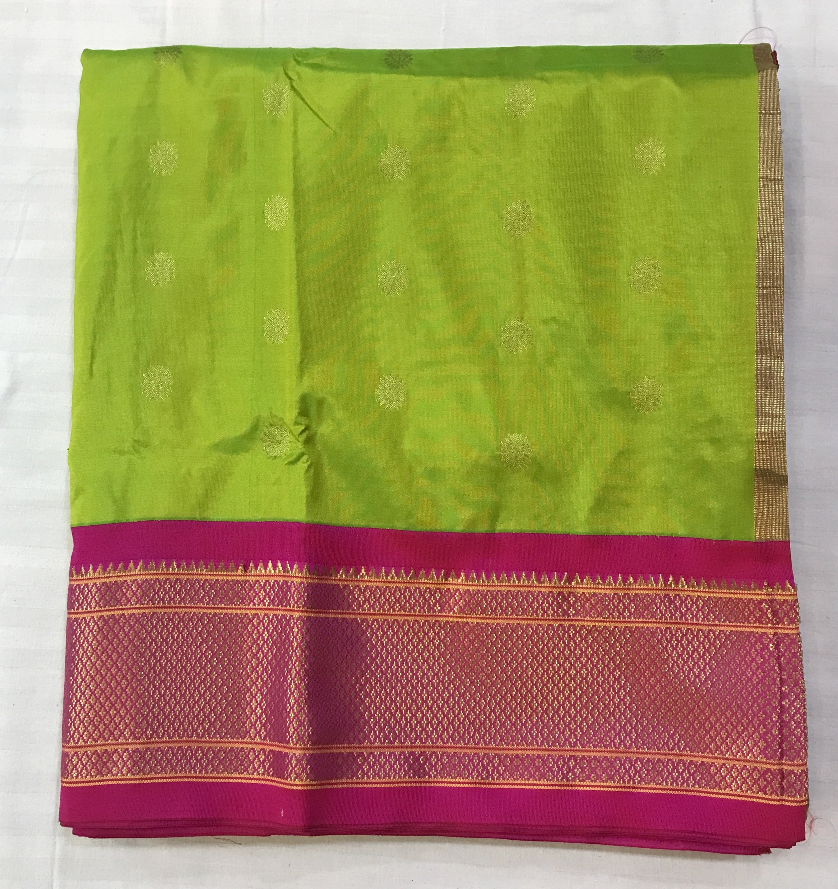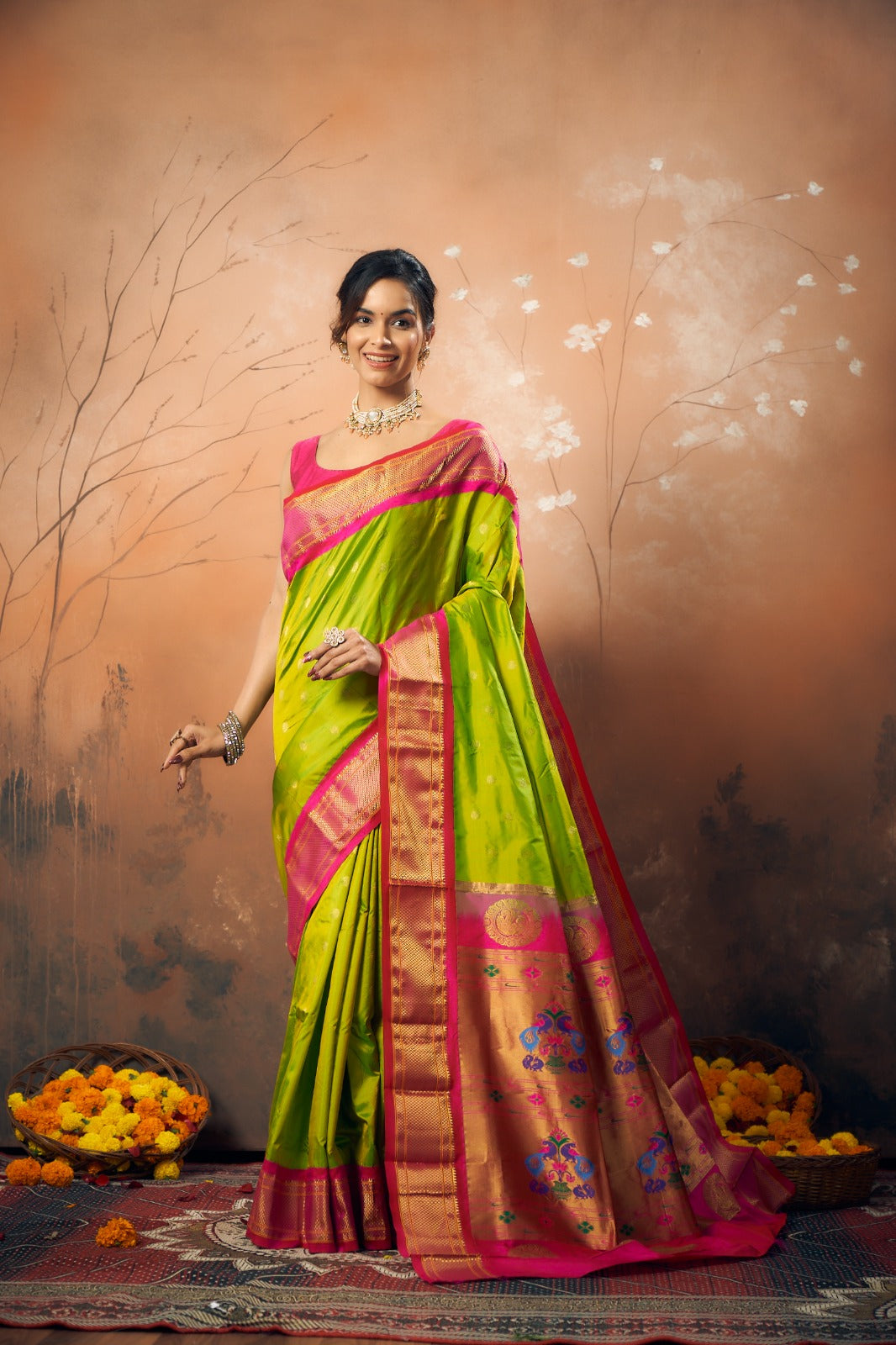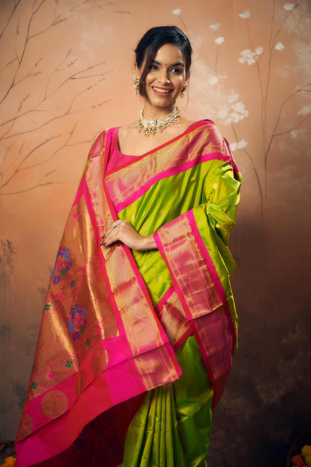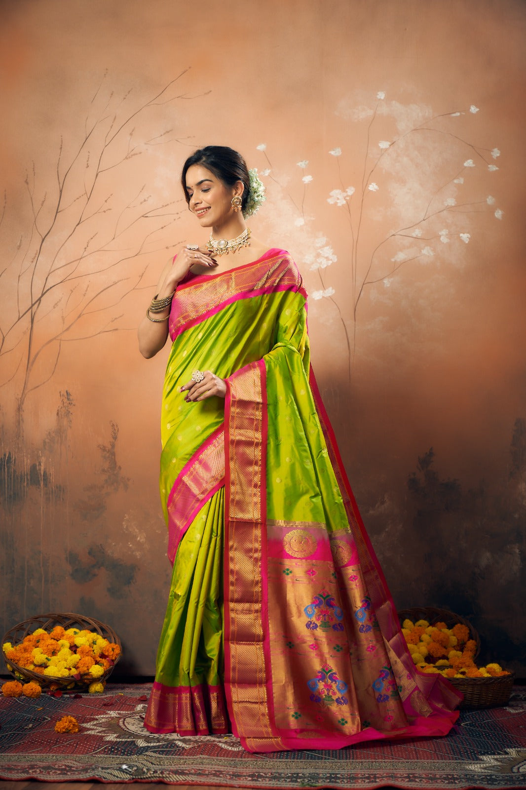 A classy parrot-green coloured power loom Paithani, with its added class by the intricate floral buttis(motifs), is a piece of grandeur. The contrast created with the pink border and an golden zari pallu looks ethereal. This saree works wonders for any occasion! Do not miss the peacock ( motifs ) design pallu highlighted in multicolored silk thread throughout this Paithani.