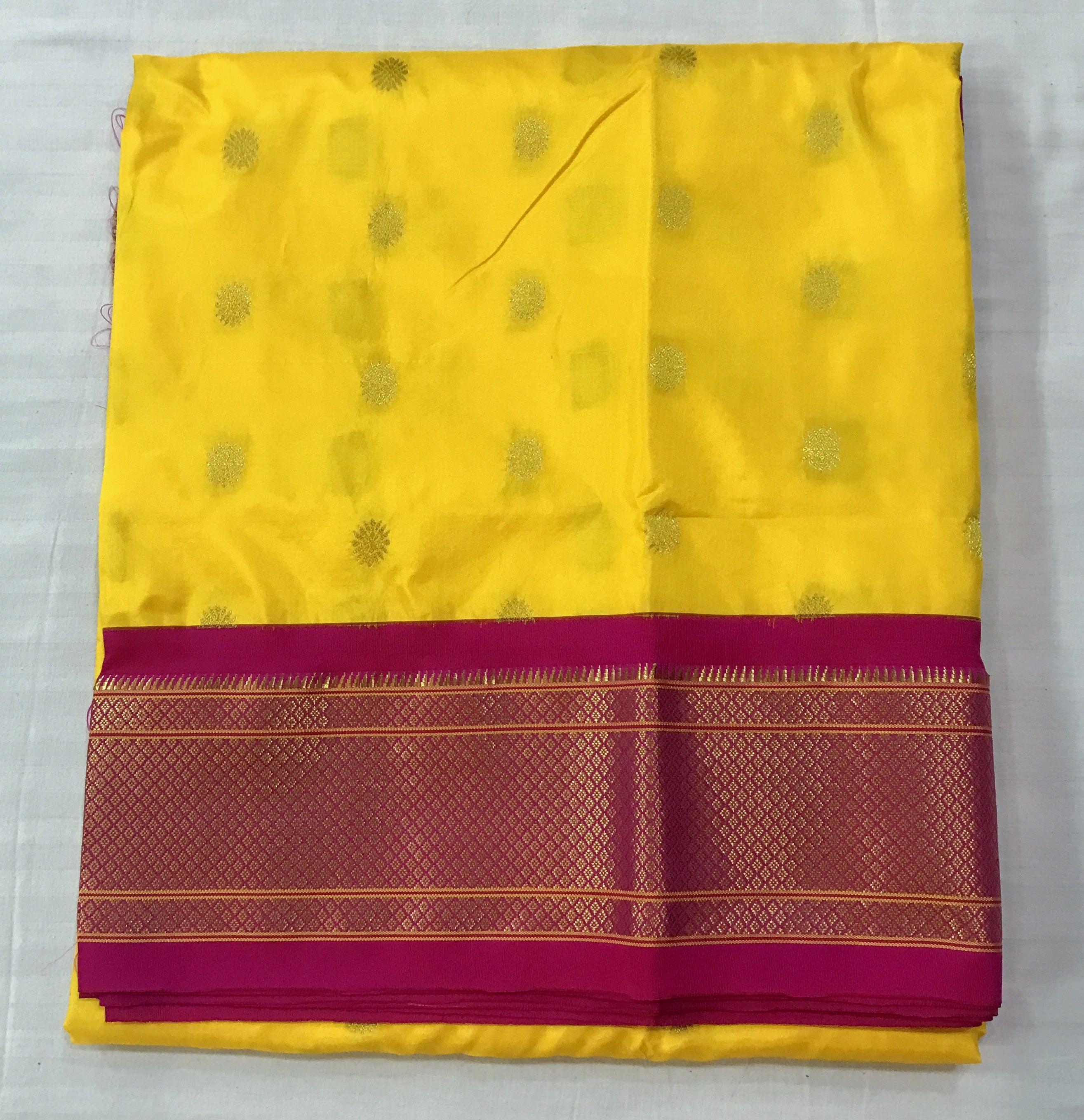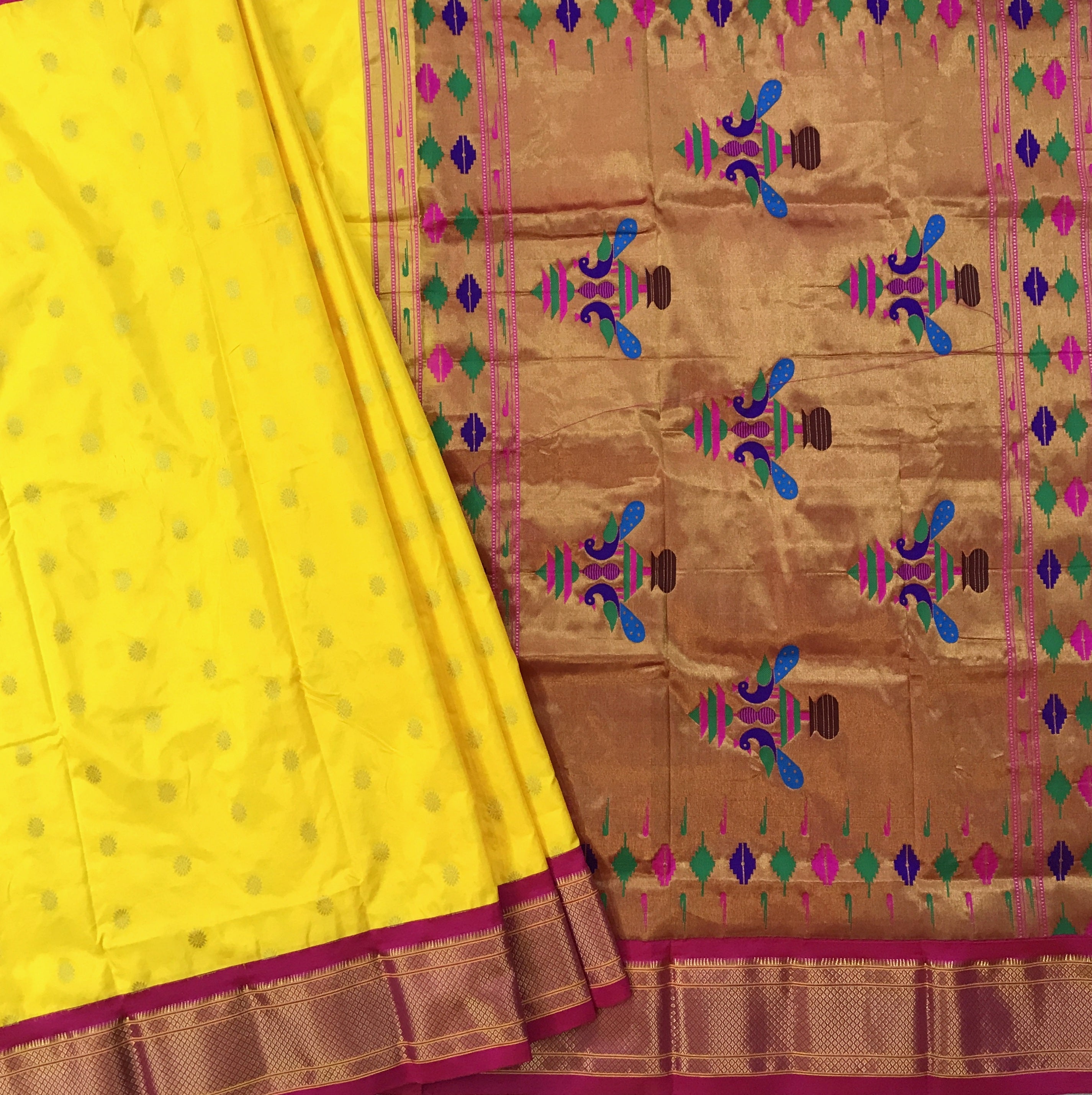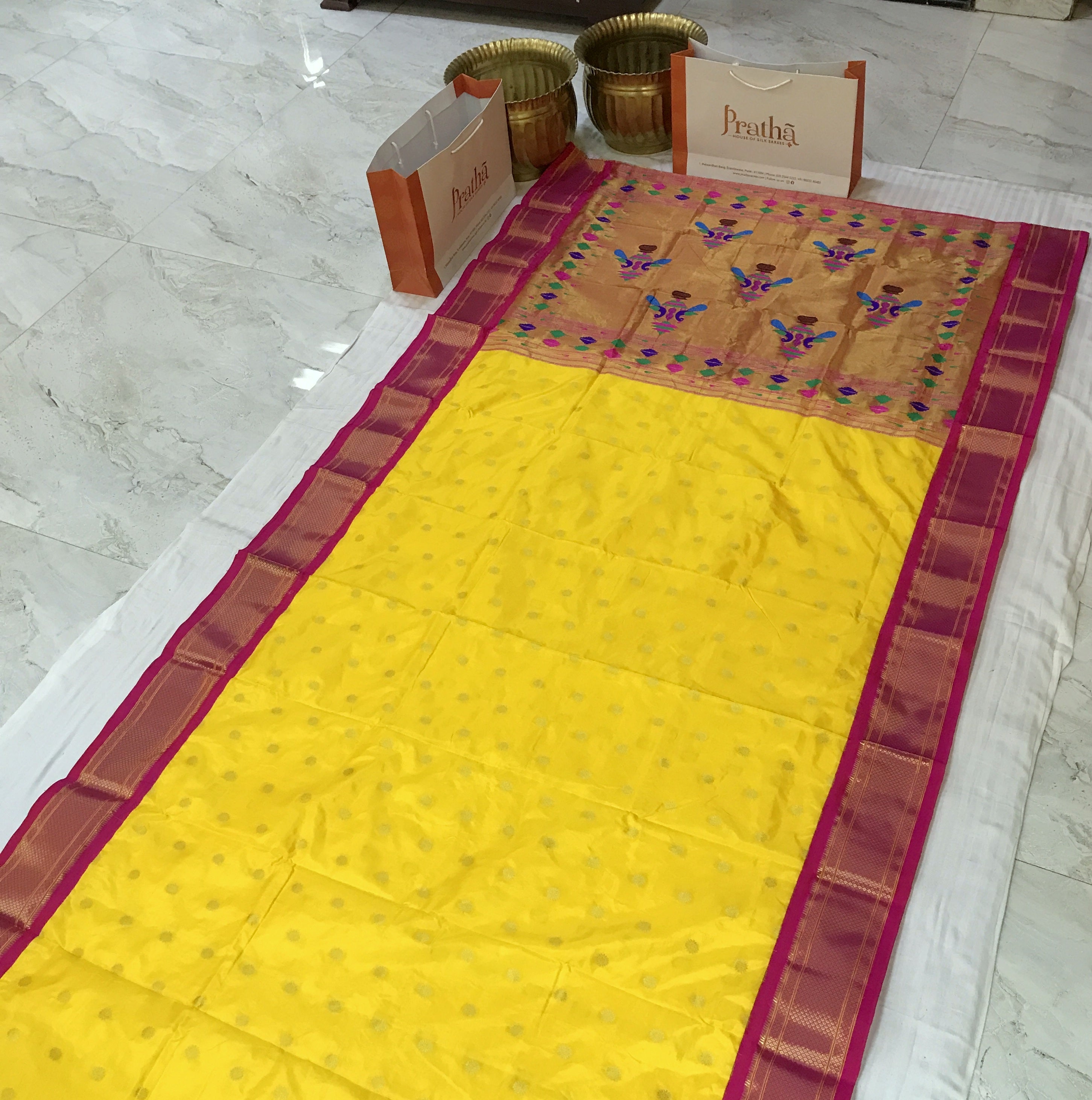 The phenomenal combination of yellow Paithani with a very beautiful pink contrast border is Pratha's favorite. The delicate meenakari flower butti add the needed amount of grace which makes it perfect for any and every special occasion of yours!