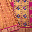 This fresh shade of peach-pink , in excellent pure silk saree with the most amazing pink coloured golden zari border is a classy combination for power loom Paithani. This stunning Paithani flaunts beautiful floral butti ( motifs) of golden zari and beautiful golden zari pallu with peacock motifs add grace to this festive saree. Pratha happily presents these in beautiful colours.