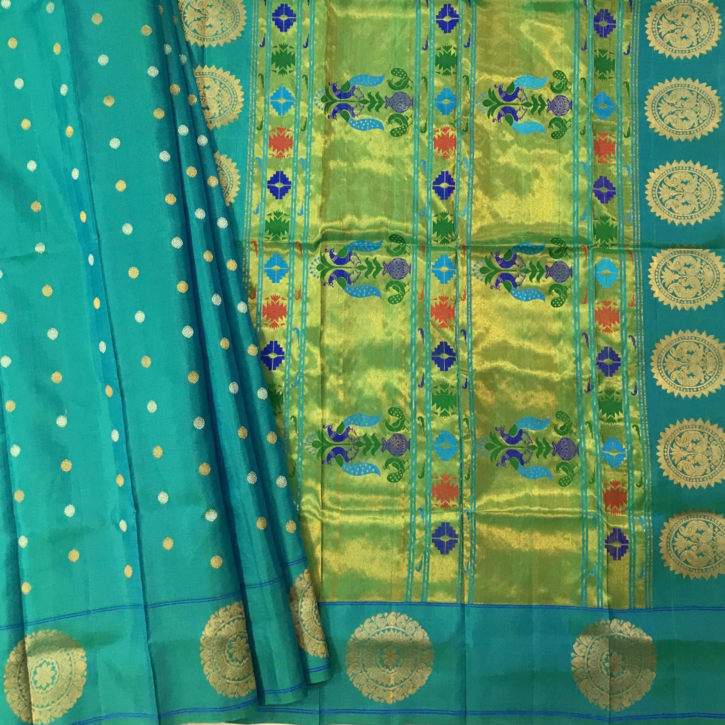 A beautiful shade of green this one is a stunner! The gorgeous designer chakra border, apart from the traditional border makes this a unique Paithani. The golden zari colour in the border and Palllu, the intricate small butti (motifs) all over the saree are the highlights of this special border Paithani!