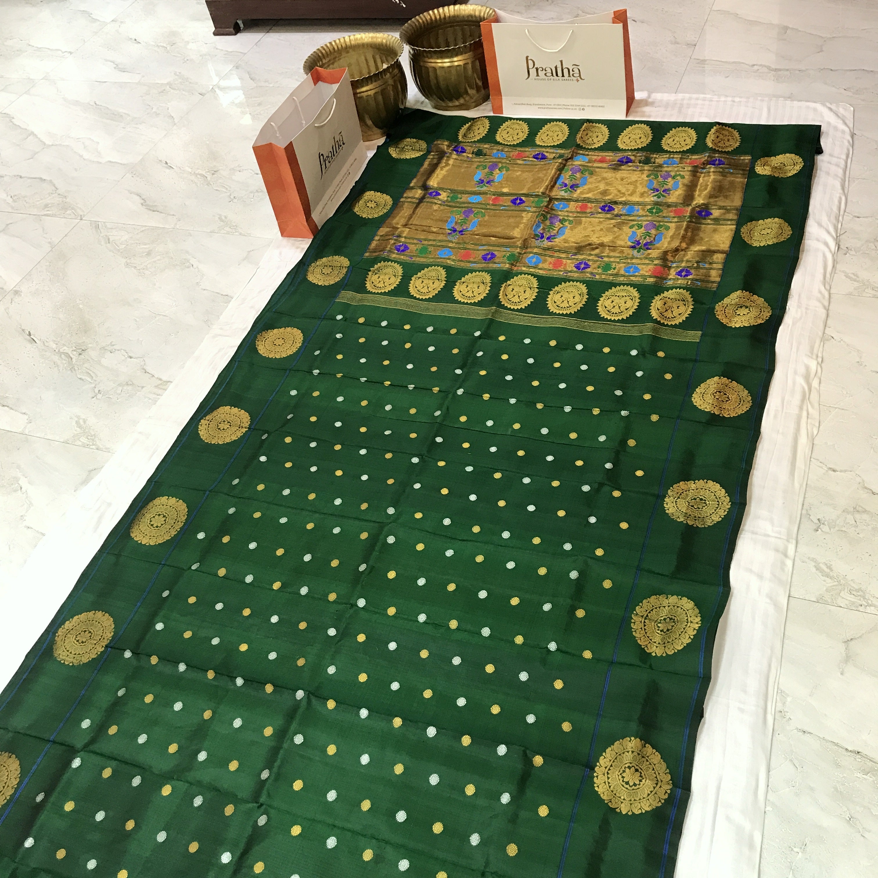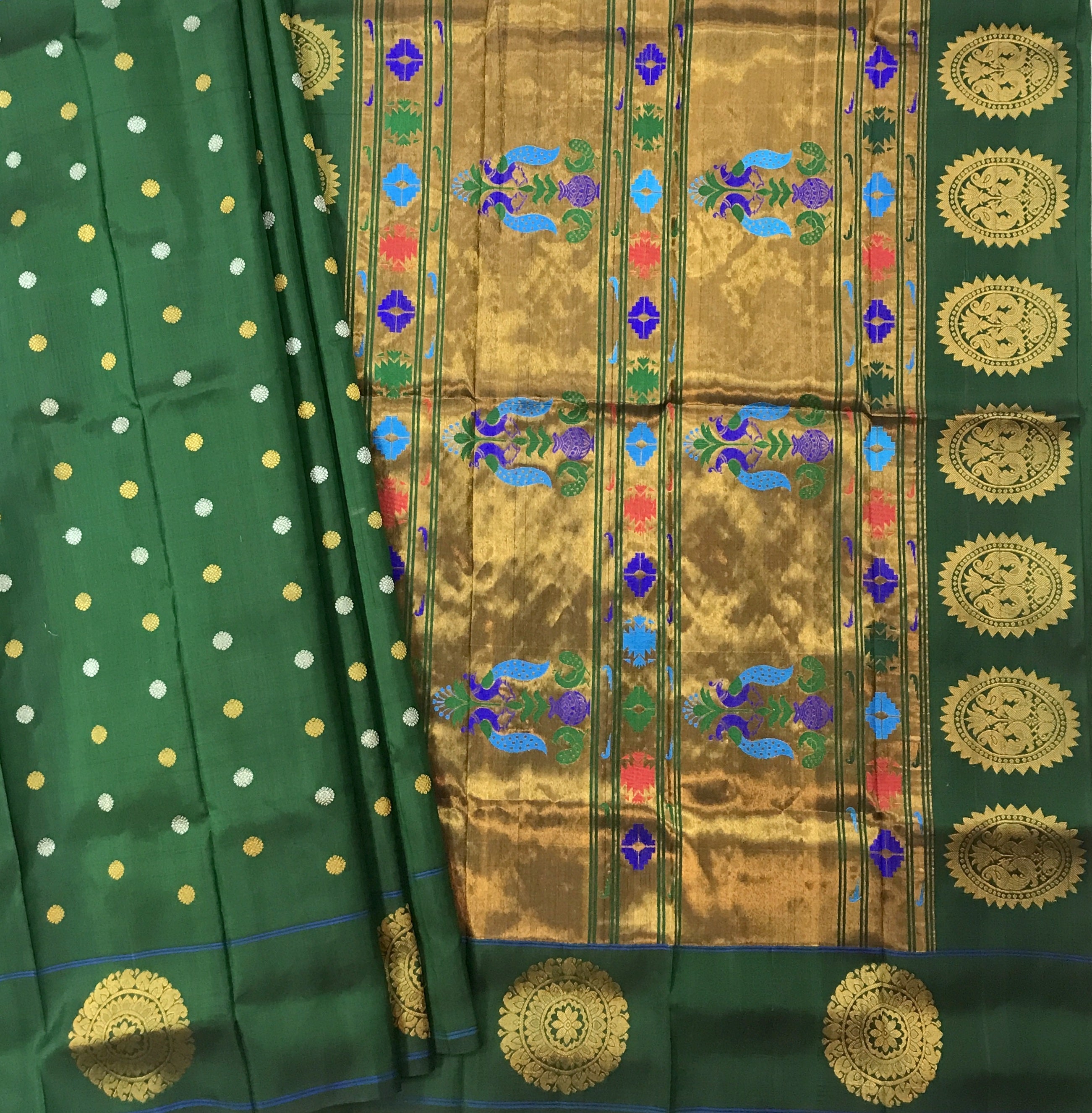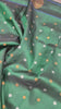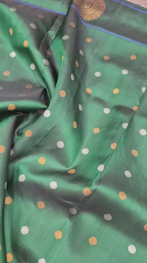 A beautiful shade of green this one is a stunner! The gorgeous designer chakra border, apart from the traditional border makes this a unique Paithani. The golden zari colour in the border and Palllu, the intricate small butti (motifs) all over the saree are the highlights of this special border Paithani!