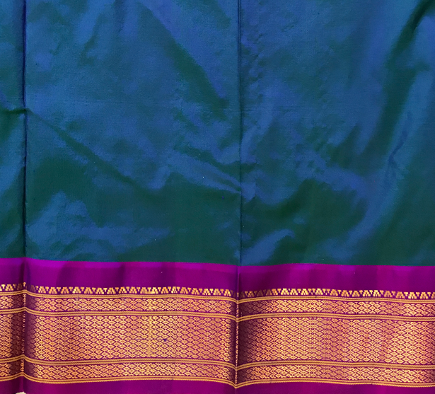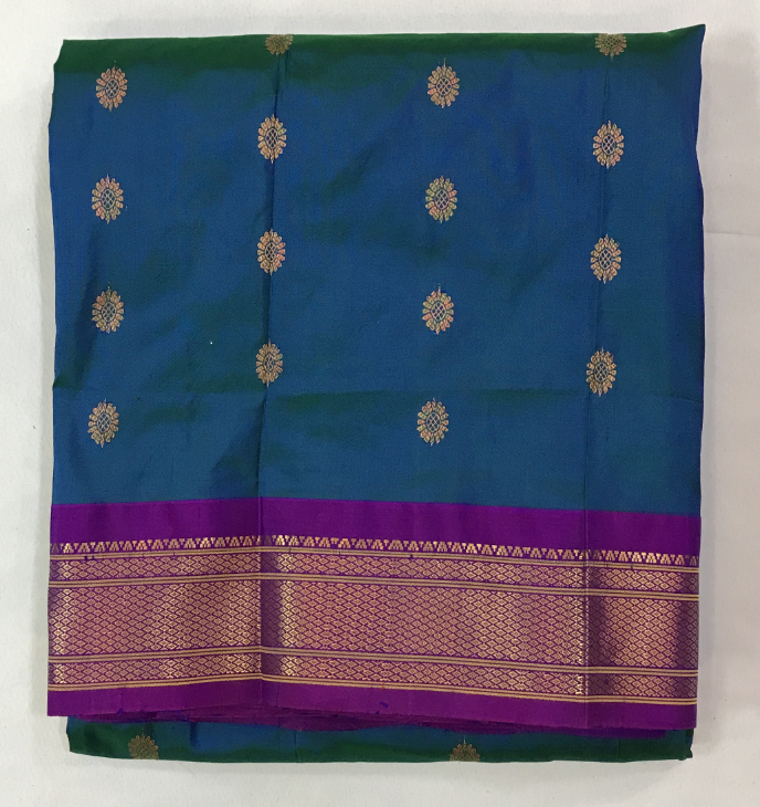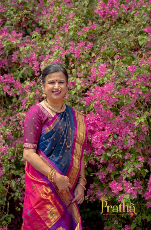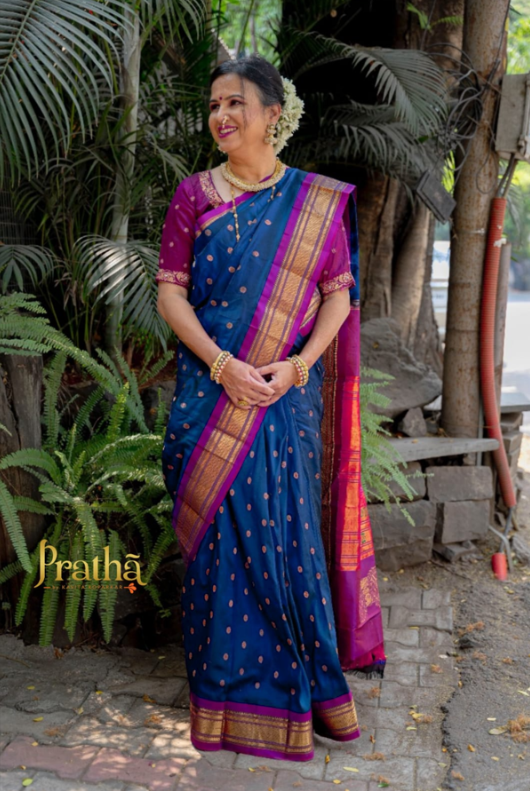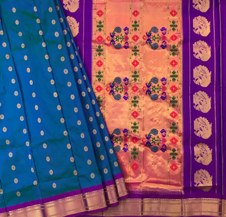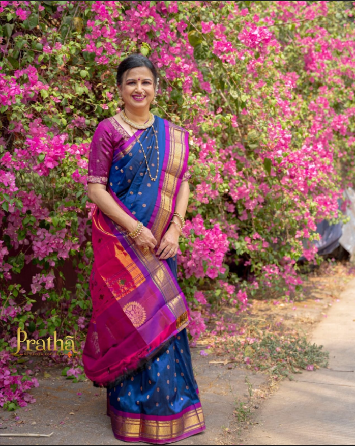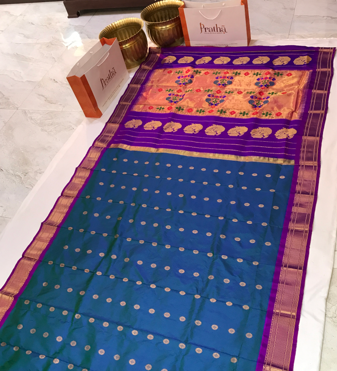 This weave is a stunner with its peacock blue Paithani with a complementing fresh purple border. This Paithani has floral butti all over with a traditional border, a perfect balance of classic and unusual. This is one of Pratha's favorite!