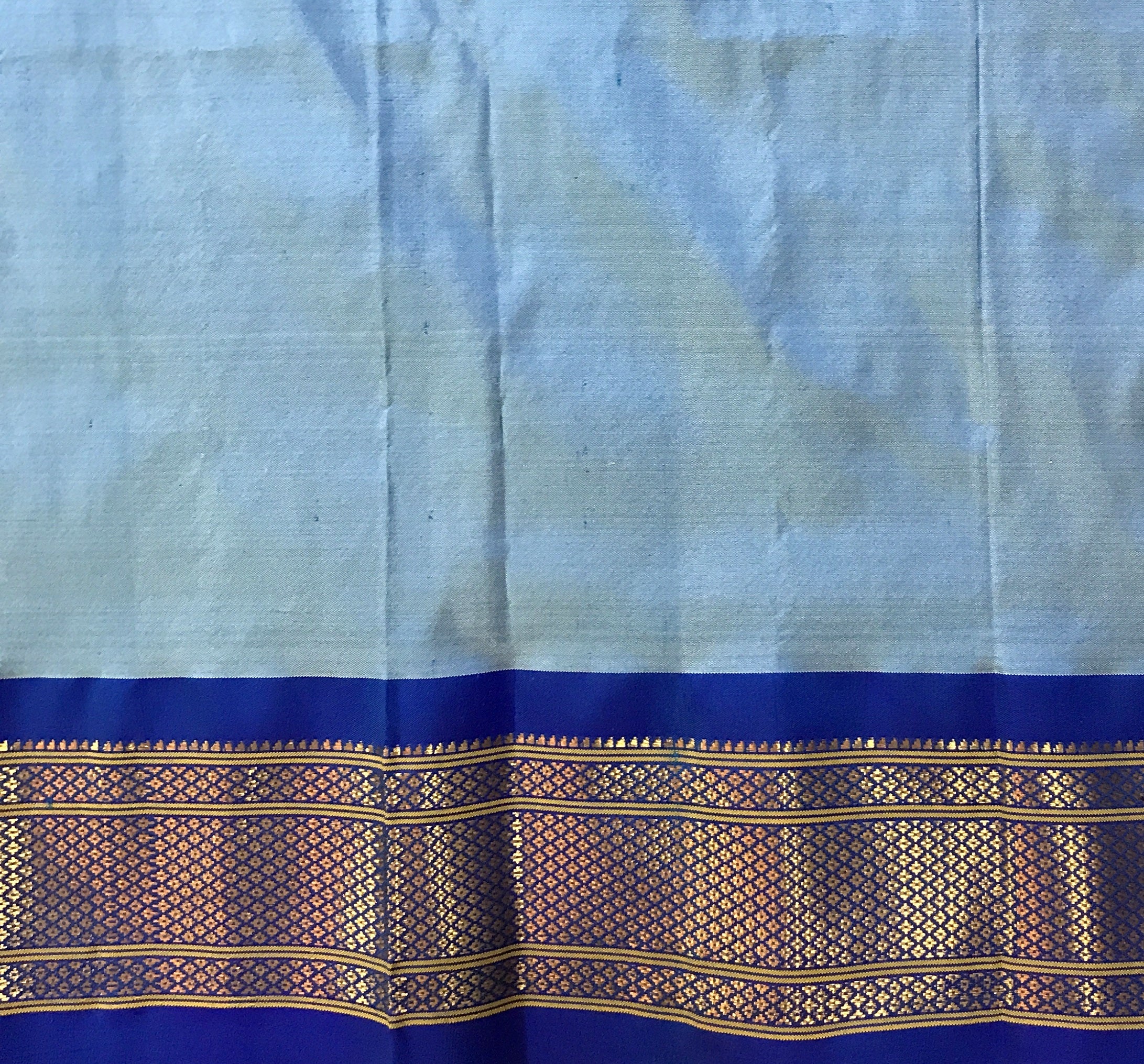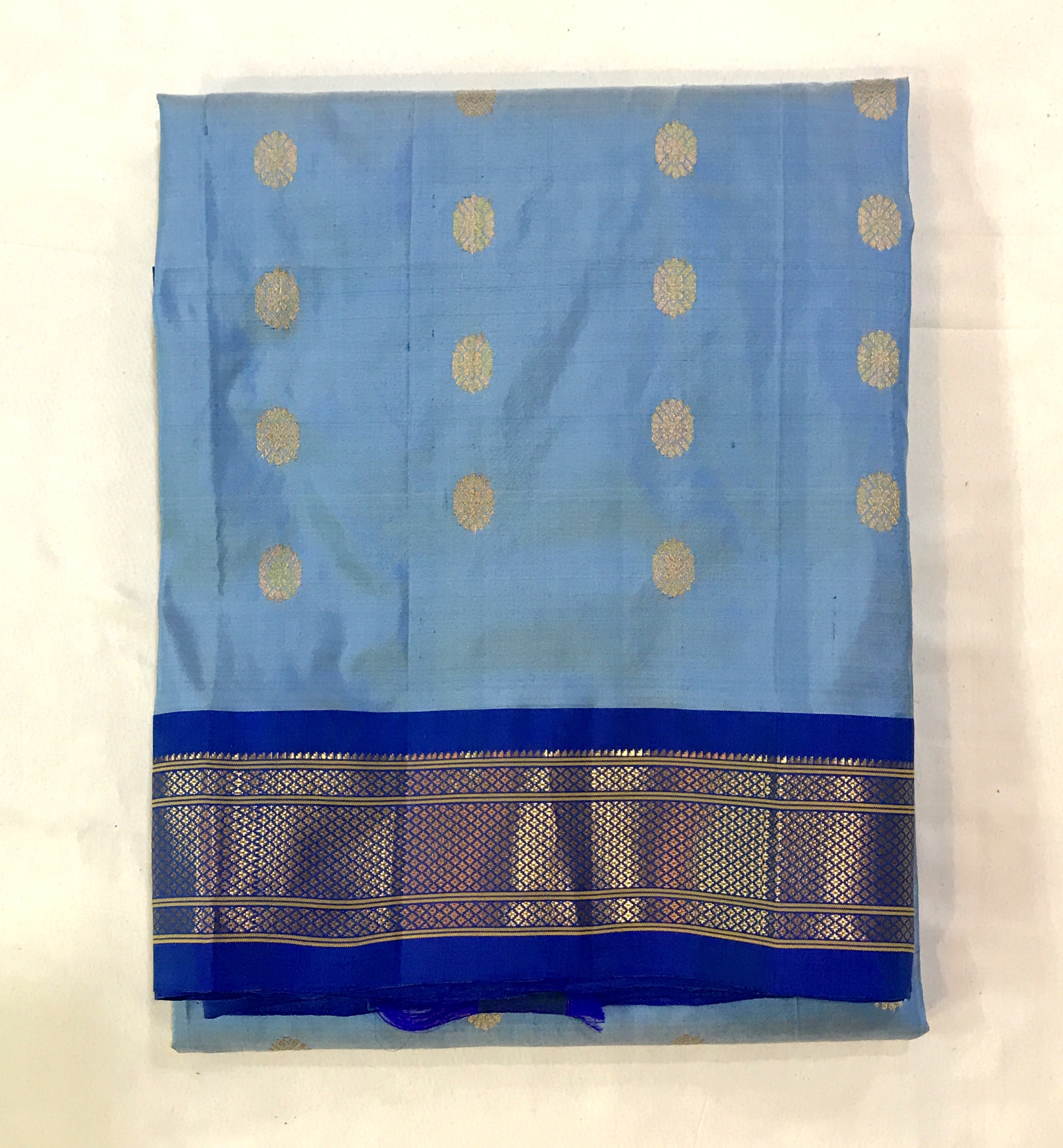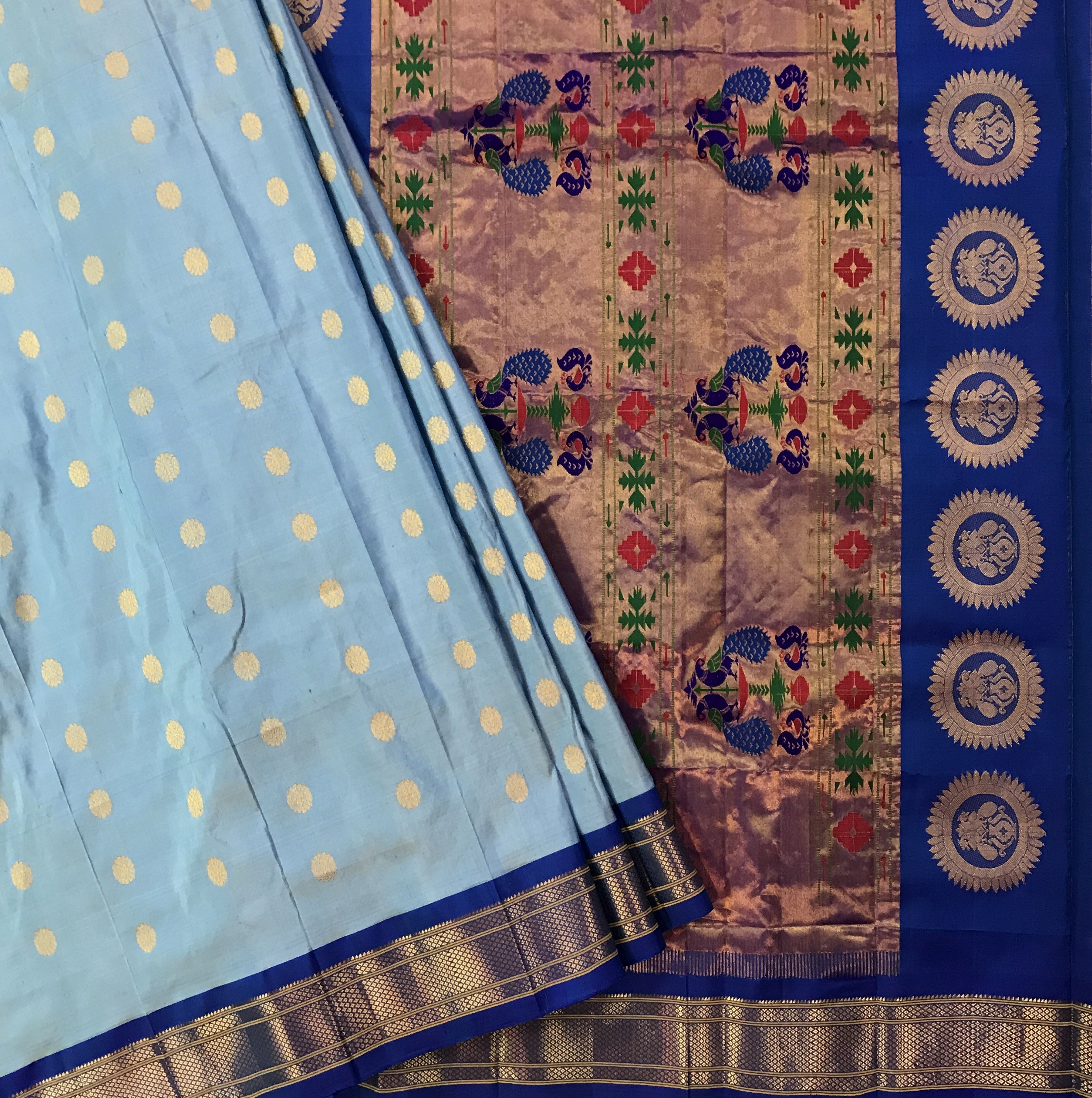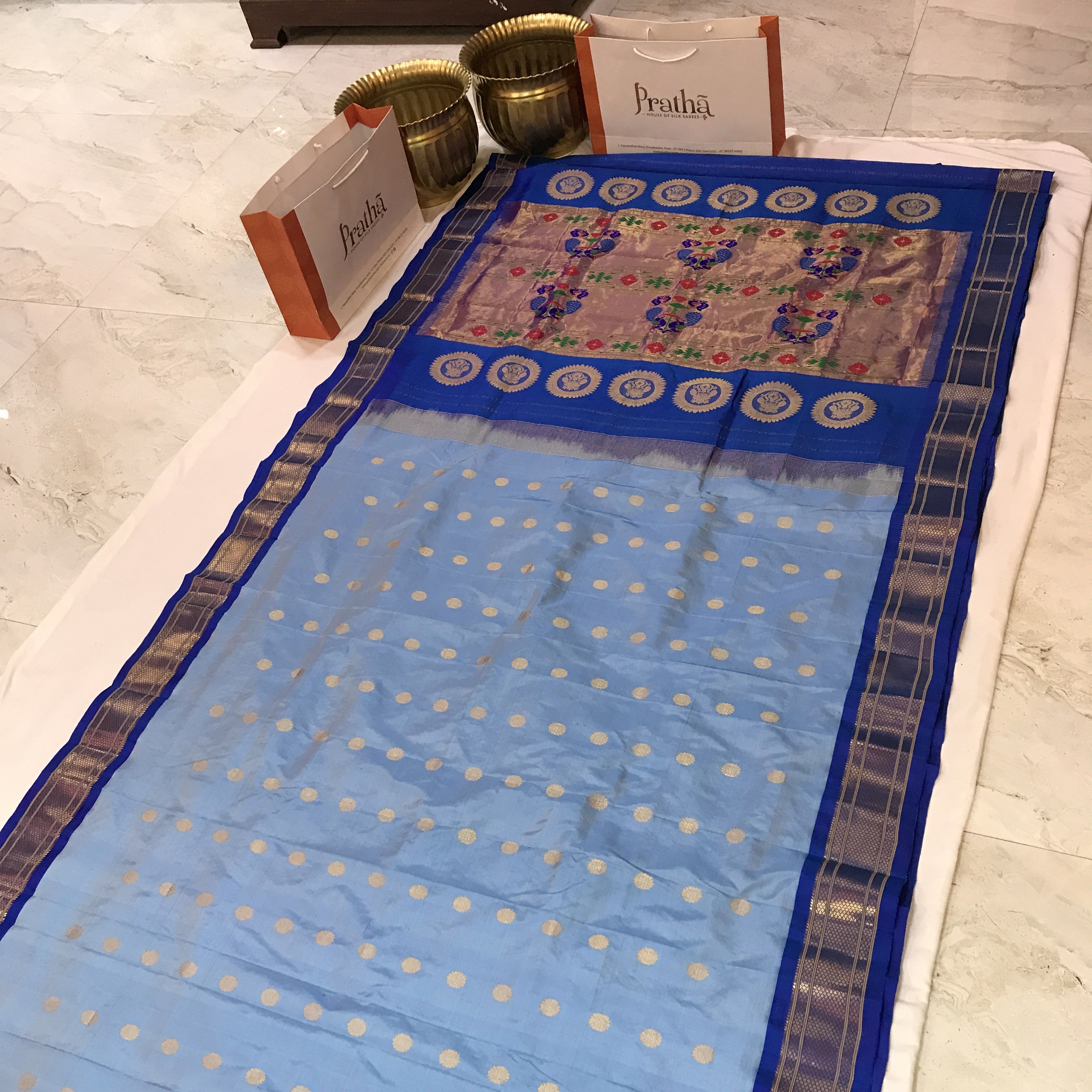 The phenomenal combination of blue Paithani with a very beautiful dark-blue border is Pratha's favorite. The delicate floral butti add the needed amount of grace which makes it perfect for any and every special occasion of yours!
