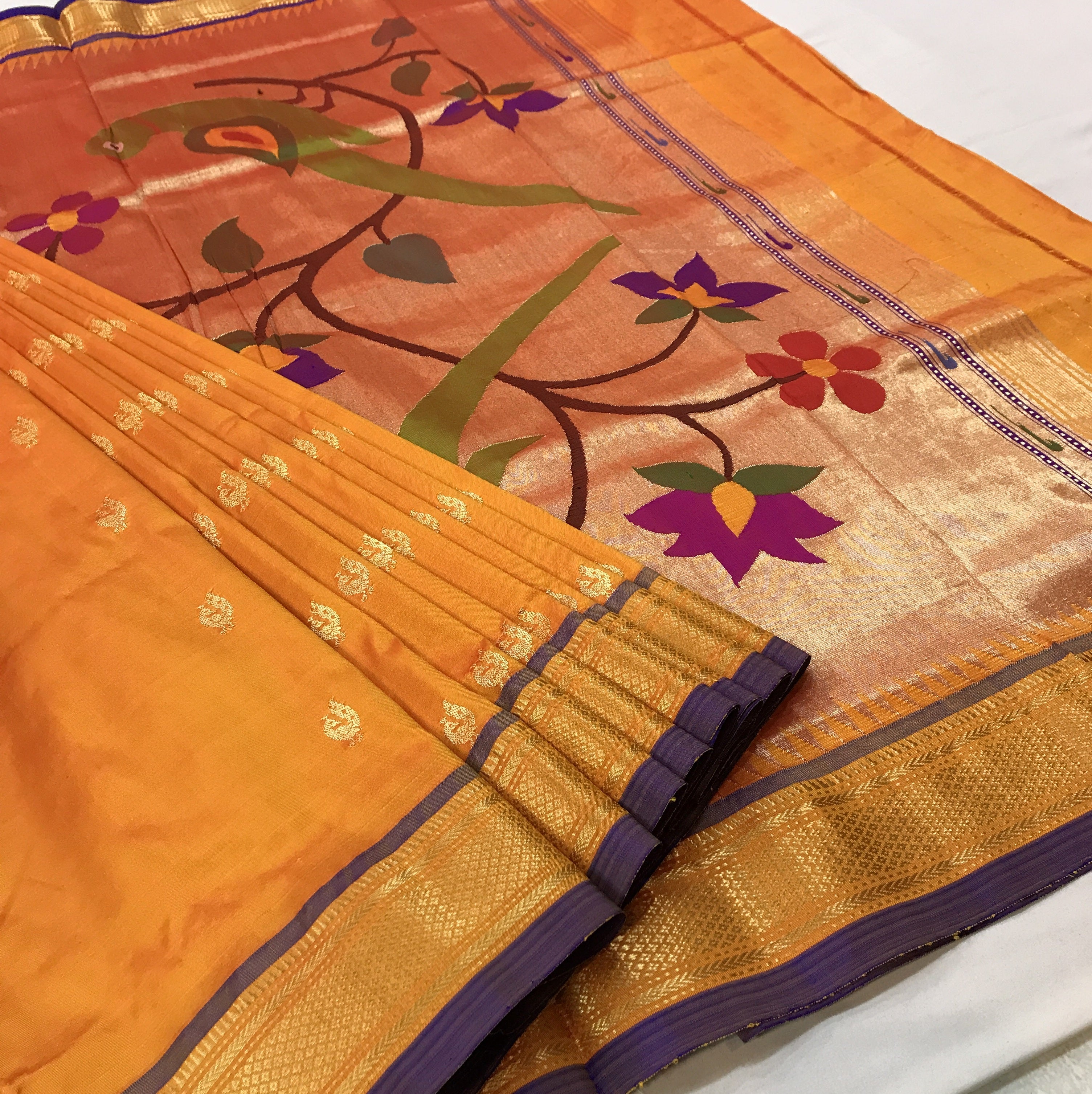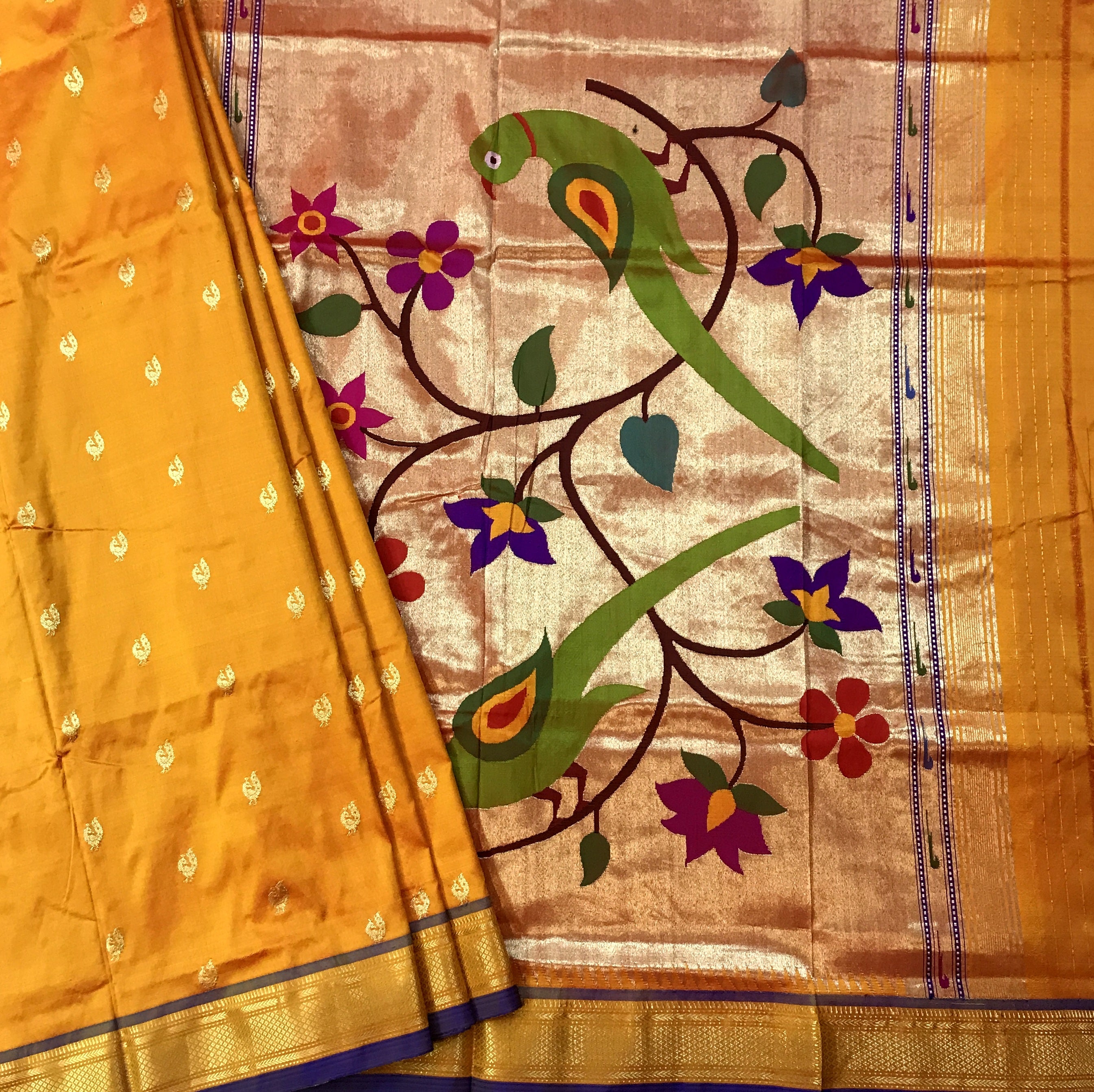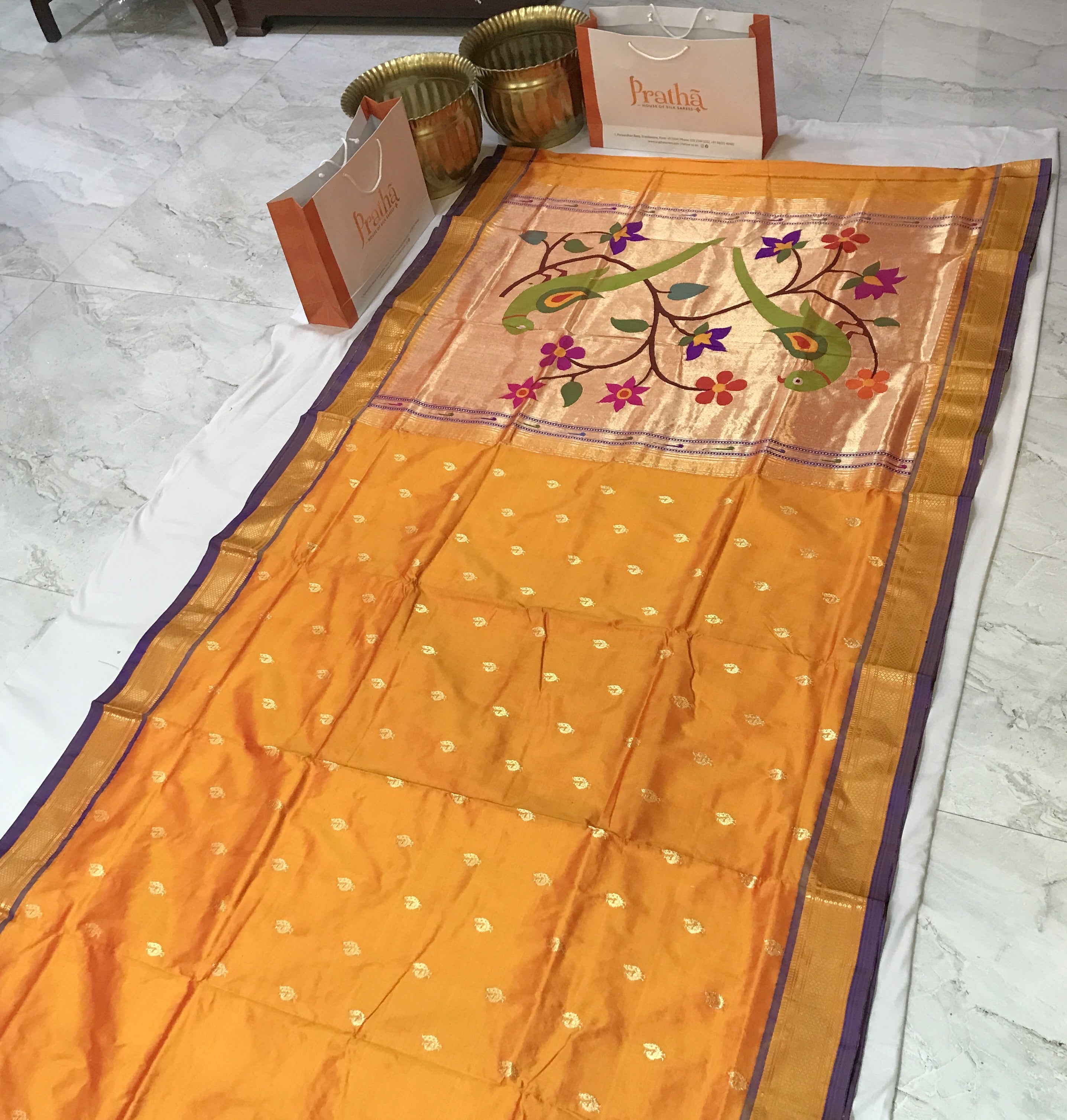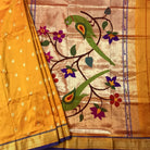 A very outstanding shade of mustard yellow with contrast coloured golden zari border in traditional Paithani. Do not miss the peacock butti highlighted in golden zari thread throughout this Paithani. The traditional tissue pallu with elaborate peacock motifs looks graceful. This is a perfect pick for those who are looking for a unique Paithani to add to their collection.