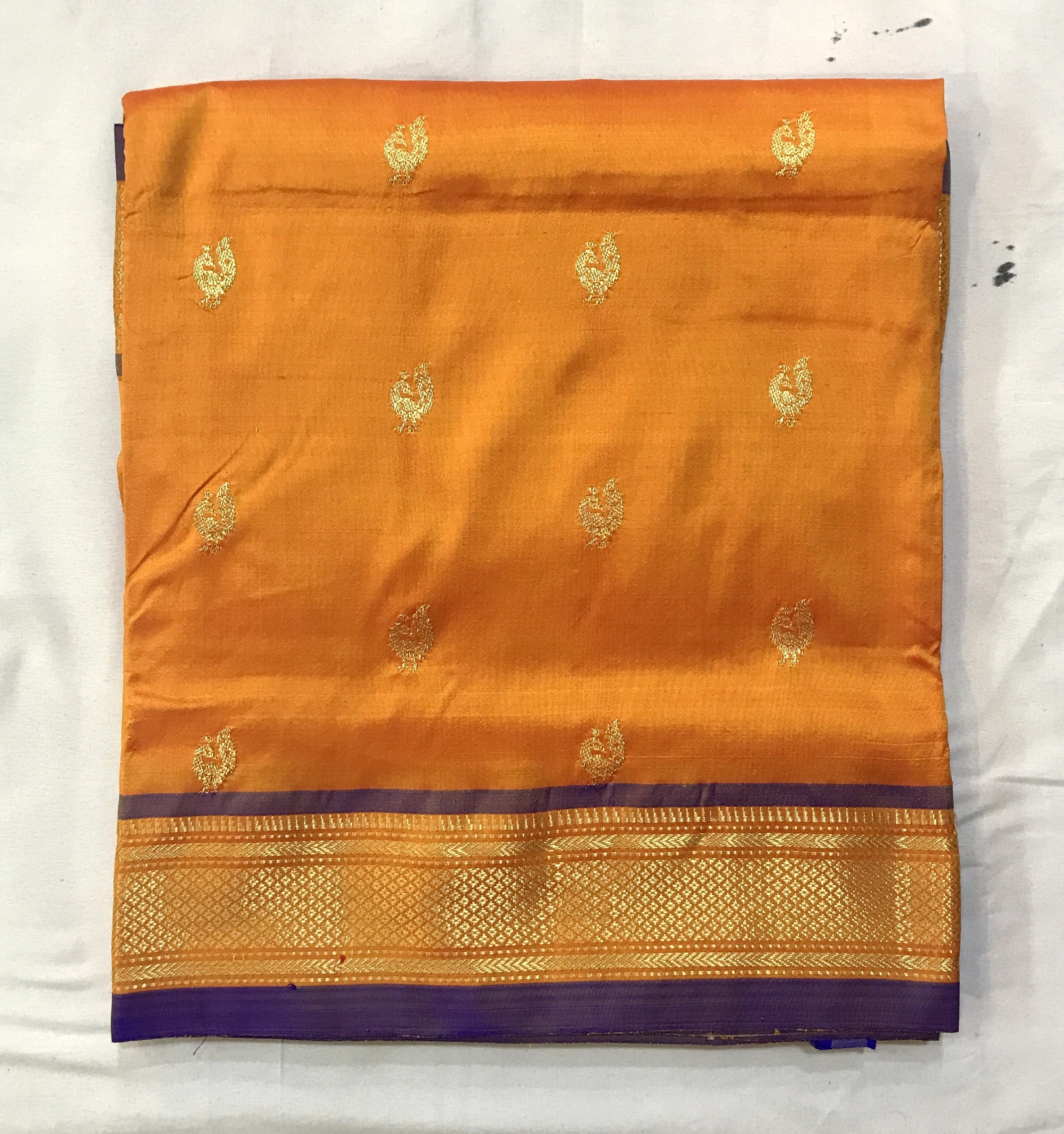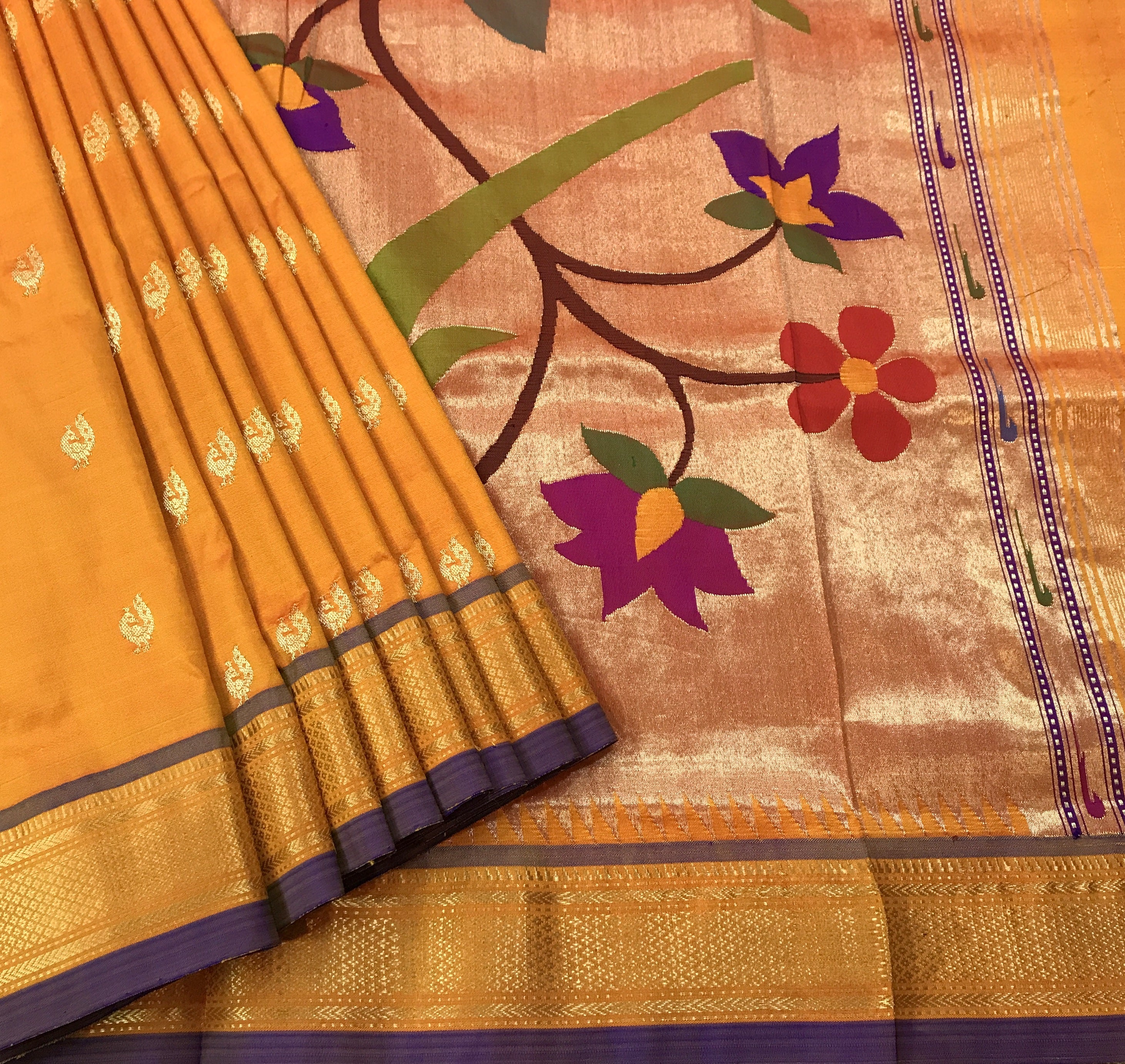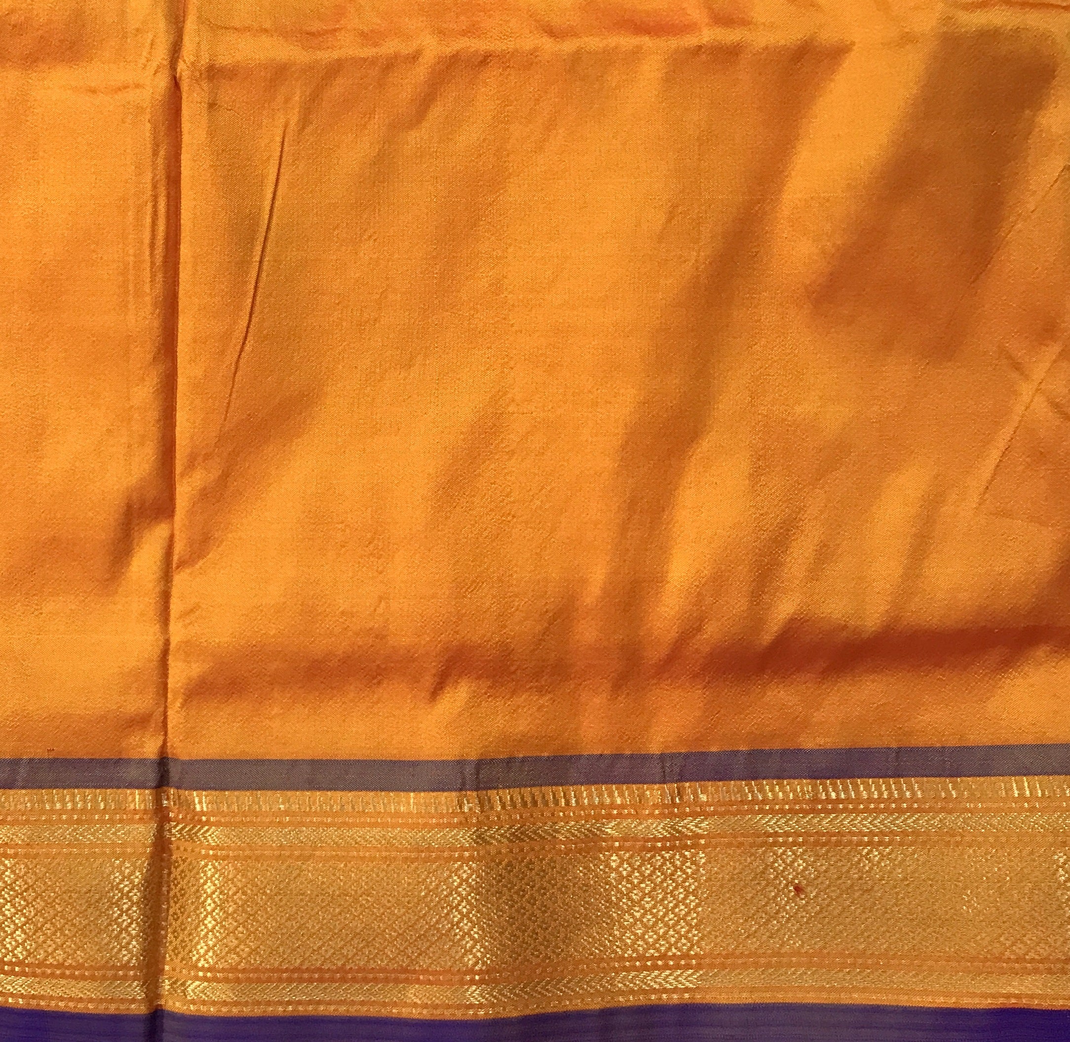 A very outstanding shade of mustard yellow with contrast coloured golden zari border in traditional Paithani. Do not miss the peacock butti highlighted in golden zari thread throughout this Paithani. The traditional tissue pallu with elaborate peacock motifs looks graceful. This is a perfect pick for those who are looking for a unique Paithani to add to their collection.