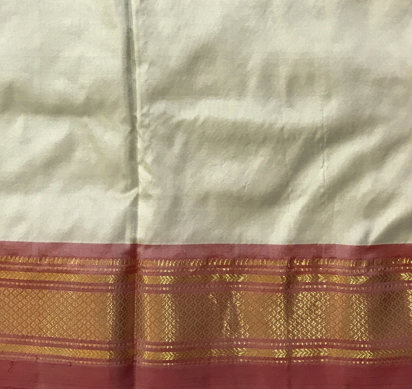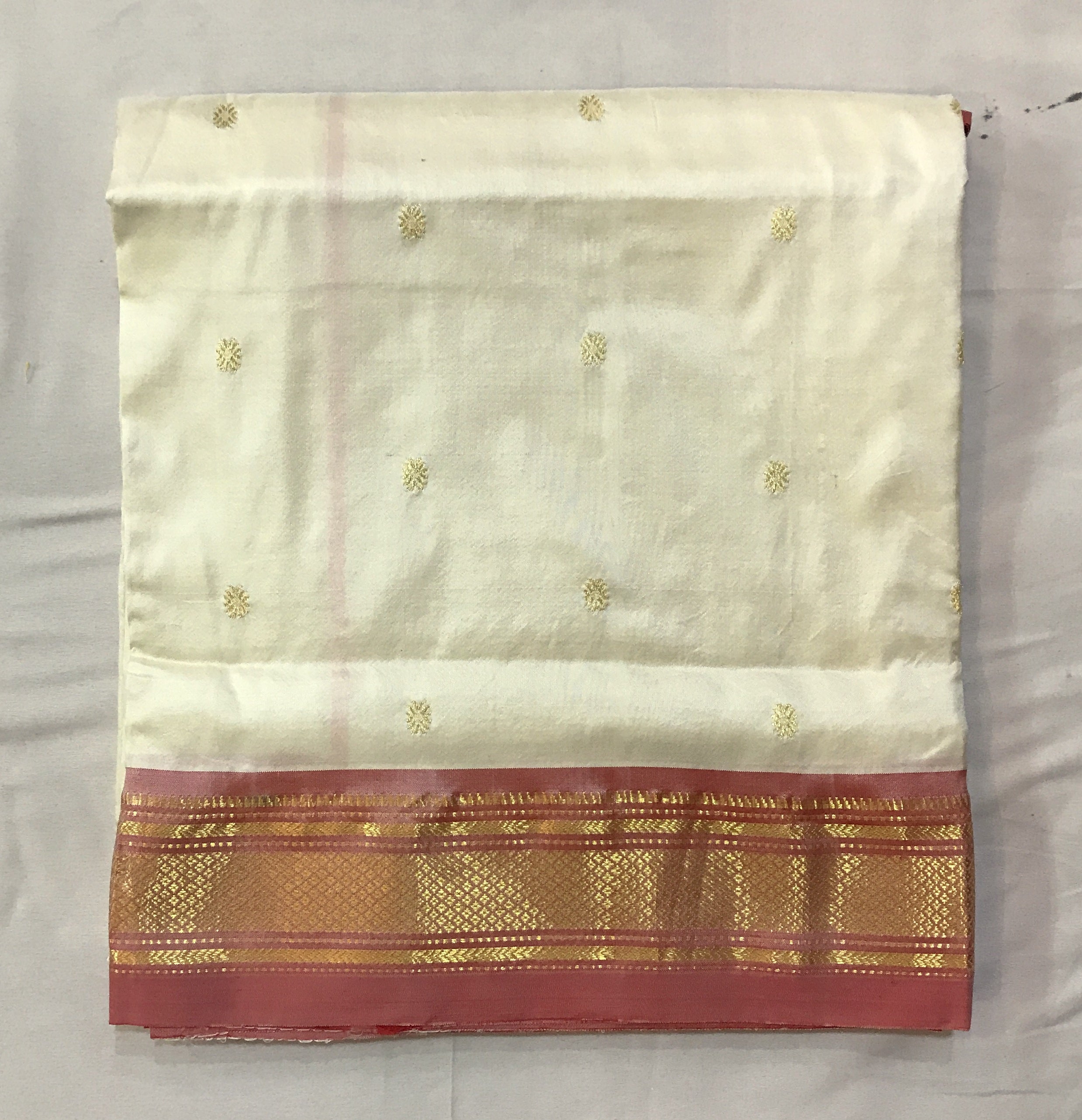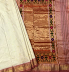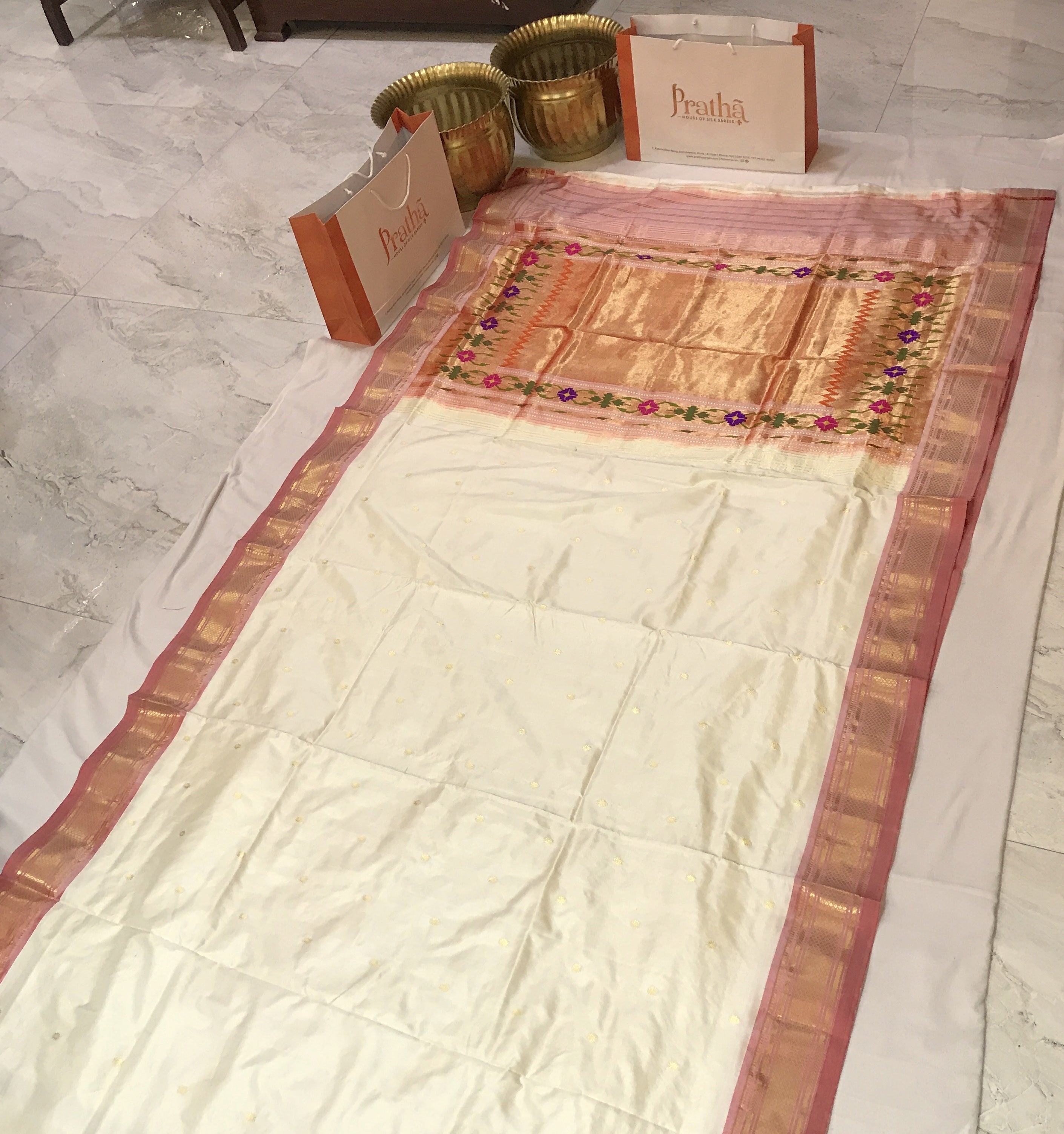 The phenomenal combination of White Paithani with a very beautiful peach border is Pratha's favorite. The delicate flower butti add the needed amount of grace which makes it perfect for any and every special occasion of yours!