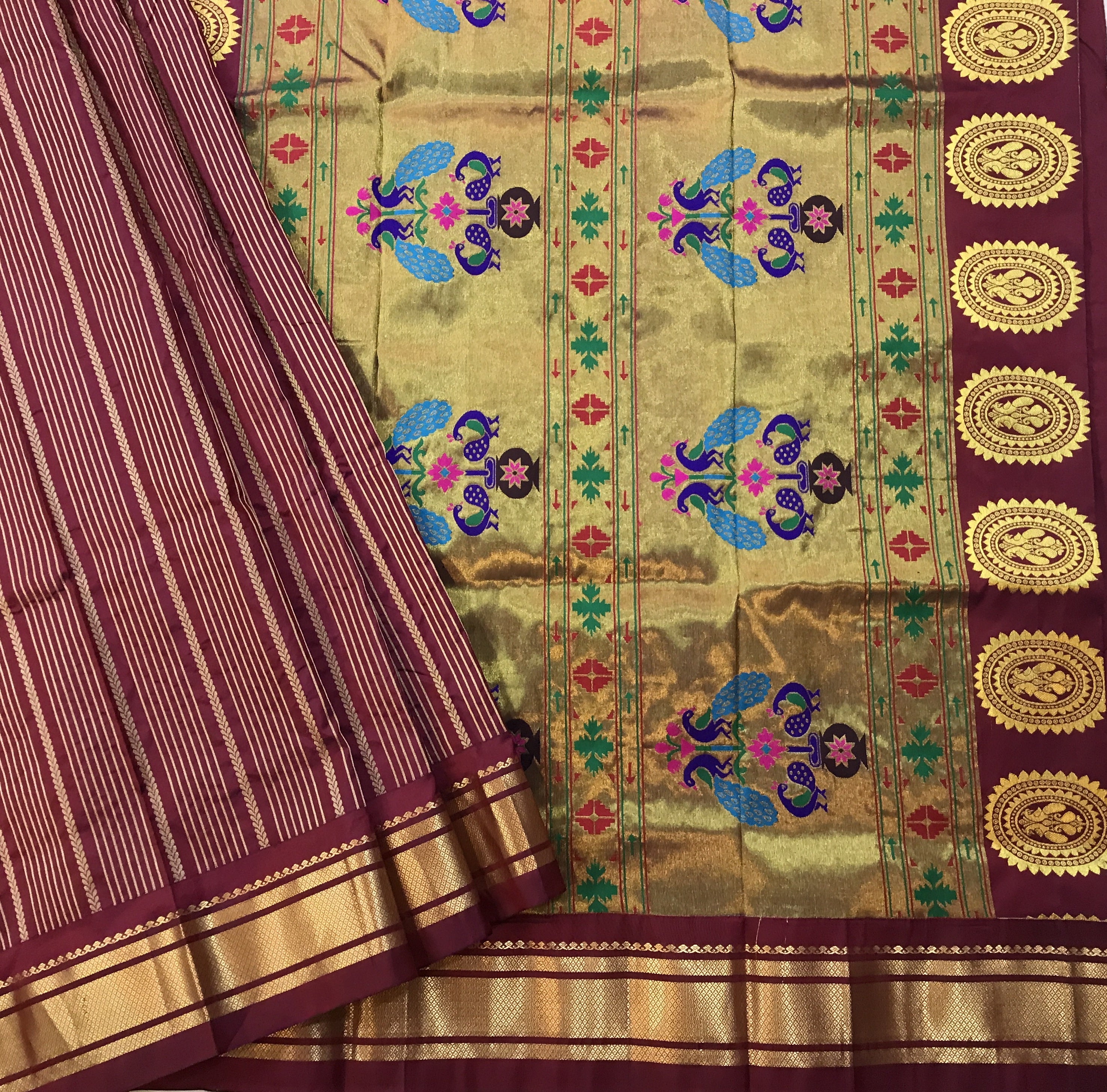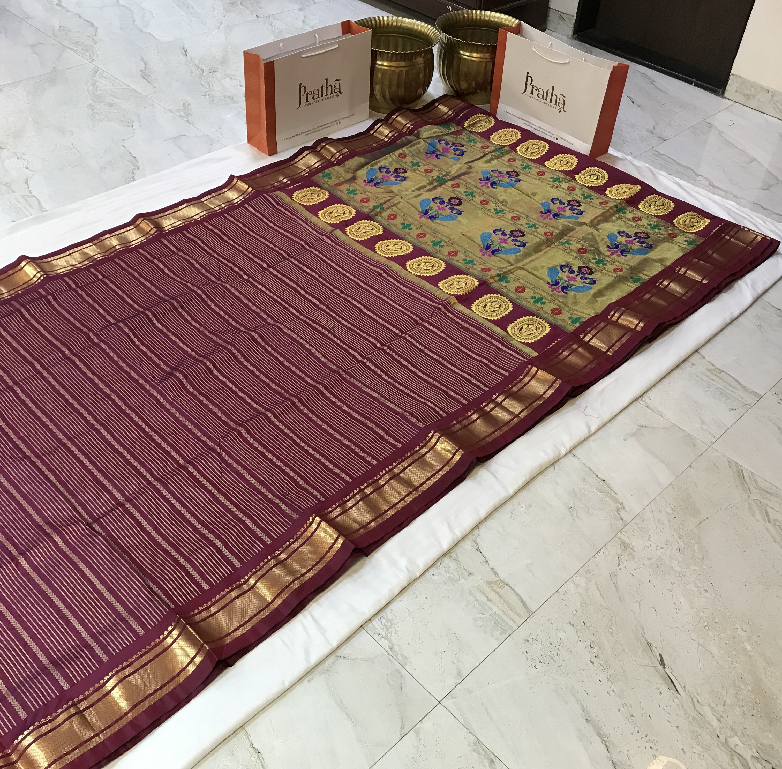 A beautiful shade of deep maroon Paithani with a traditional, this one is perfect for your special occasions. The delicate zari lines and the very elegant multicolored peacock (motifs) design on pallu add grace to this festive saree. The self colour blouse piece is also unique considering the traditional Paithani weaving style. This Paithaini is one of Pratha's favorites .