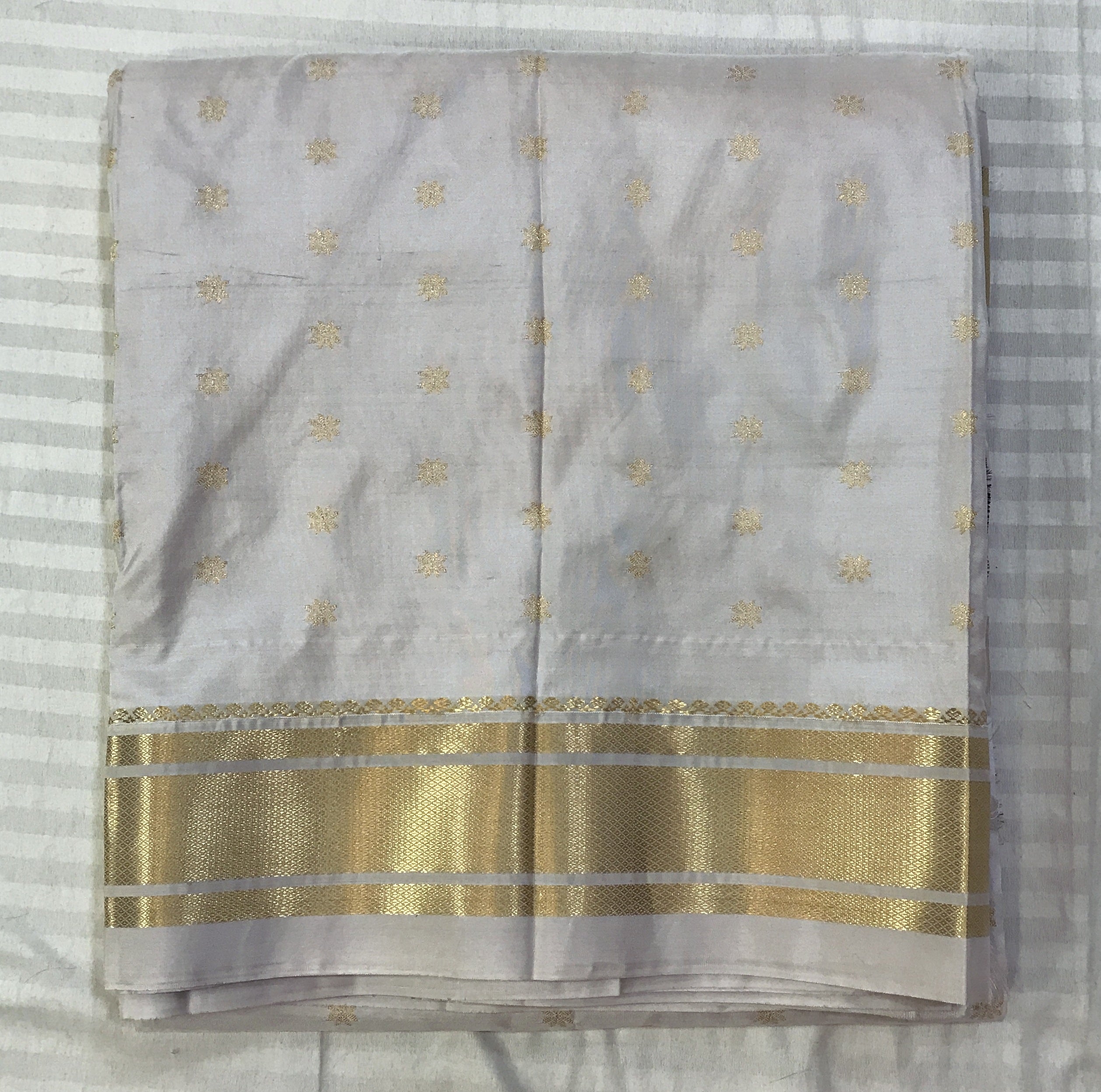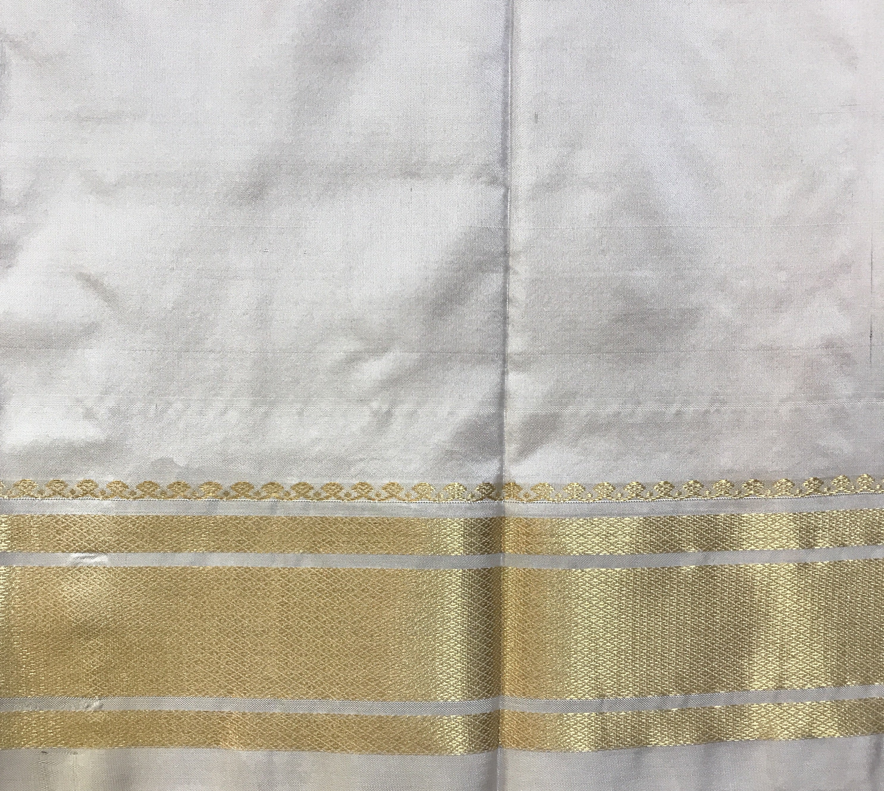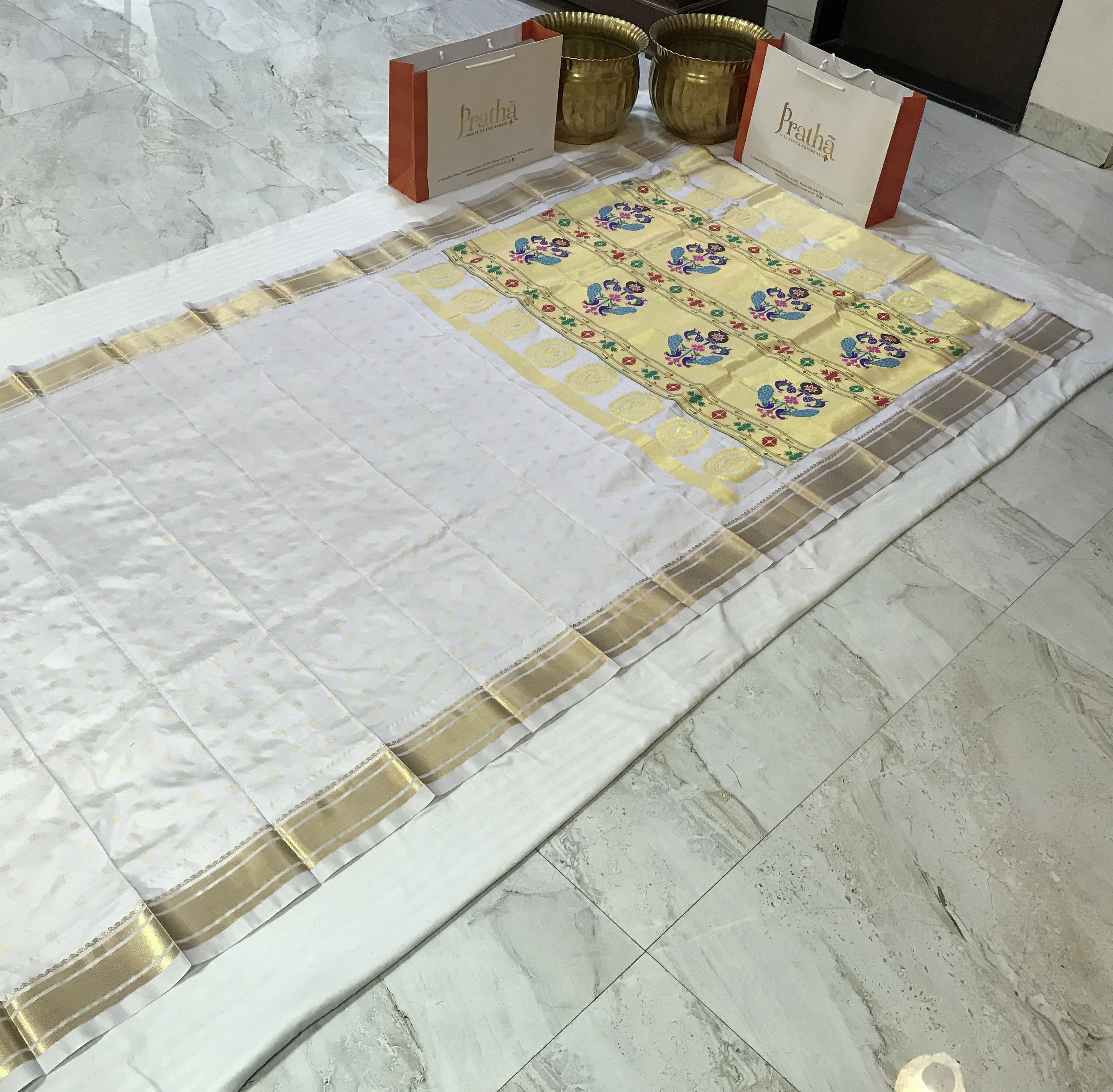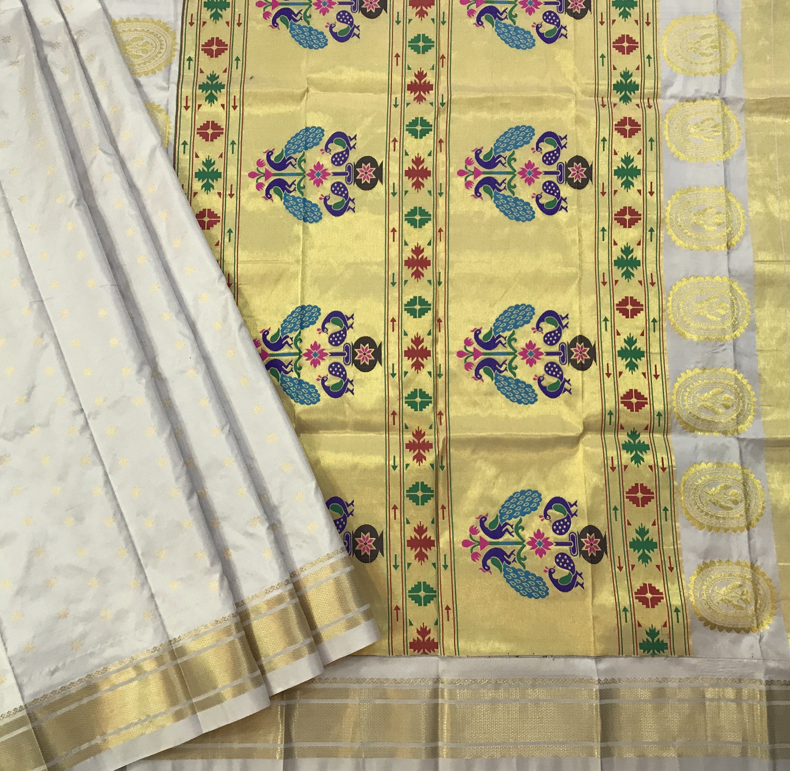A very gorgeous rotating shade of off-white golden Paithani with a border creates great drama with the high contrasting levels. The traditional border and delicate golden-floral butti and classic tissue pallu add an elegance in the contrast. This vibrant Paithani is perfect for weddings and any other festive occasions!