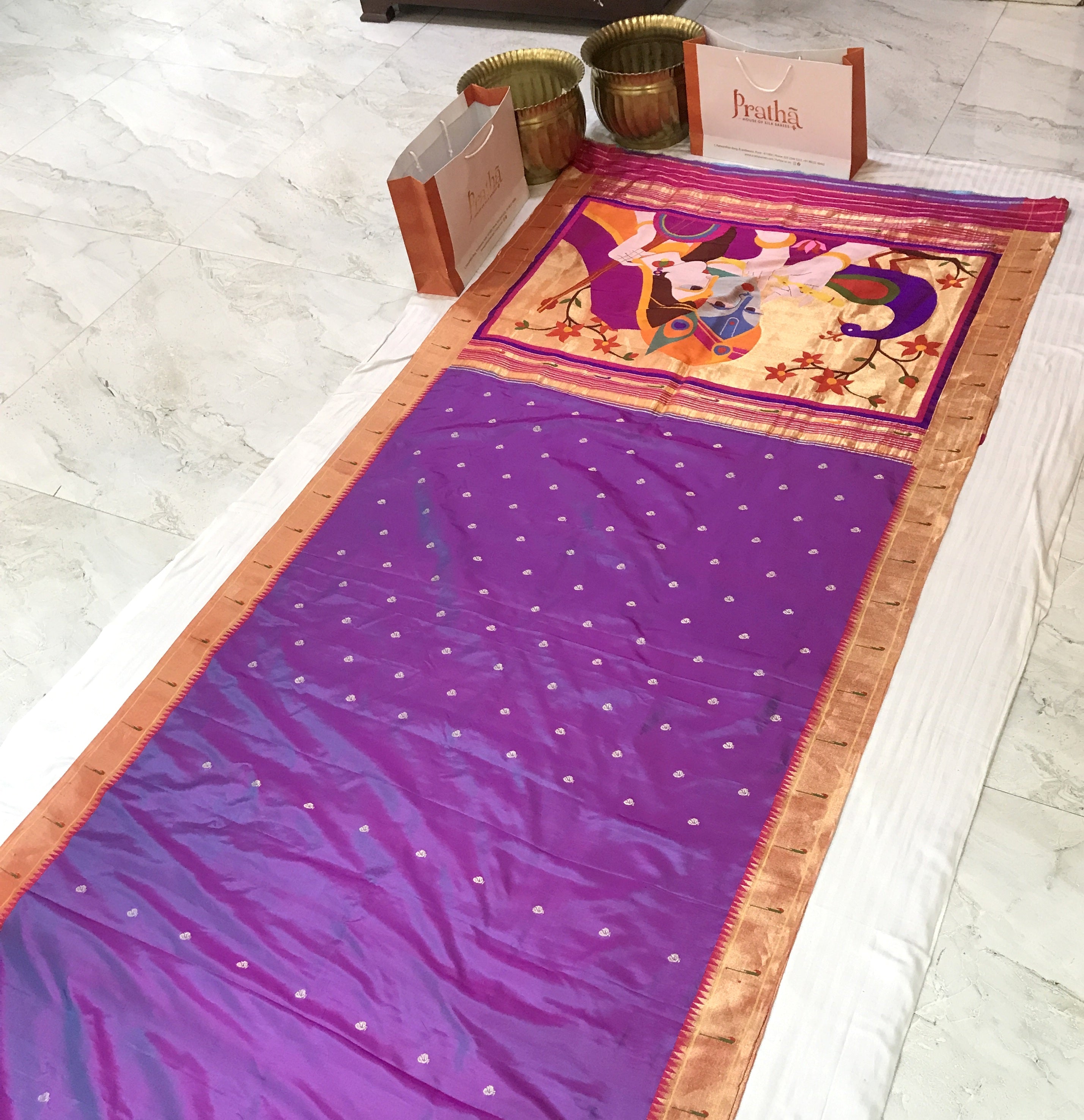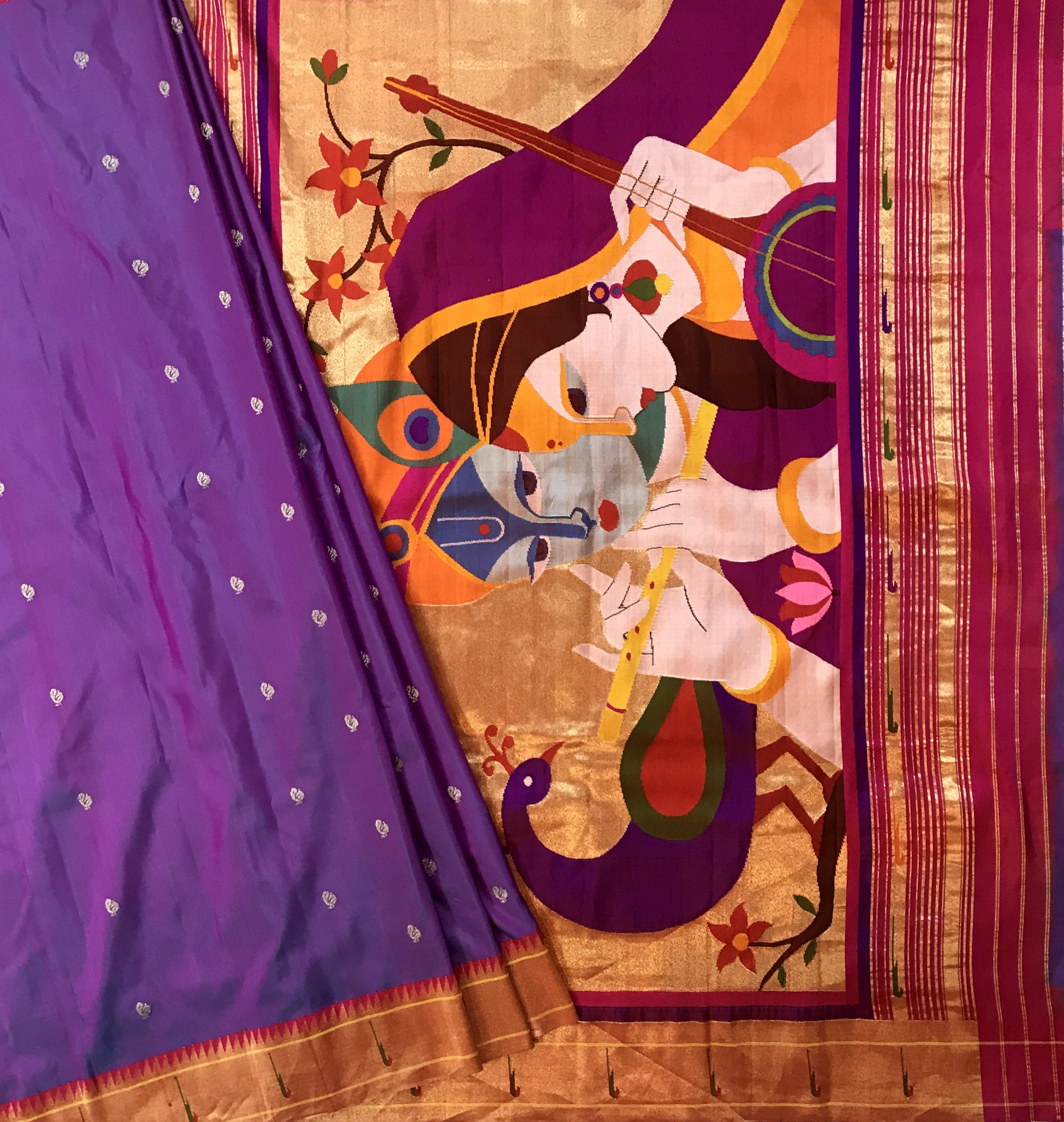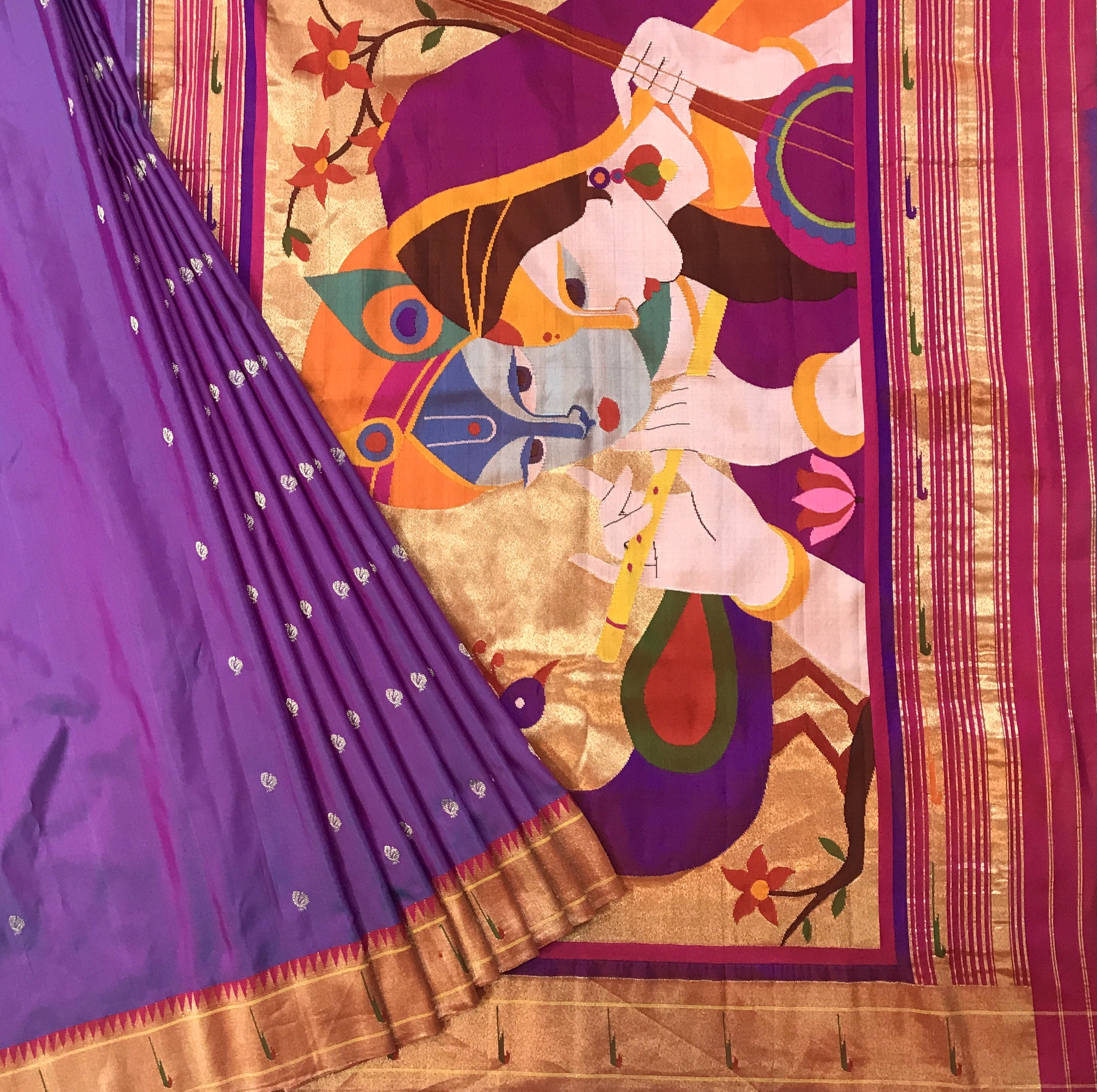 This saree is an exquisite tribute to divine art and vibrant tradition! The rich purple body, adorned with delicate silver buttis, drapes with a graceful glow. The highlight, however, is the breathtaking pallu, featuring an artistic portrayal of Radha and Krishna in vivid, expressive colours. Their serene expressions, the flute, and the surrounding floral motifs create a mesmerising visual that turns the saree into a canvas of devotion and elegance. The golden zari base enhances the artwork beautifully, while the pink-purple striped muniya border adds a refined finishing touch. This saree is a perfect pick for those who love wearing timeless weaves with a soulful story.