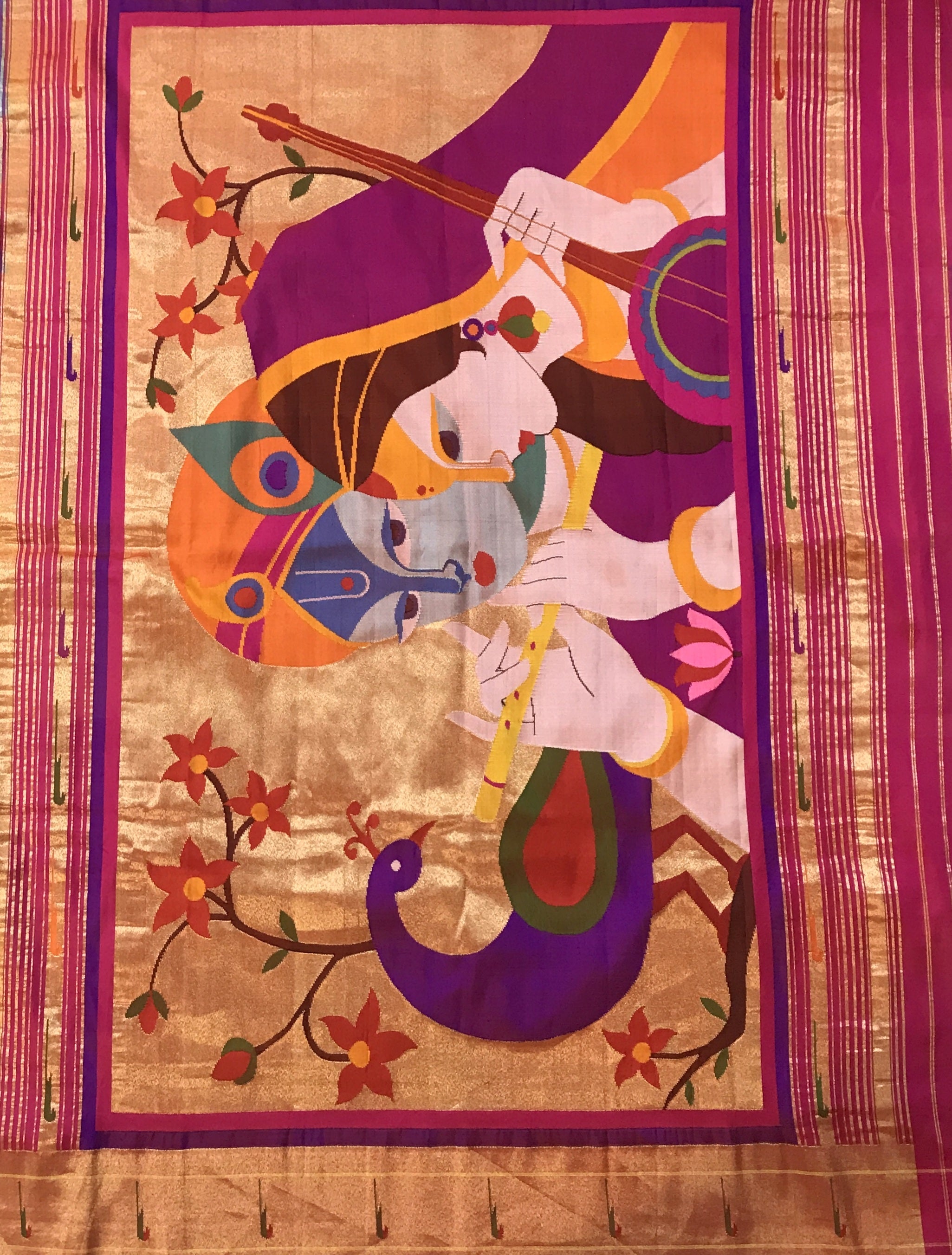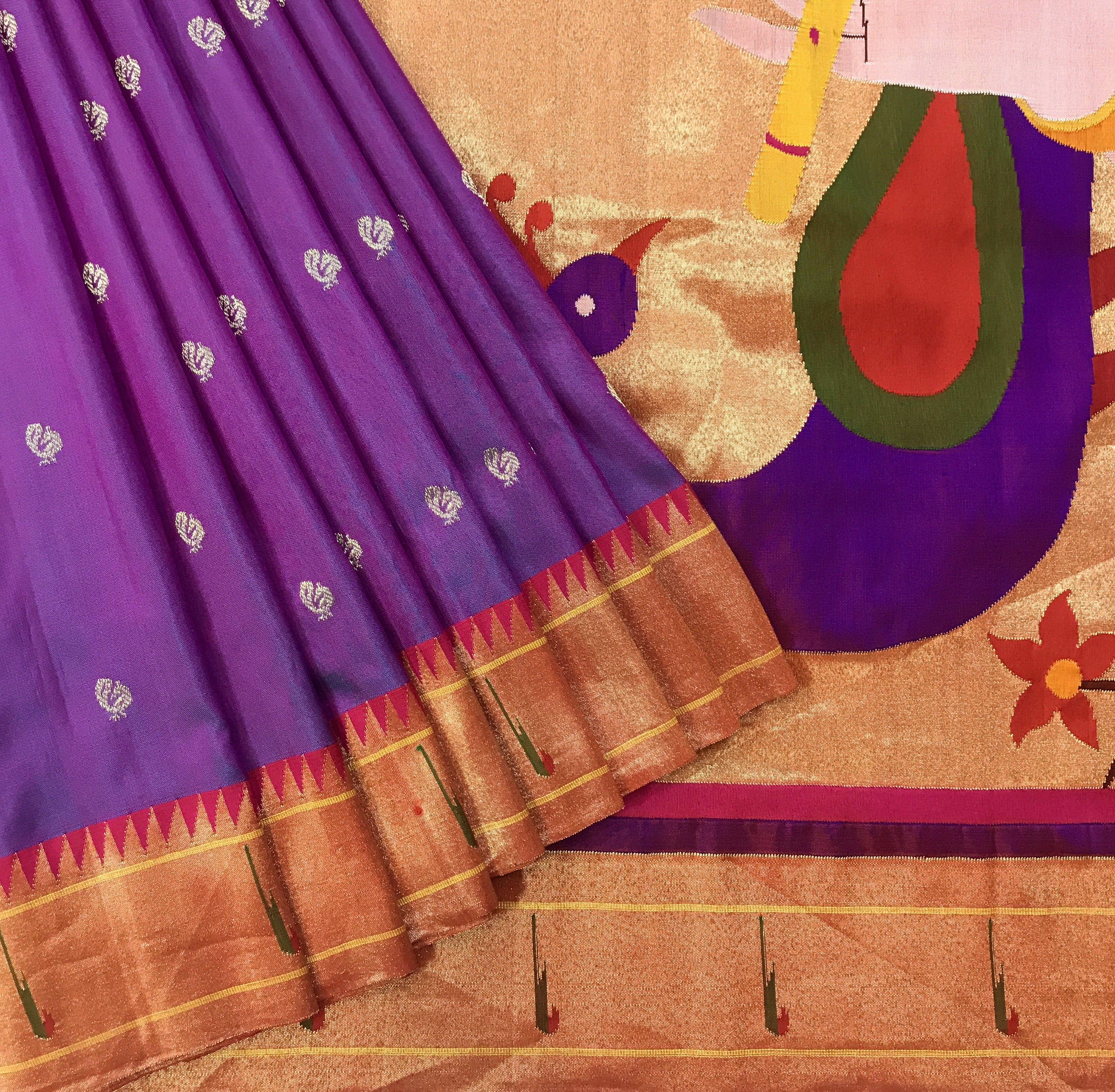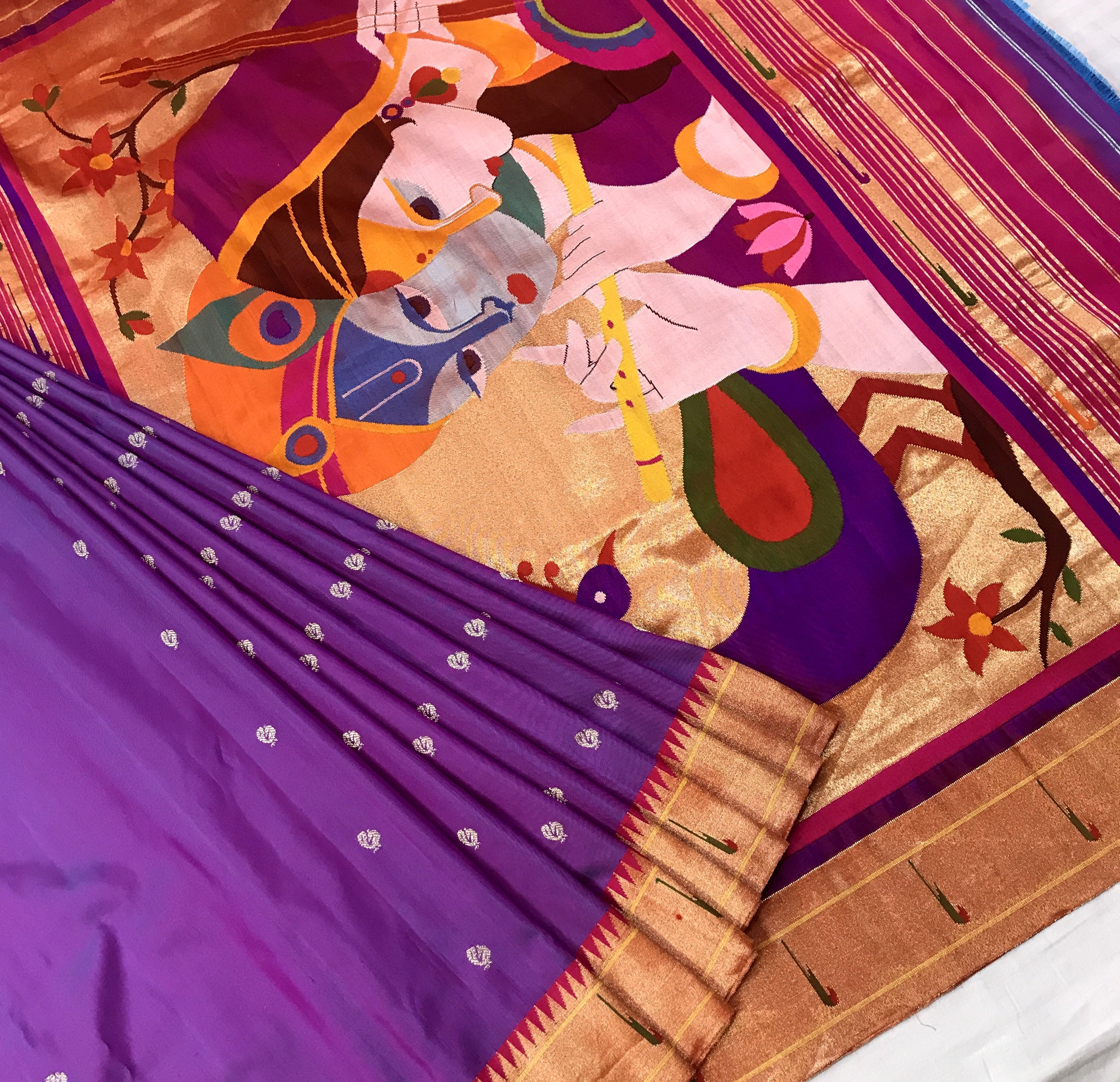 This saree is an exquisite tribute to divine art and vibrant tradition! The rich purple body, adorned with delicate silver buttis, drapes with a graceful glow. The highlight, however, is the breathtaking pallu, featuring an artistic portrayal of Radha and Krishna in vivid, expressive colours. Their serene expressions, the flute, and the surrounding floral motifs create a mesmerising visual that turns the saree into a canvas of devotion and elegance. The golden zari base enhances the artwork beautifully, while the pink-purple striped muniya border adds a refined finishing touch. This saree is a perfect pick for those who love wearing timeless weaves with a soulful story.