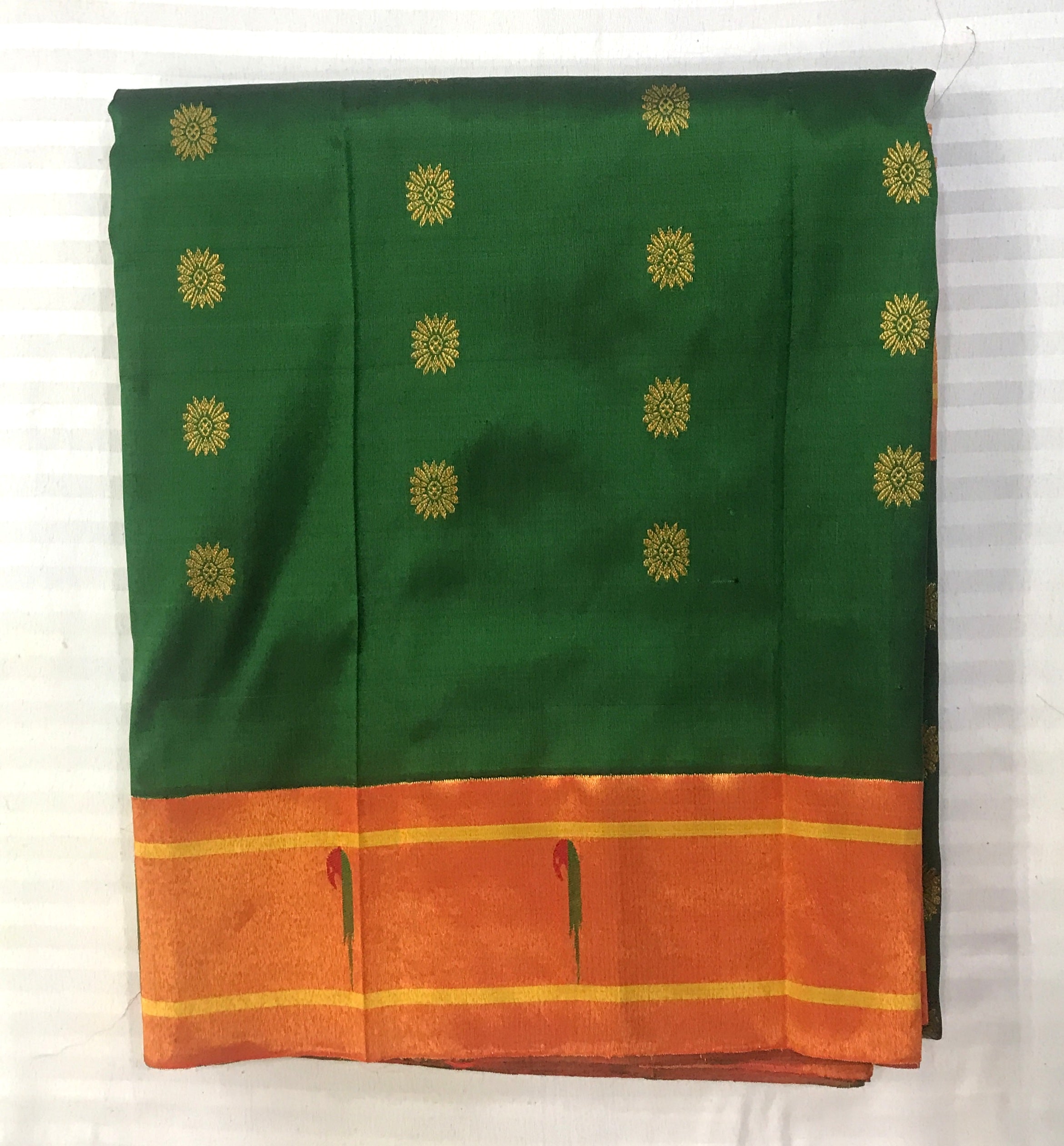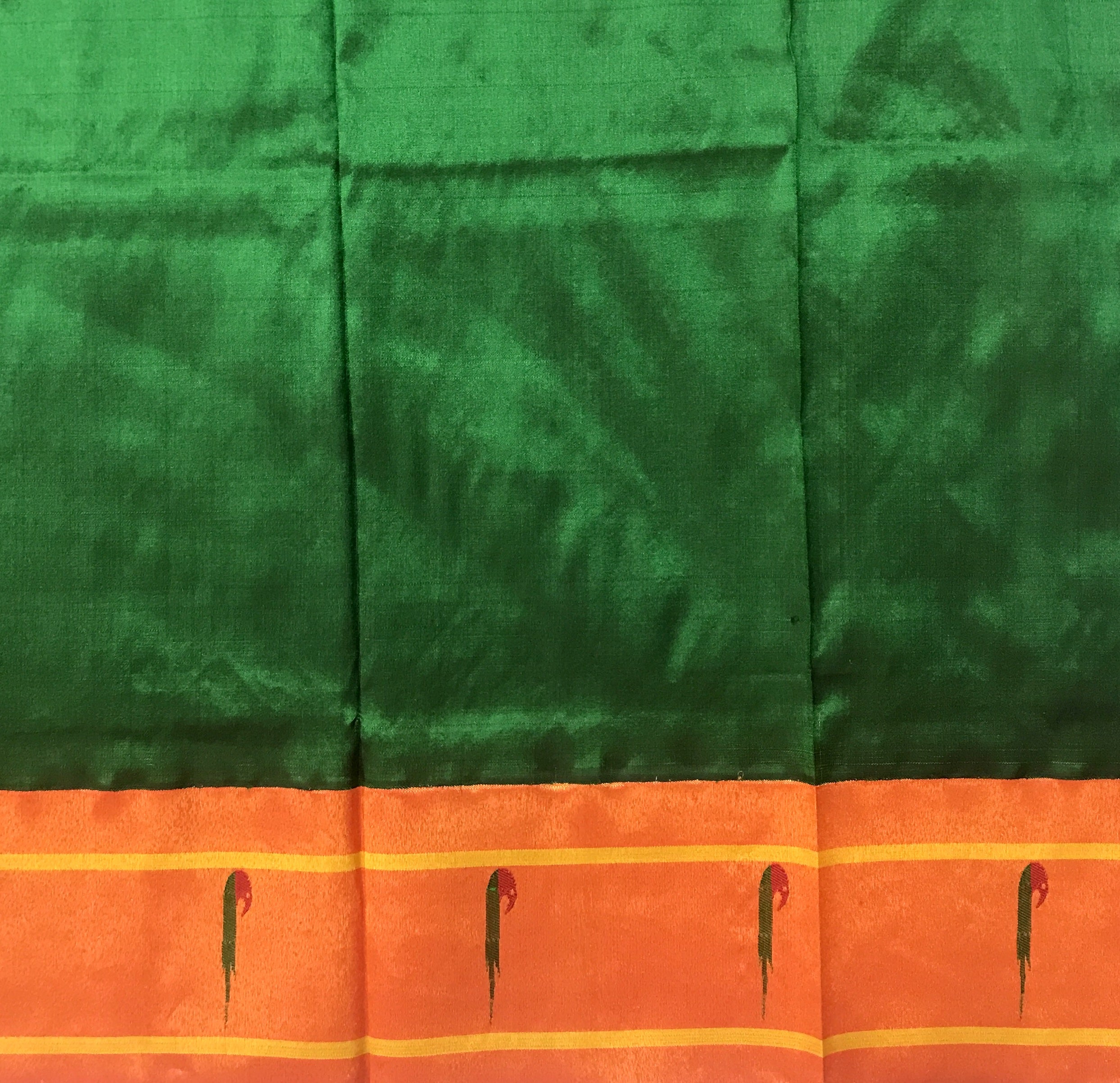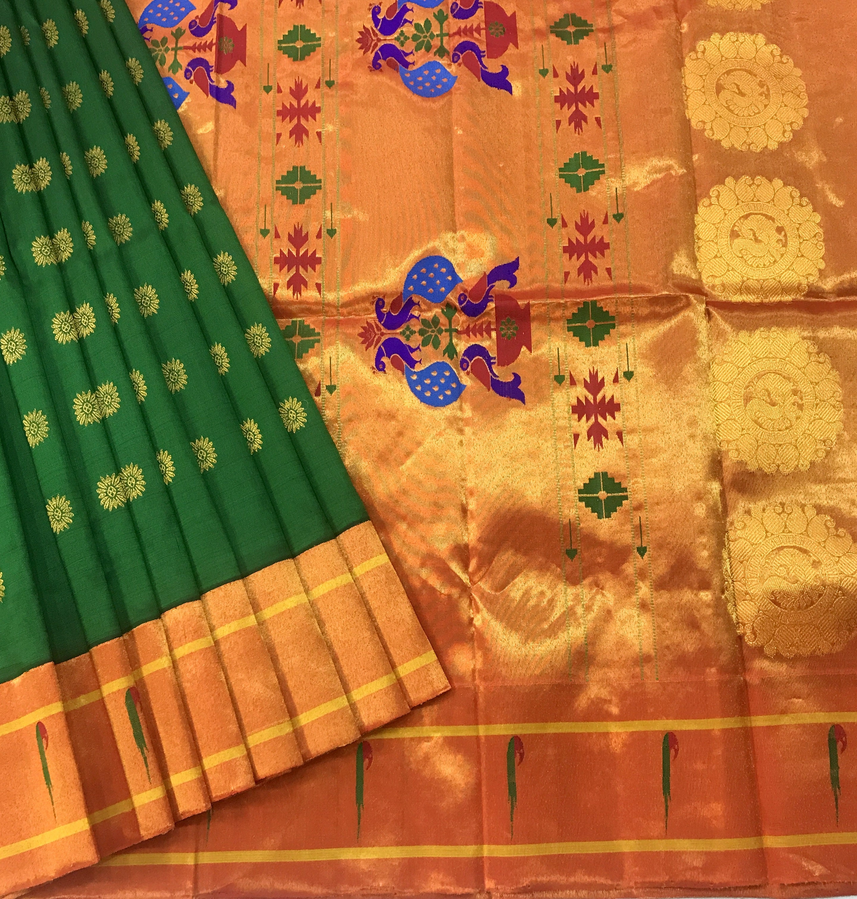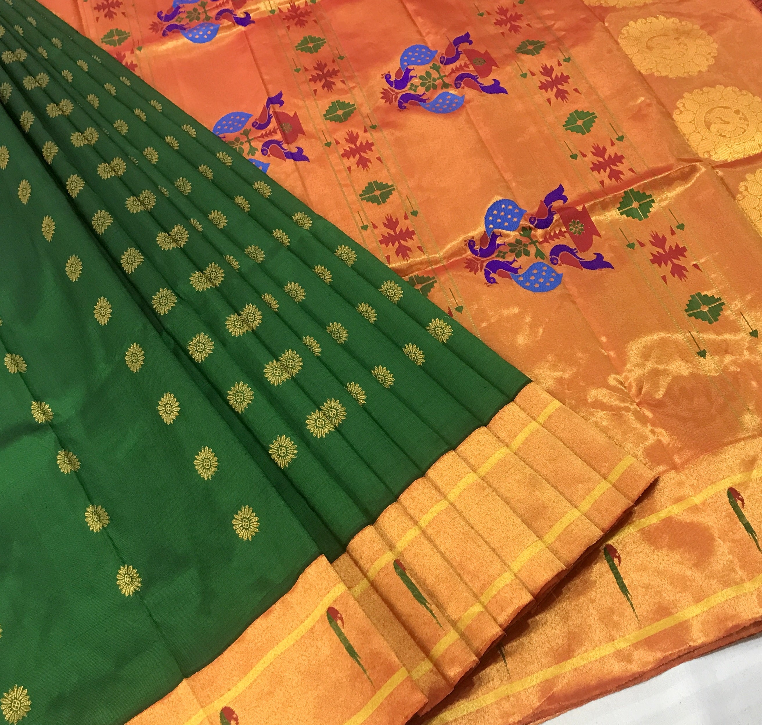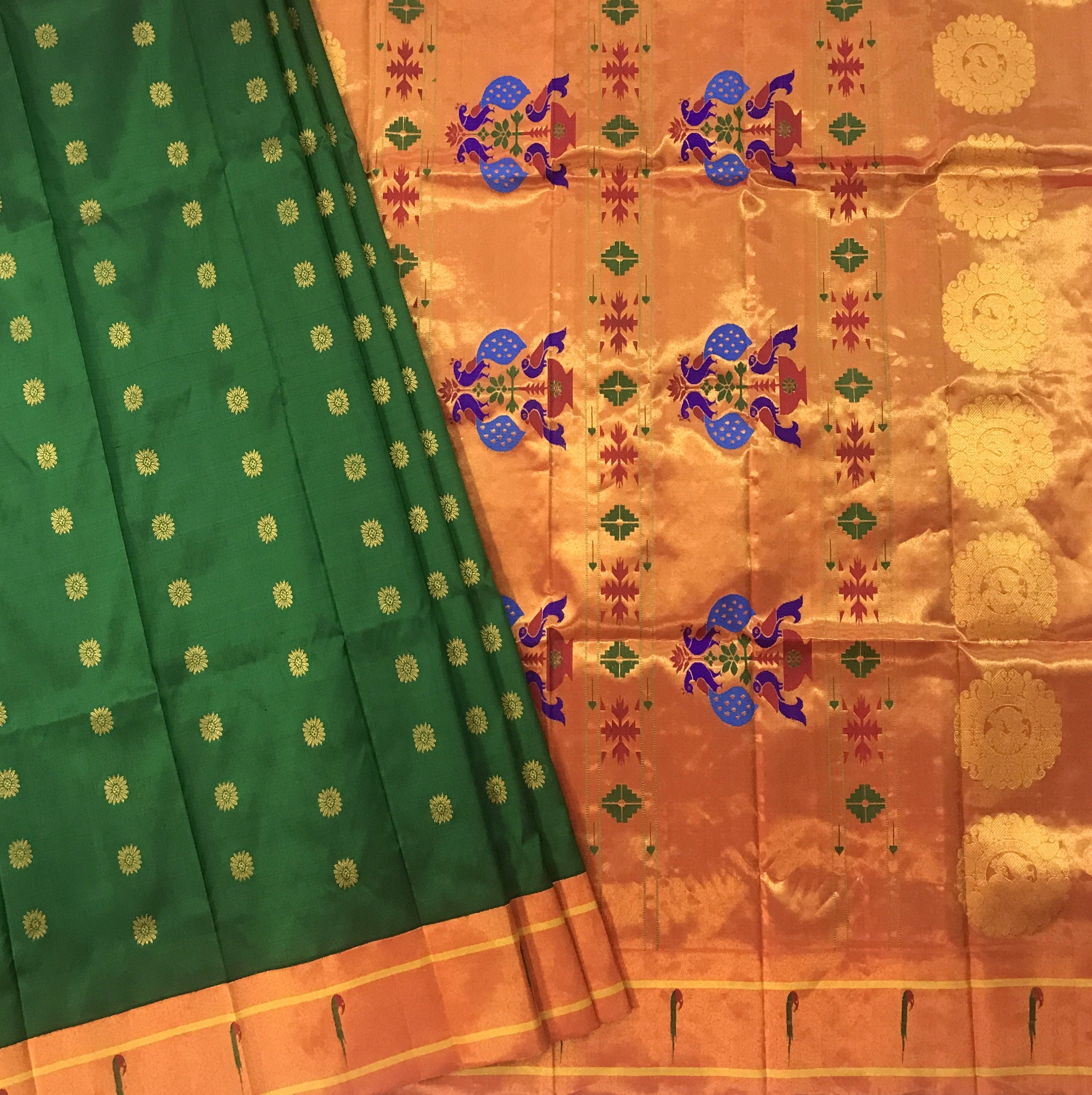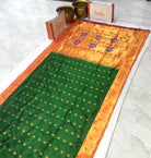 This Royal Paithani is the epitome of elegance, weaved with care and love for special days. The intricate weaving, the delicate maharani butti and the clean workmanship brings magic and soul to this Green Paithani. The muniya zari border with beautiful floral and peacock motifs running through it, makes this Signature Paithani an unique weave.