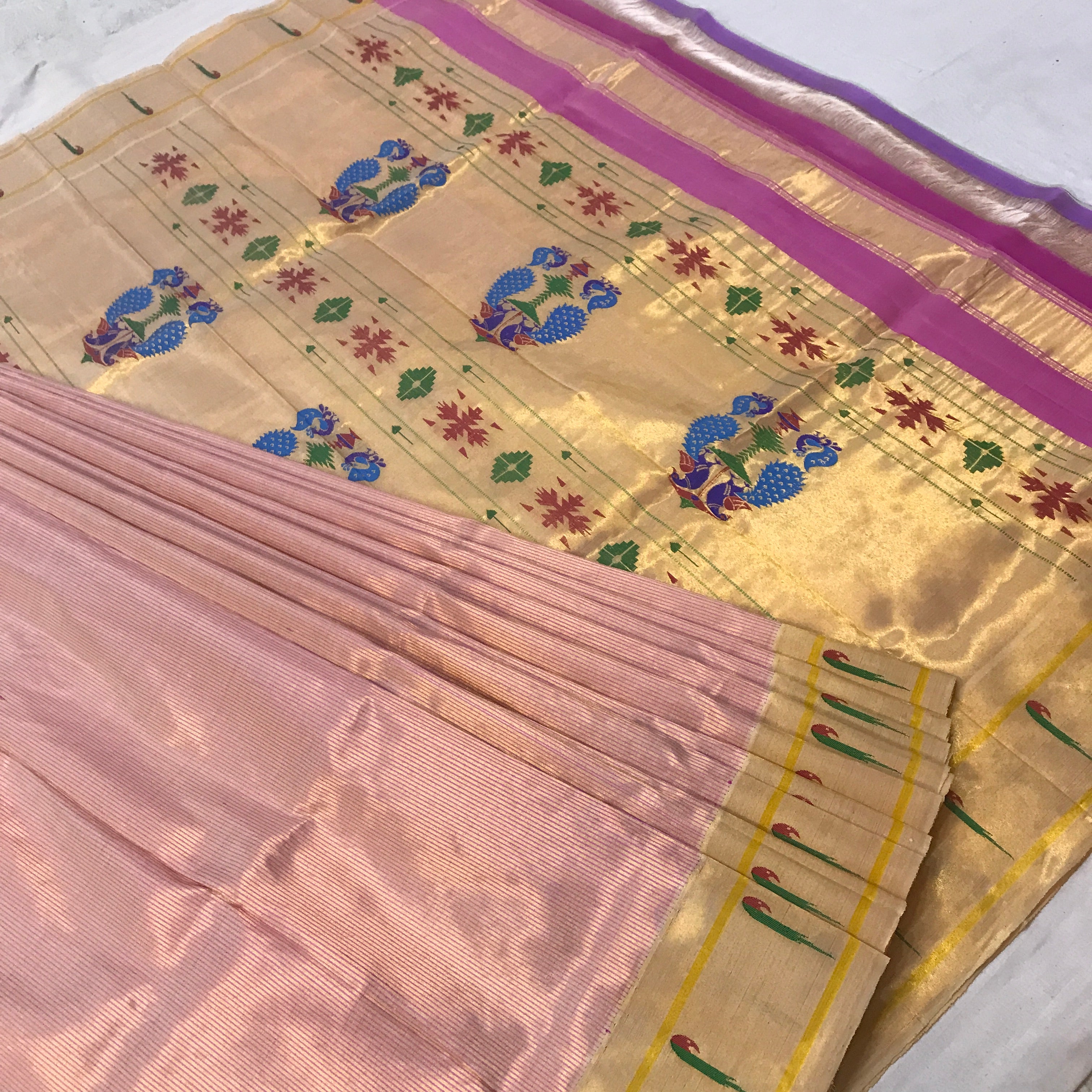 This vibrant Peach Paithani saree features a lustrous soft silk base that radiates a fresh and festive glow. The smooth, self-striped body is elegantly contrasted by a traditional pallu showcasing intricate Peacock motifs nestled among vertical floral and geometric vines in striking shades of royal blue and purple. The look is framed by a delicate muniya border adorned with graceful parrot motifs, enhancing its heritage appeal. With its bright hue and classic design, this saree is an impeccable choice for weddings, religious ceremonies, and traditional Maharashtrian festivities.