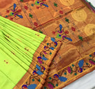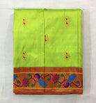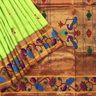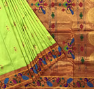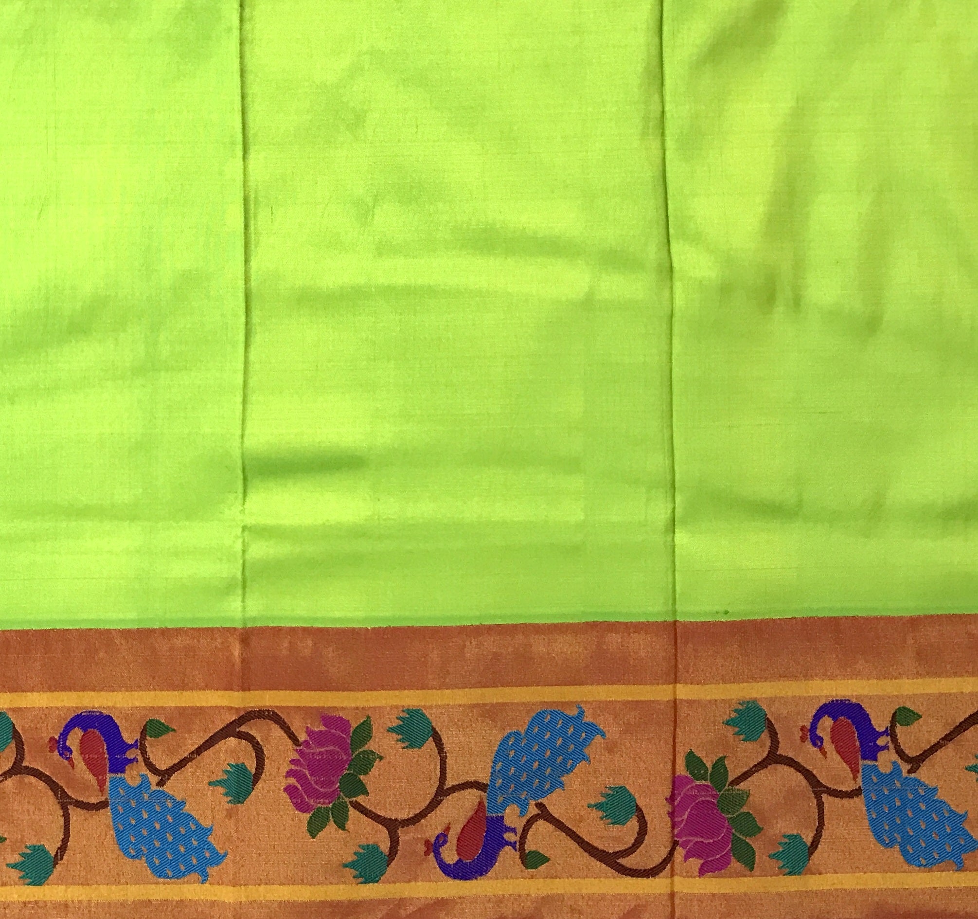 This Royal Paithani is the epitome of elegance, weaved with care and love for special days. The intricate weaving, the delicate meenakari peacock motifs and the clean workmanship brings magic and soul to this Parrot Green Paithani. The designer zari border with beautiful floral and peacock motifs running through it, makes this Signature Paithani an unique weave.