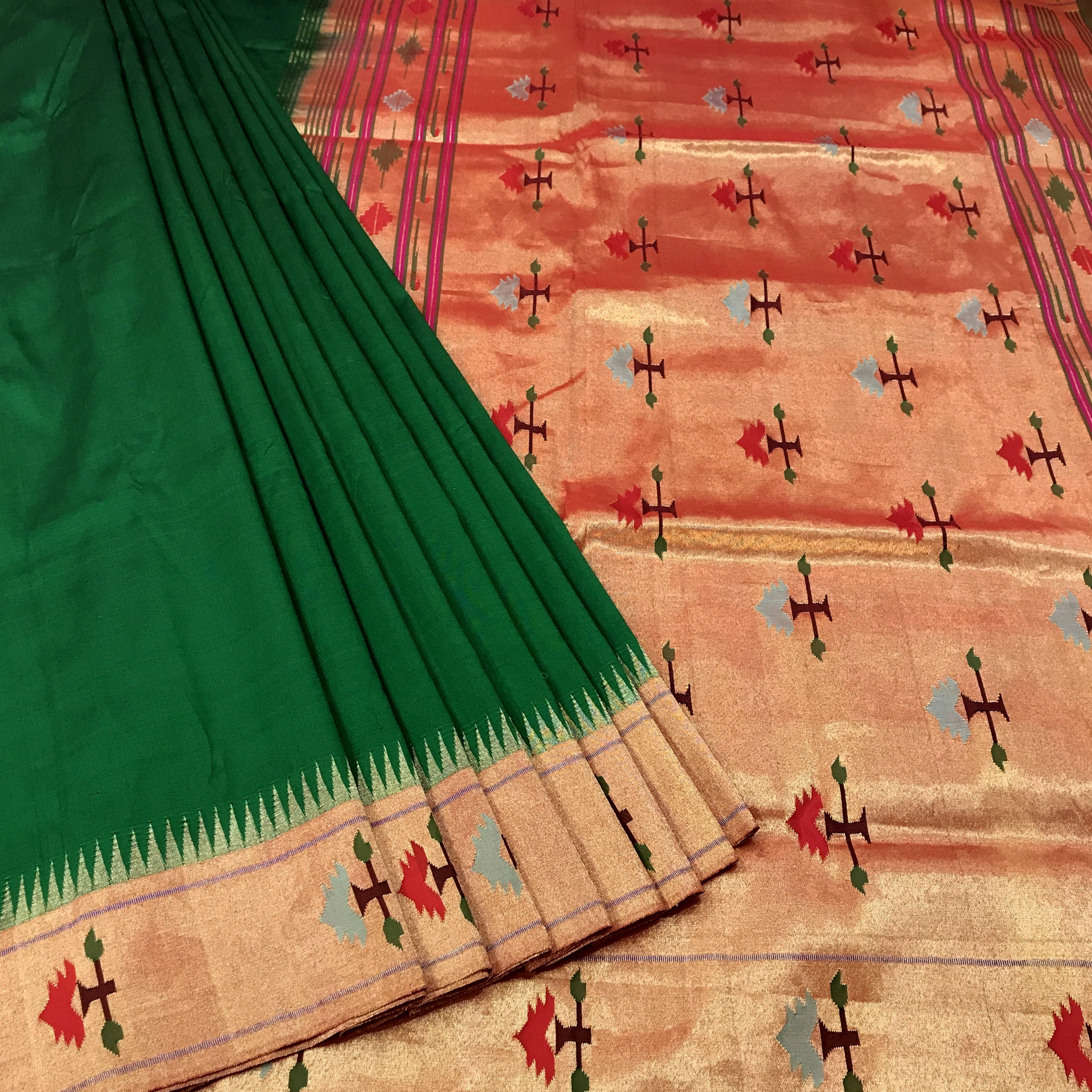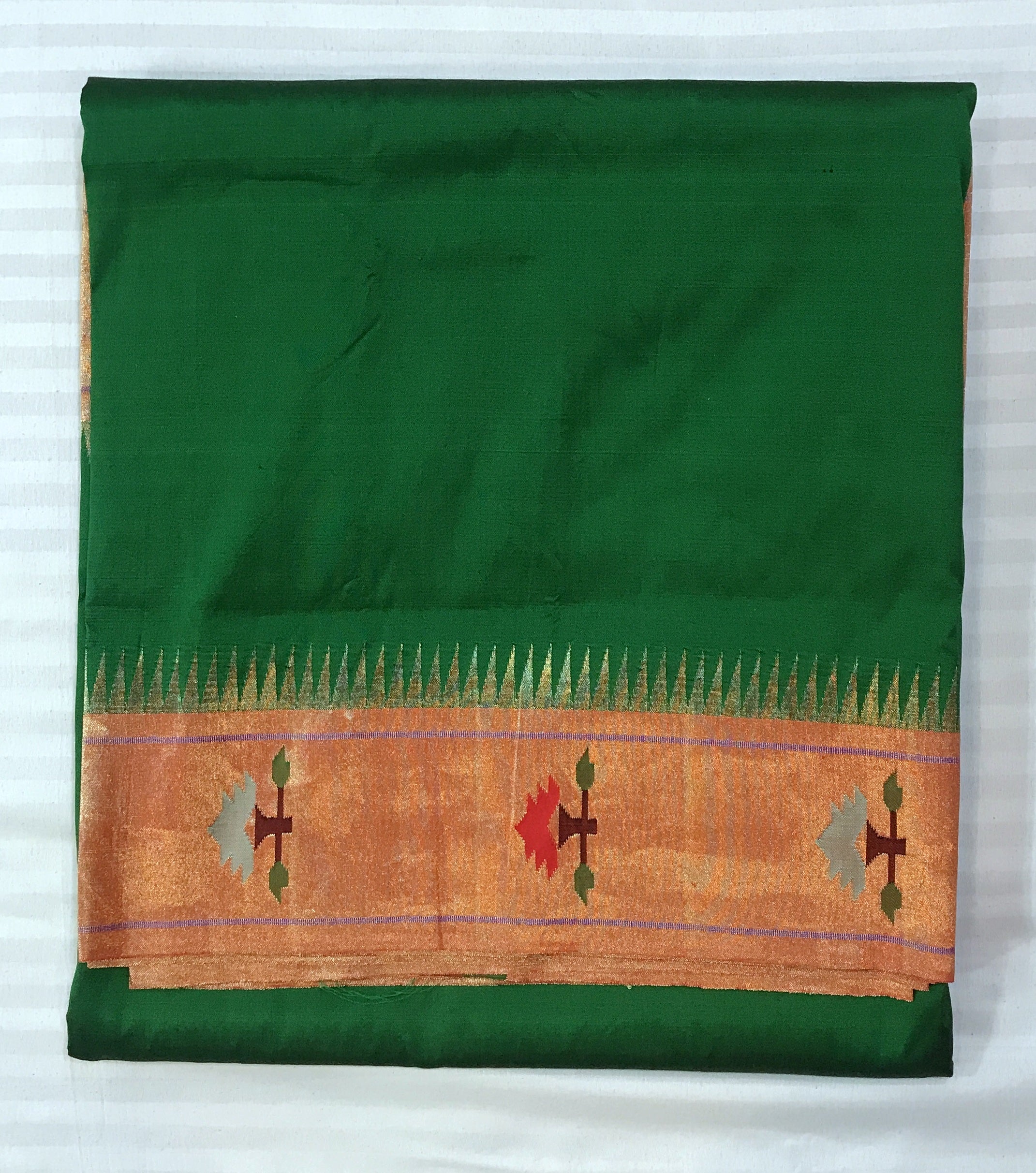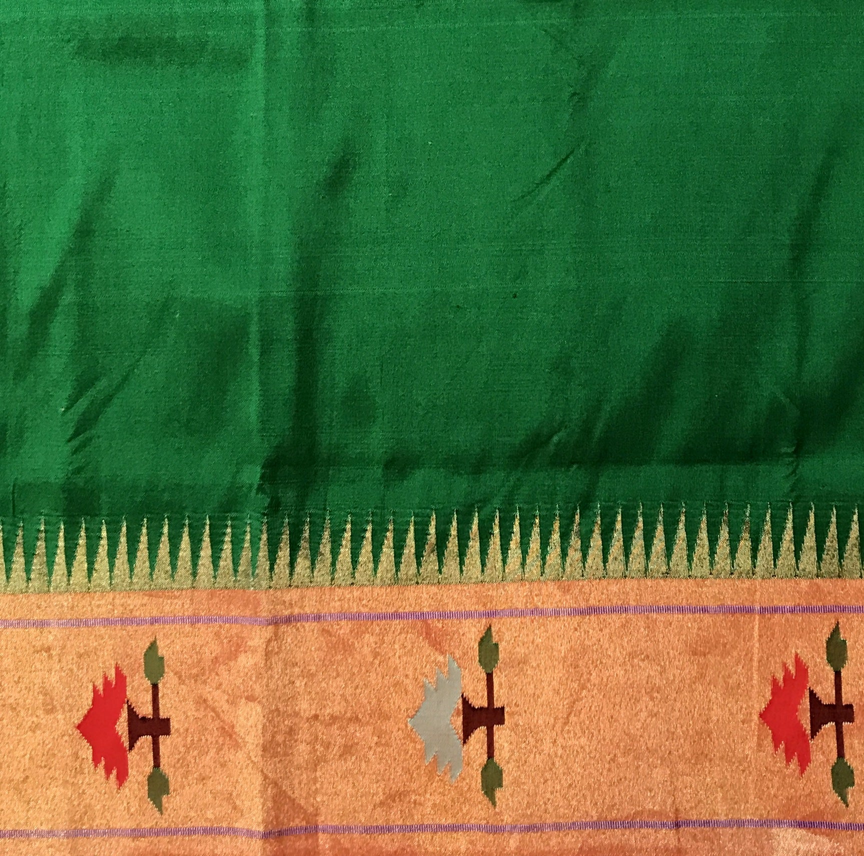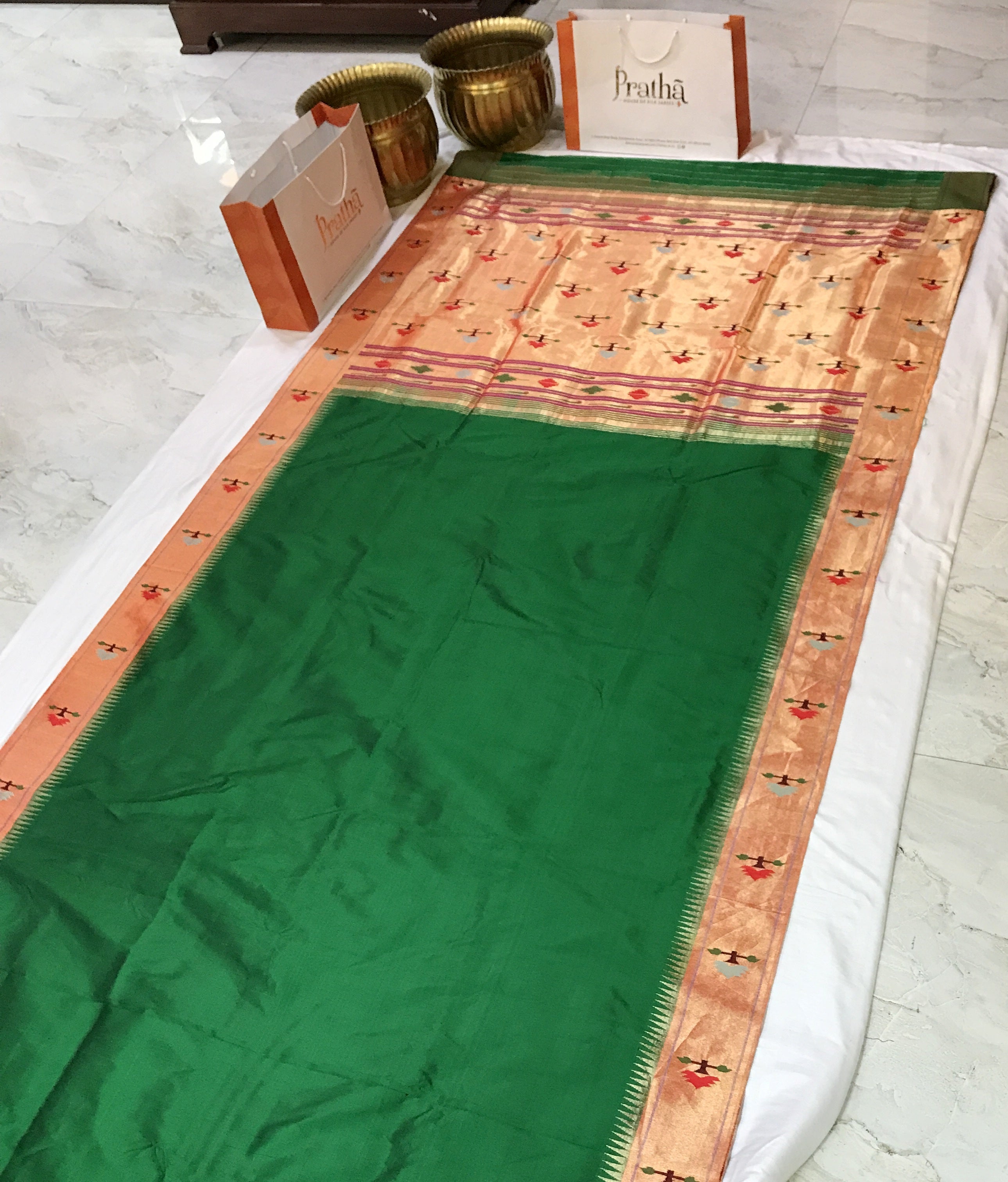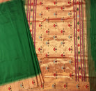 This Royal plain Paithani is the epitome of elegance, weaved with care and love for special days. The intricate weaving and the clean workmanship brings magic and soul to this green Paithani. The designer zari border with beautiful lotus design running through it, makes this Signature Paithani a unique weave.