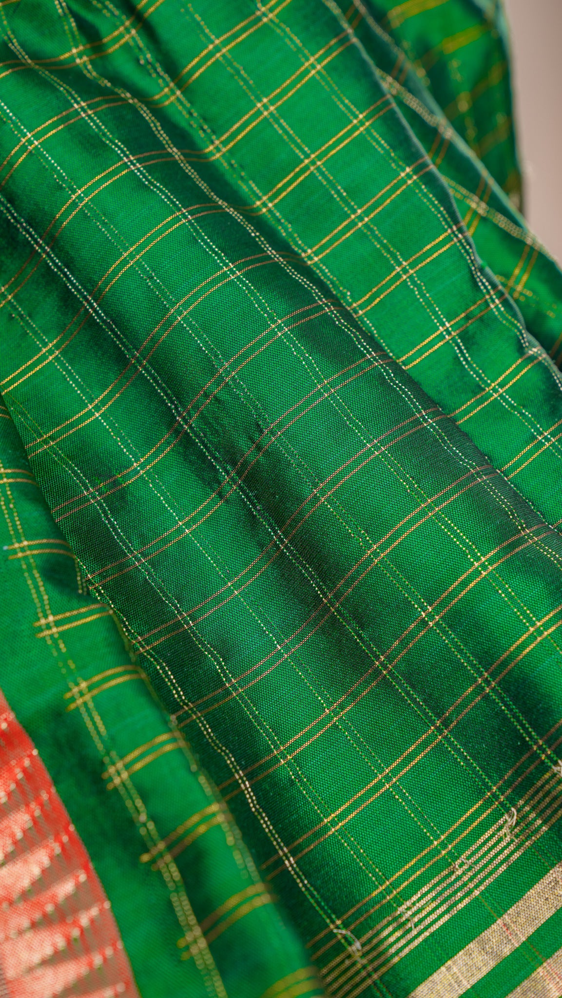 An awesome shade of green, this rich colour in pure silk with the most amazing triple muniya zari border is a classy combination for a handwoven Paithani. This being a unique border Paithani, handwoven to perfection is a signature piece at Pratha. A very beautiful zari checks design all over the saree ,the pallu with its perfect unique motifs of peacock, and the colour on itself, makes this weave perfect for weddings or any other festive occasions. This colours looks versatile in different light conditions.