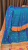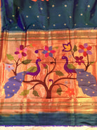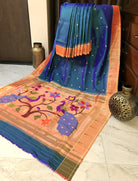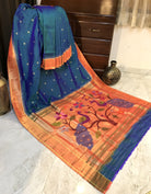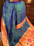This exquisite Paithani saree is a true gem from Pratha! Featuring a stunning peacock-blue that complements the golden zari muniya border, this pure handloom Paithani is ideal for your special occasions. Adorned with delicate dollar shaped butti (motifs) in golden zari and an opulent pallu, it exudes grace and elegance. The pallu's has unique motifs woven like parrot, peacock which add an extra touch of splendor to this festive saree. Remarkably, it takes over 40 days to weave such a masterpiece!