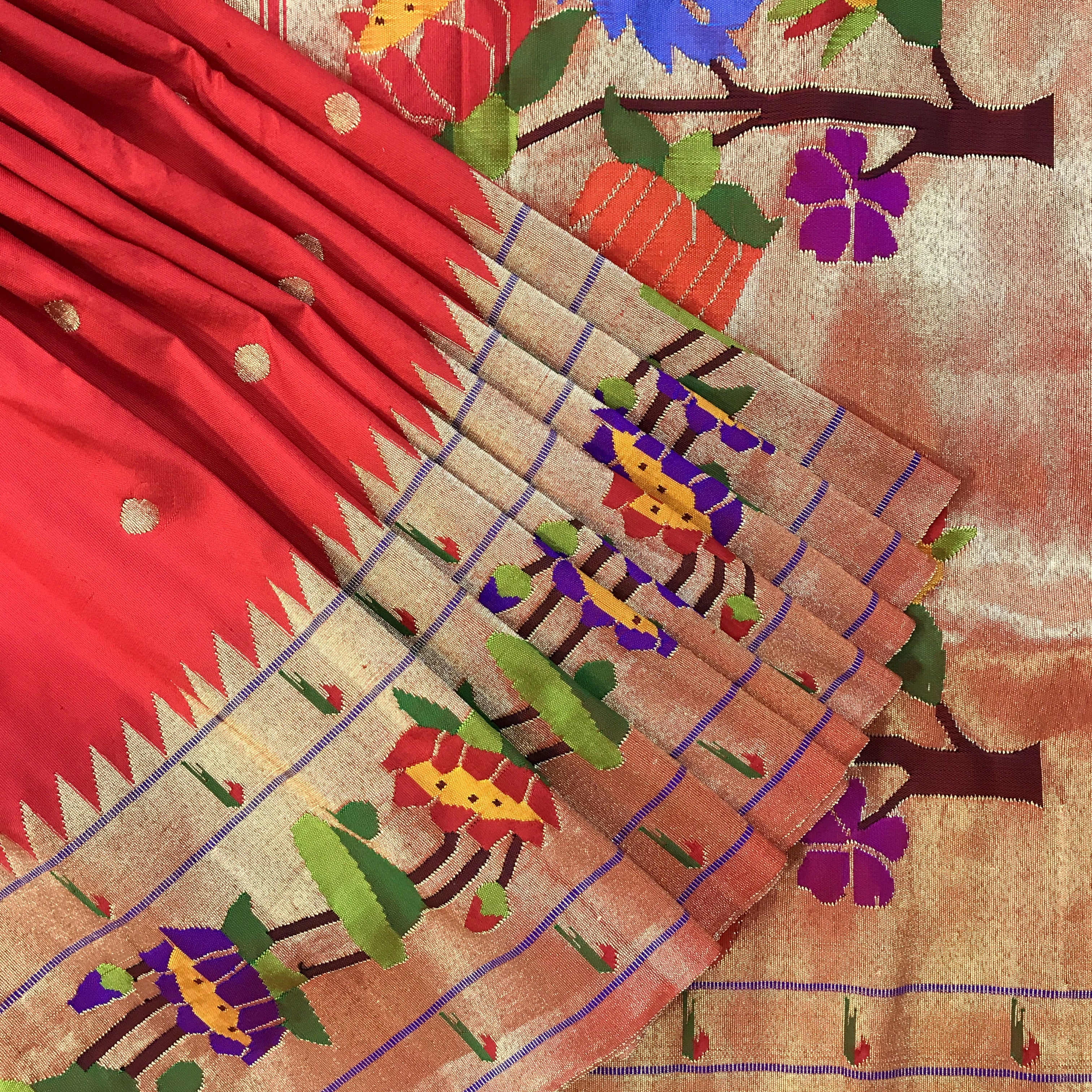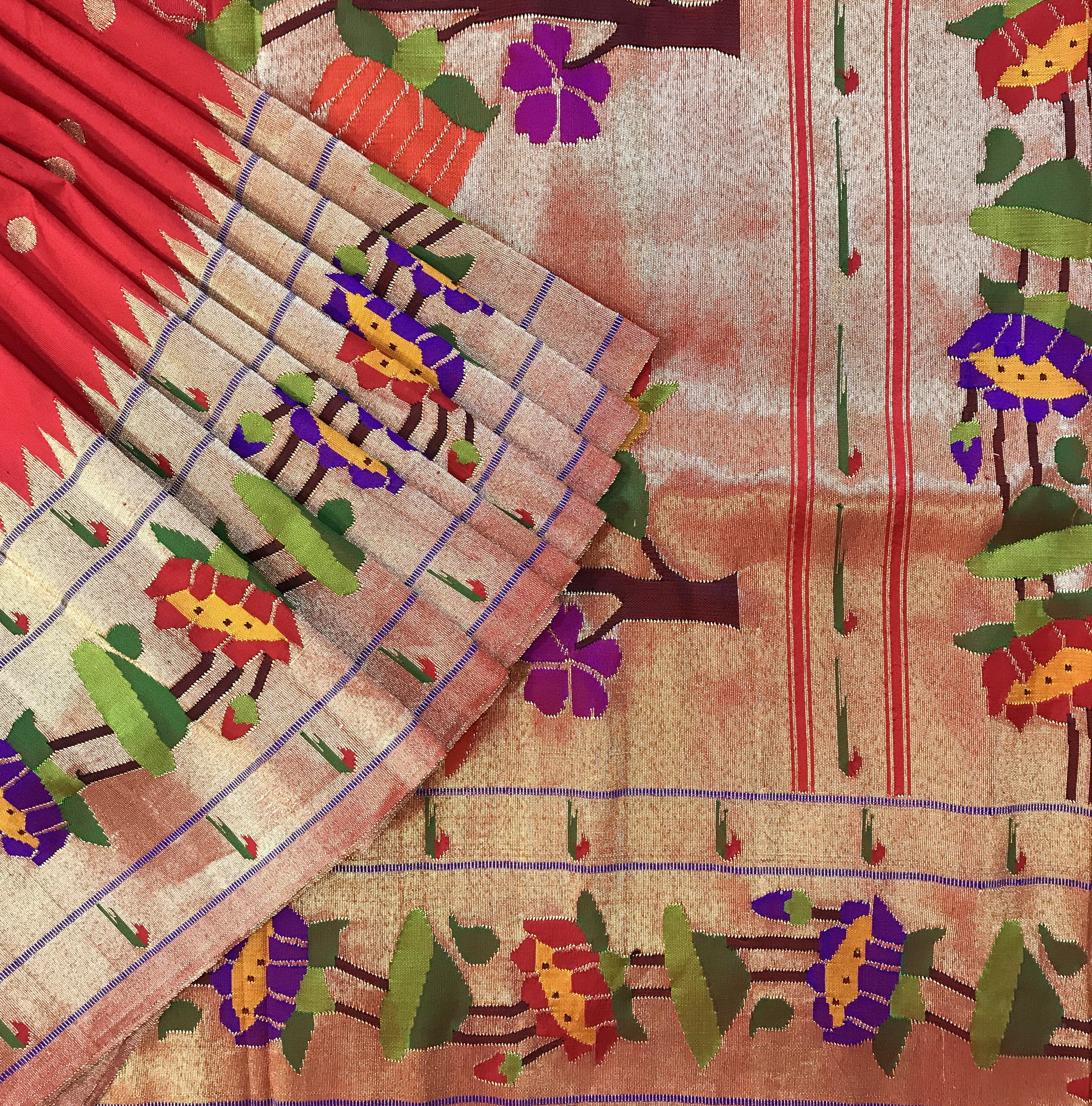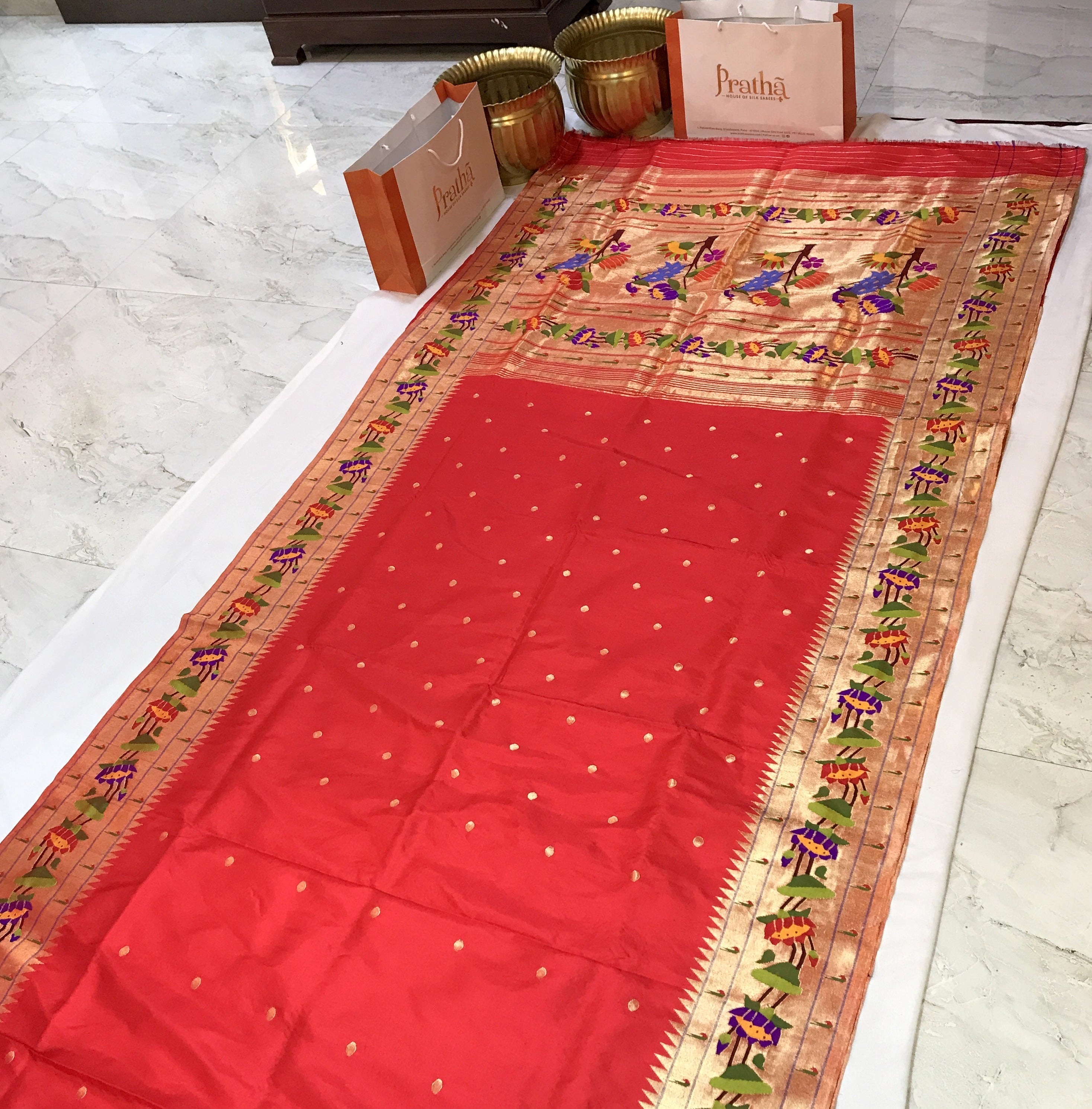 A pure handwoven Paithani with the finest of zari, this one has a beautiful golden zari circle shaped butti all over the body look fantastic! A very gorgeous shade of classic red teamed up with the classy designer (floral motifs ) border Paithani in a delicate meenakari design zari border this saree identifies itself as a Paithani through its beautifully woven special designed in golden zari pallu! The meenakari design of the zari border adds to the royal look of this Paithani ! This one is so unique, its definitely a Pratha signature piece!