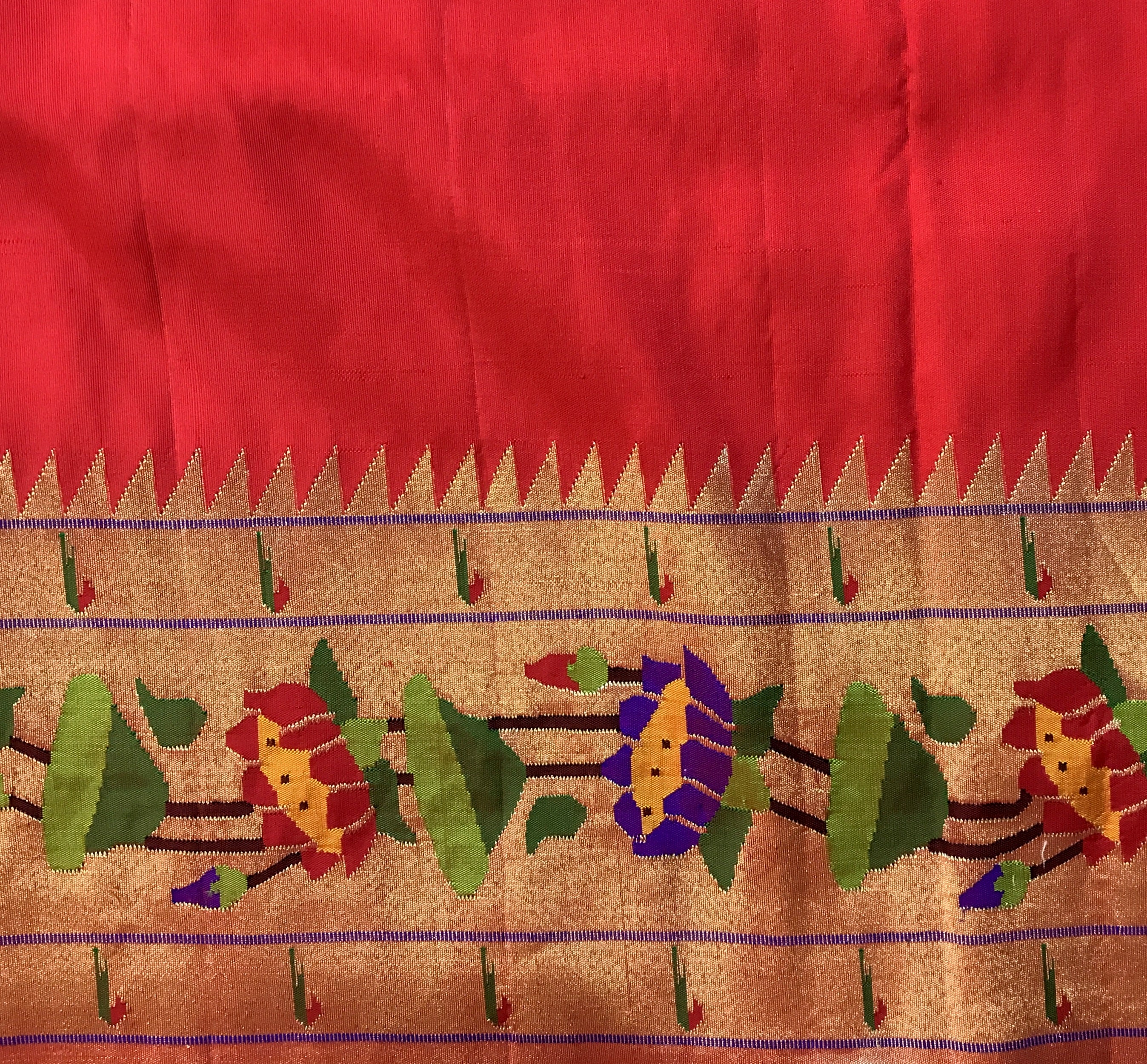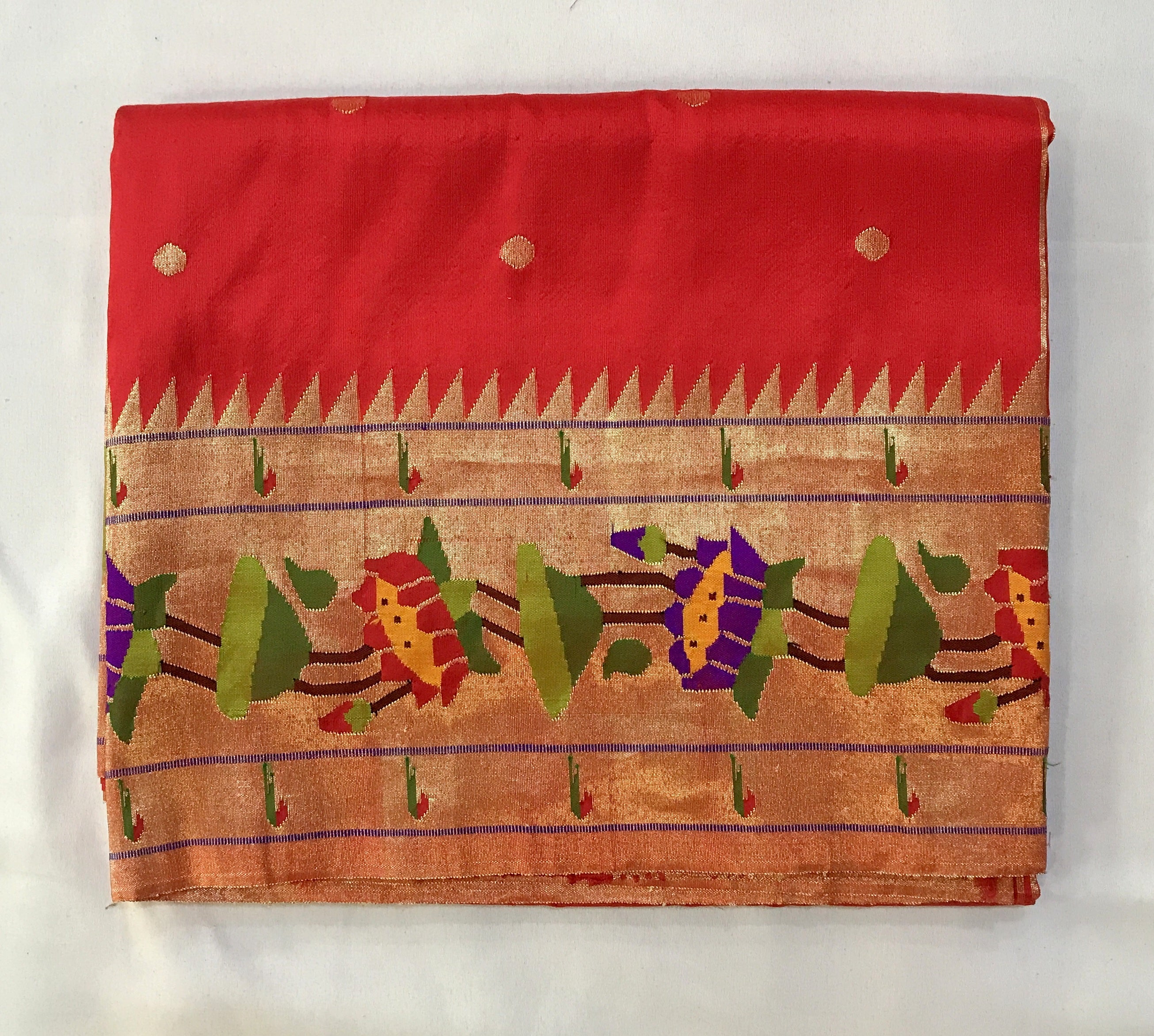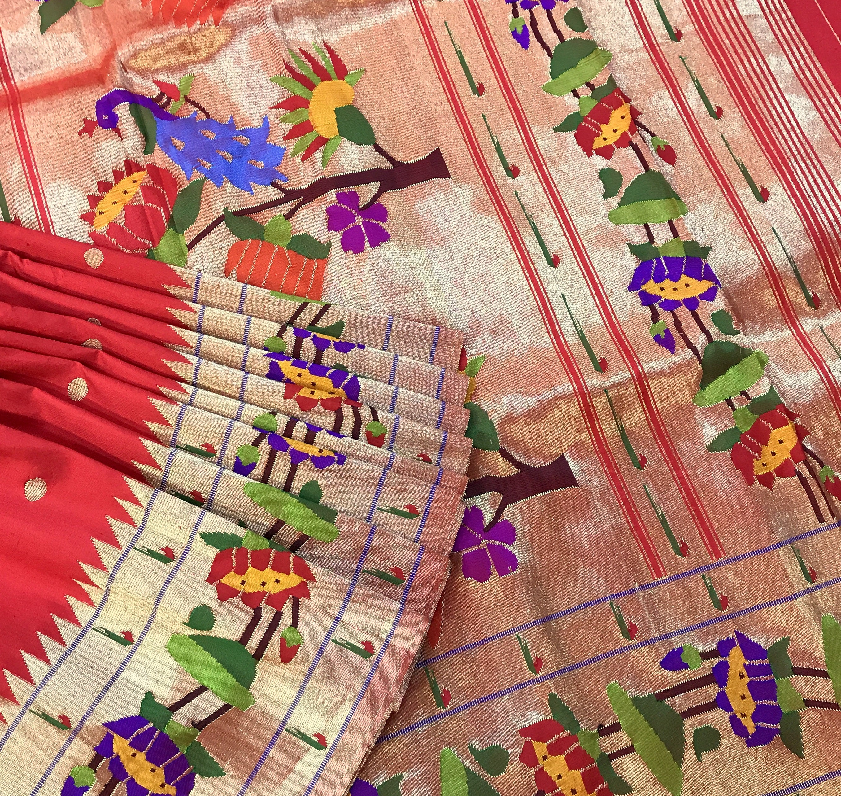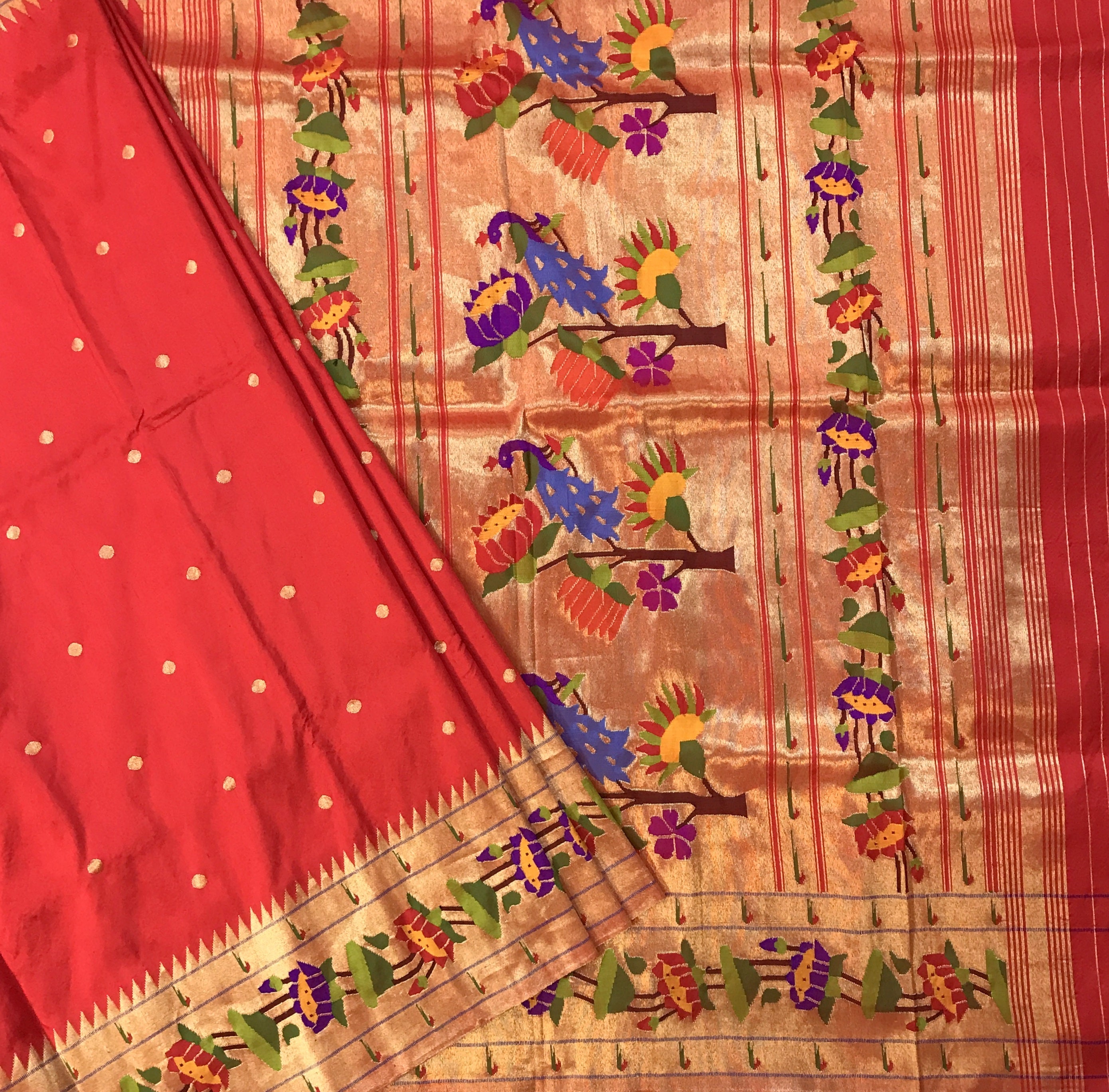 A pure handwoven Paithani with the finest of zari, this one has a beautiful golden zari circle shaped butti all over the body look fantastic! A very gorgeous shade of classic red teamed up with the classy designer (floral motifs ) border Paithani in a delicate meenakari design zari border this saree identifies itself as a Paithani through its beautifully woven special designed in golden zari pallu! The meenakari design of the zari border adds to the royal look of this Paithani ! This one is so unique, its definitely a Pratha signature piece!