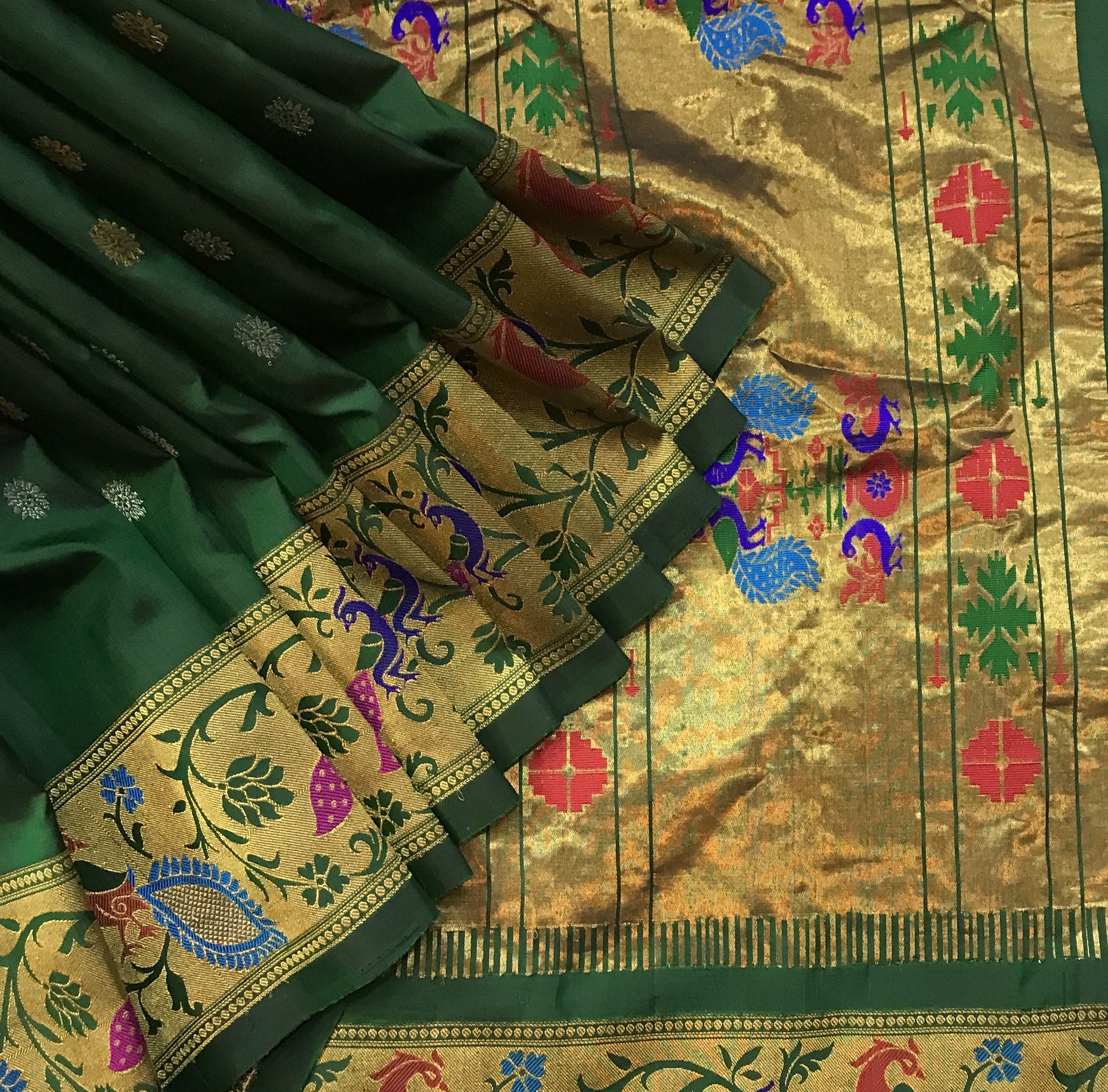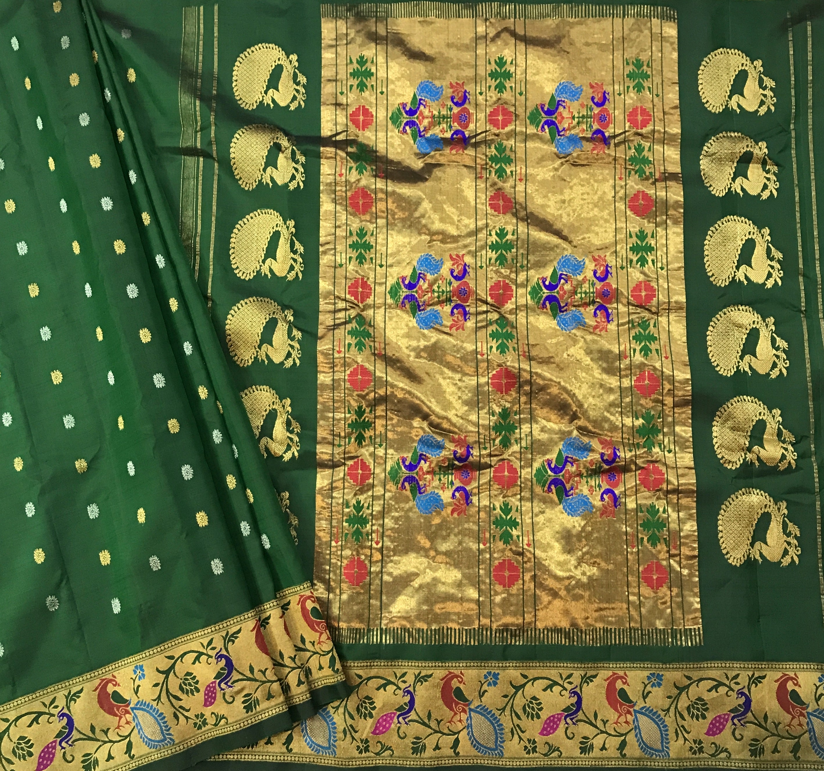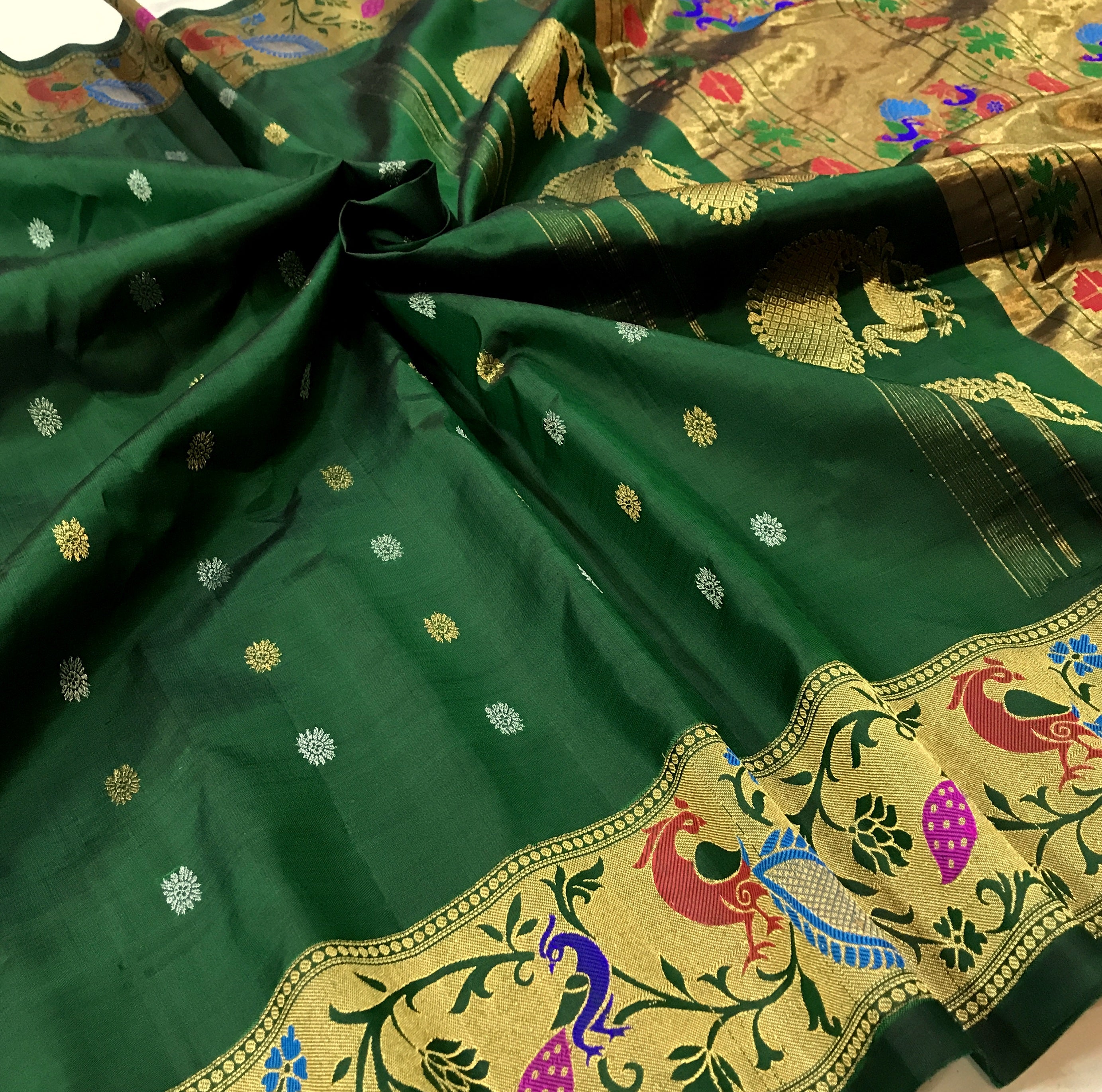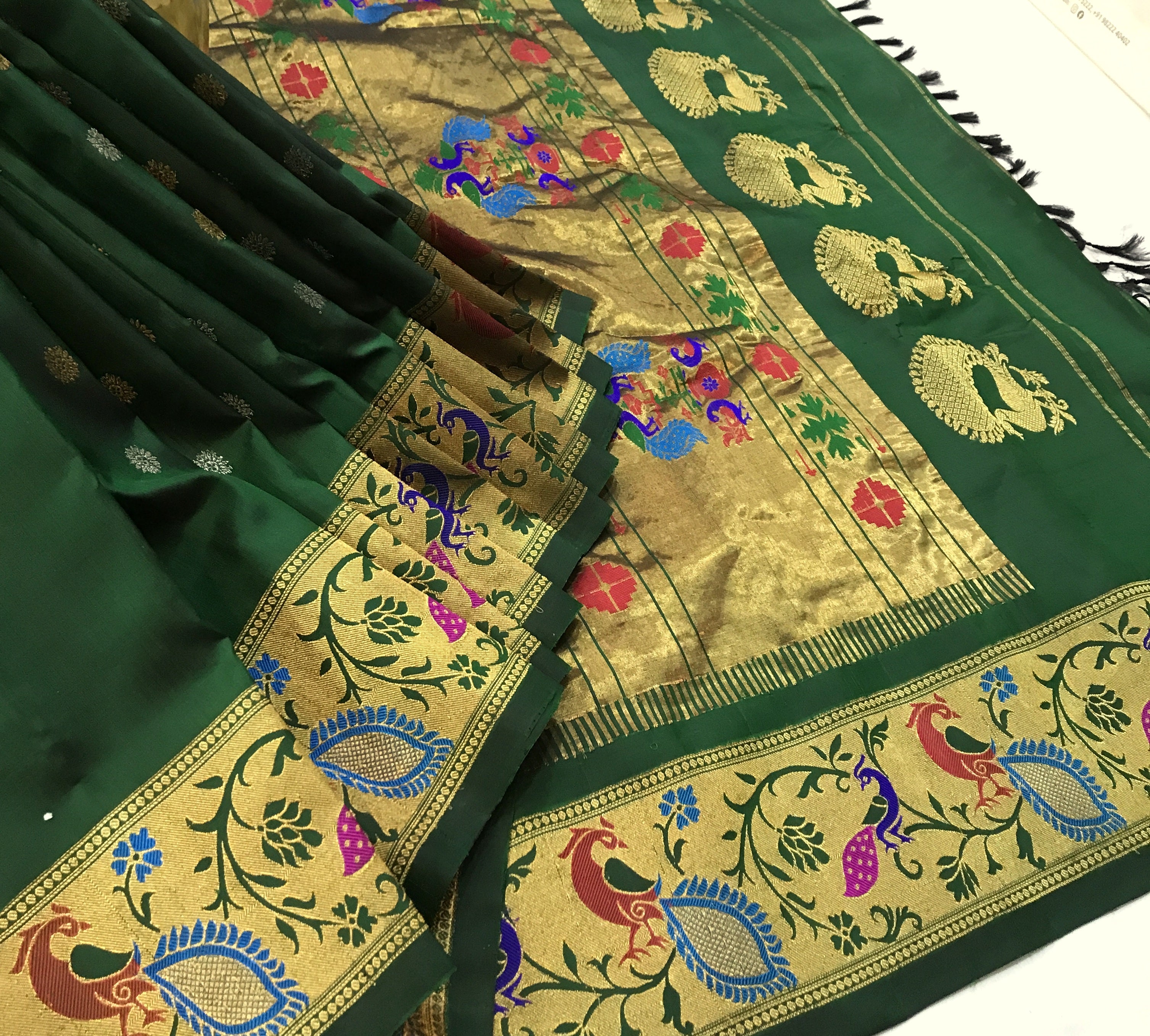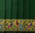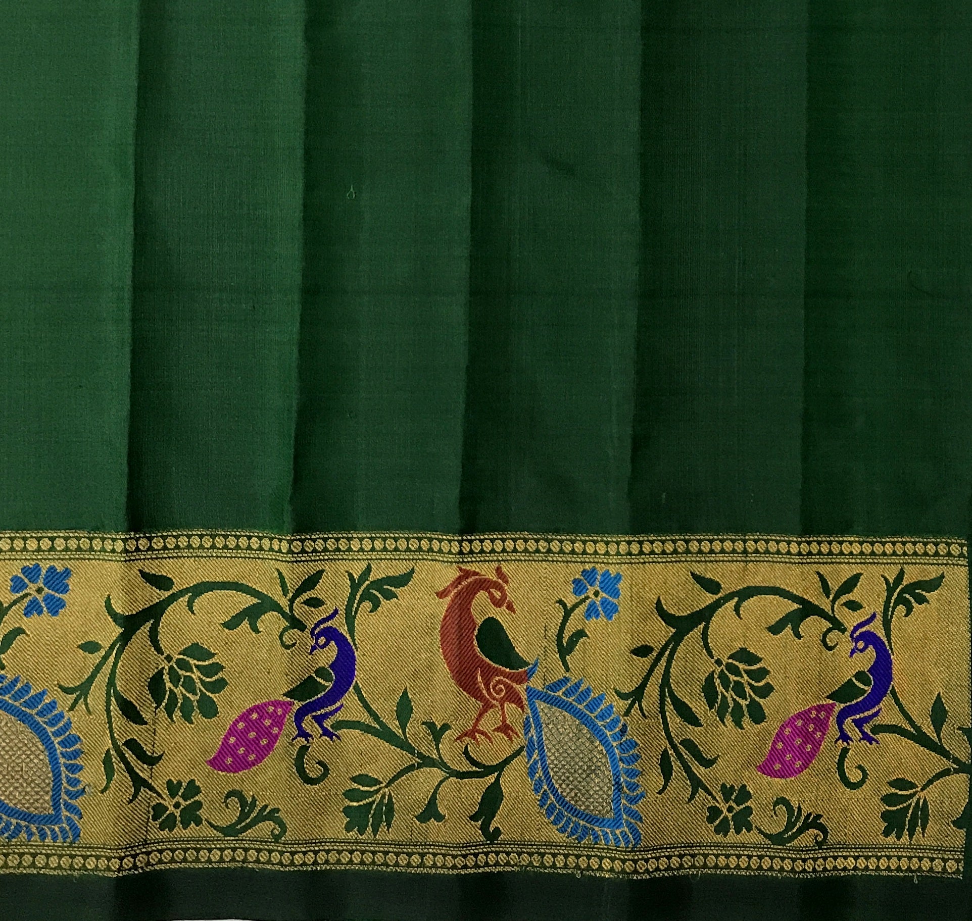This Royal Paithani is the fusion of Gadhwal epitome of elegance, weaved with care and love for special days. The intricate weaving, the delicate motifs and the clean workmanship brings magic and soul to this Green Paithani. The designer zari border with beautiful floral and peacock motifs running through it, makes this Signature Paithani a unique weave.