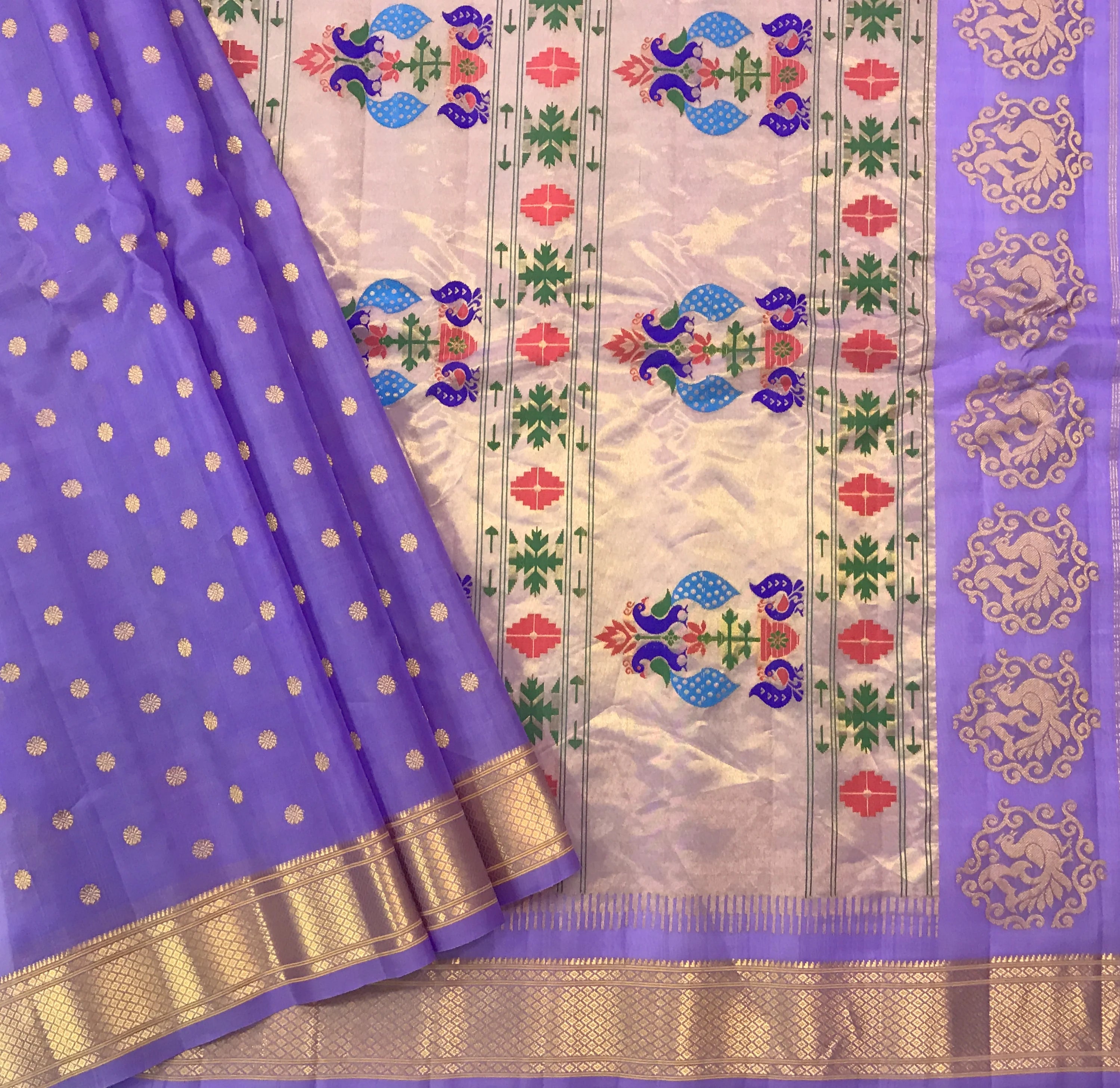 This Tussar Paithani saree, is a very new variety of Paithani saree which is very unique and attractive. These are flowy Tussar Paithani with classy golden zari butt design ( floral motifs )! Pratha presents a fresh collection of Tussar Paithani saree with golden zari traditional Border! This saree is slightly transparent ,it has a graceful transparency like that of cotton, it looks very nice. It is also available in different colours and has slight sheen to it which makes it wearable for party's as well. For those who are on the lookout for something different, this one is just for you!