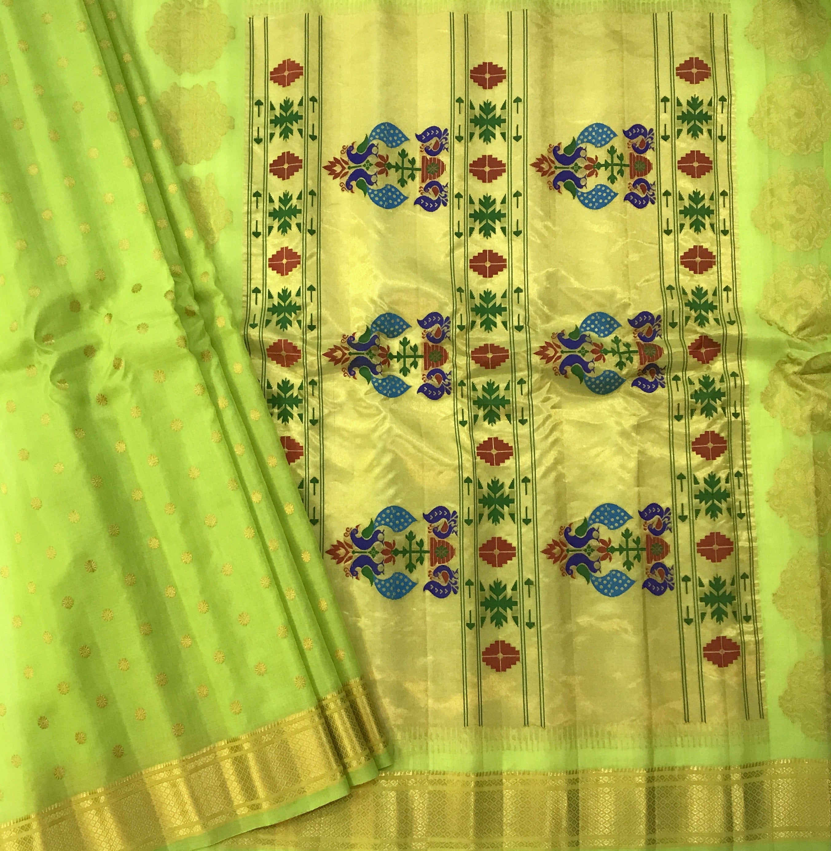 An amazing Parrot green shaded Tussar Paithani looks absolutely stunning. This classy combination looks marvelous when draped, the butti, pallu and the traditional design of the border give a festive touch to this weave.