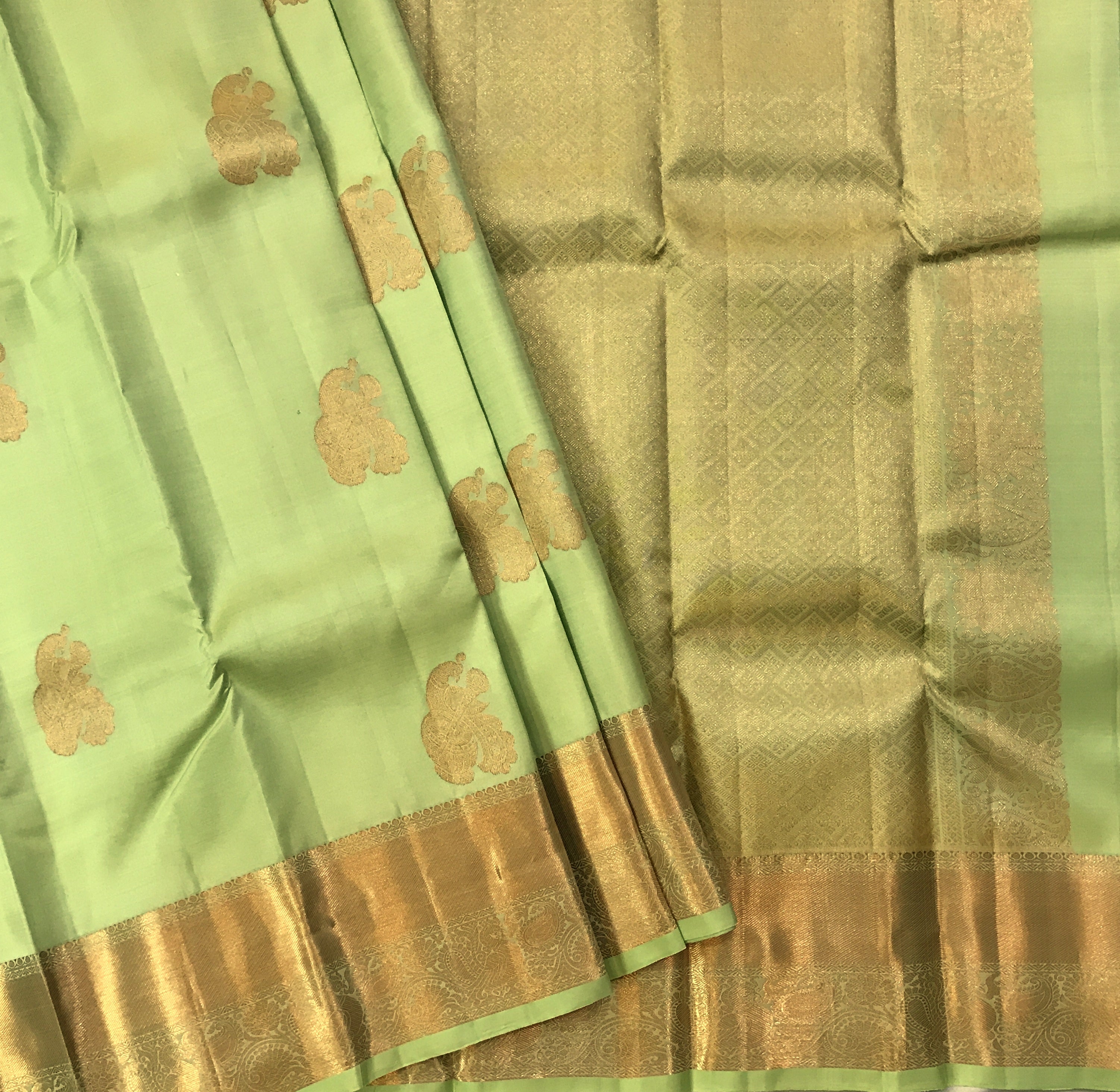 A beautiful pista-green pure silk handwoven Kanjeevaram, this one is perfectly traditional. The intricate uncommon peacock shaped butti designs, copperish zari border and richly woven Pallu make this weave a classic! Thanks to its beautiful colour combination, this Kanjeevaram will look great in the day as well as at night! The border has the classic traditional Kanjeevaram border as well as a designer elements of the bird design look great!