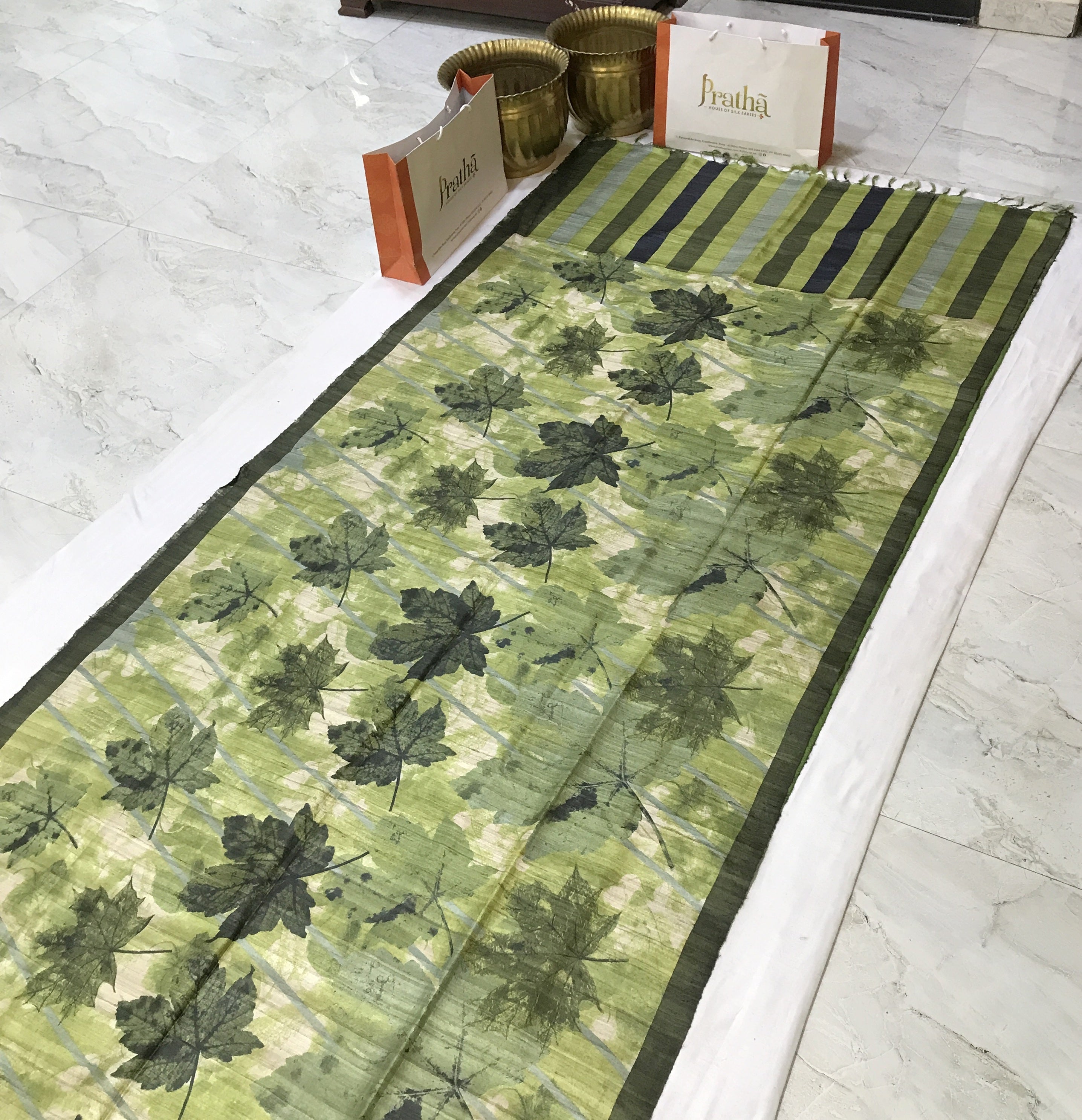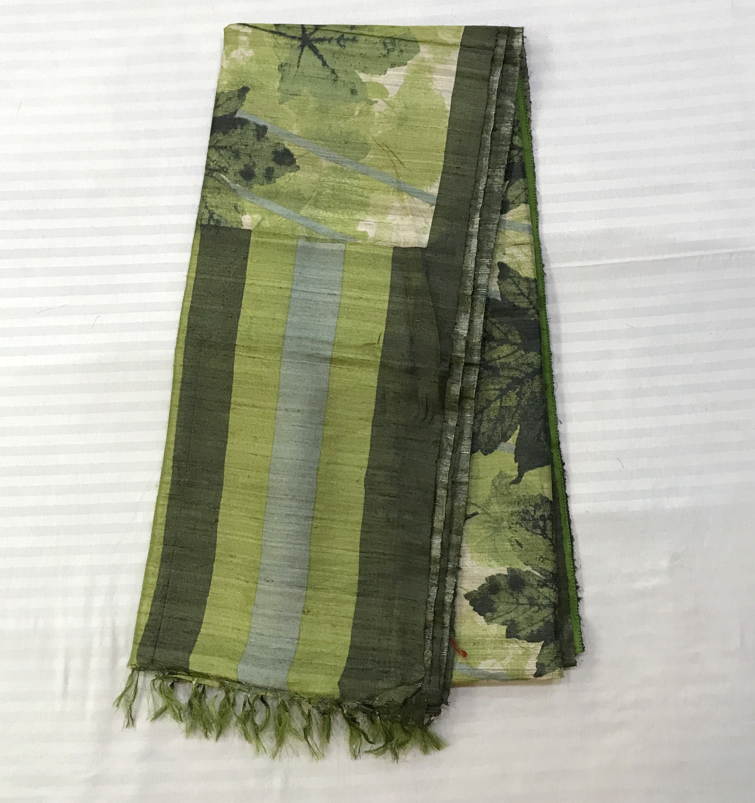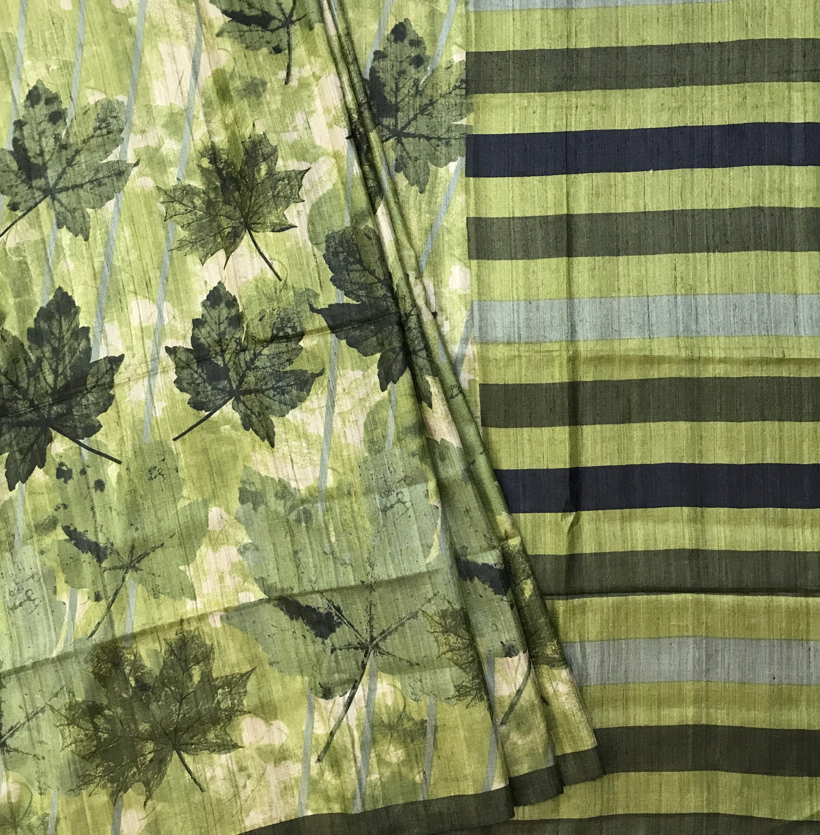 This printed Tussar silk saree showcases a refreshing olive-green base adorned with elegant leaf motifs that create a soft, nature-inspired appeal, beautifully complemented by a striped pallu in harmonious shades of green and muted blue the textured richness of Tussar silk adds depth and character, making it a graceful choice for daytime festivities and elegant casual occasions.