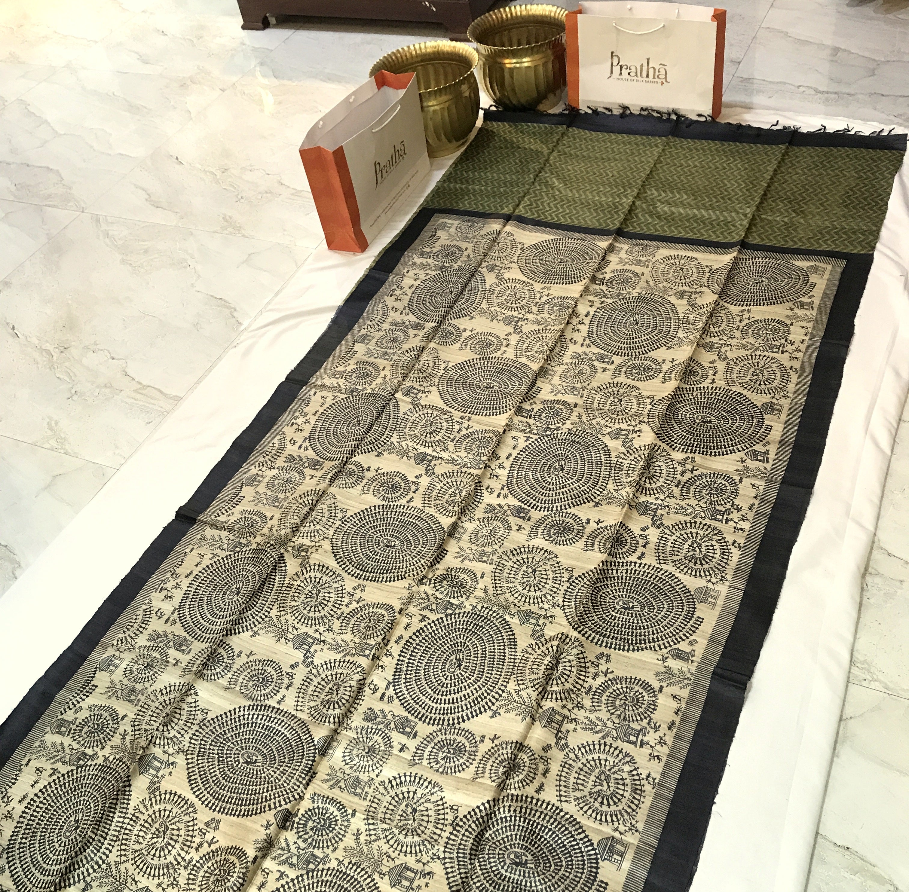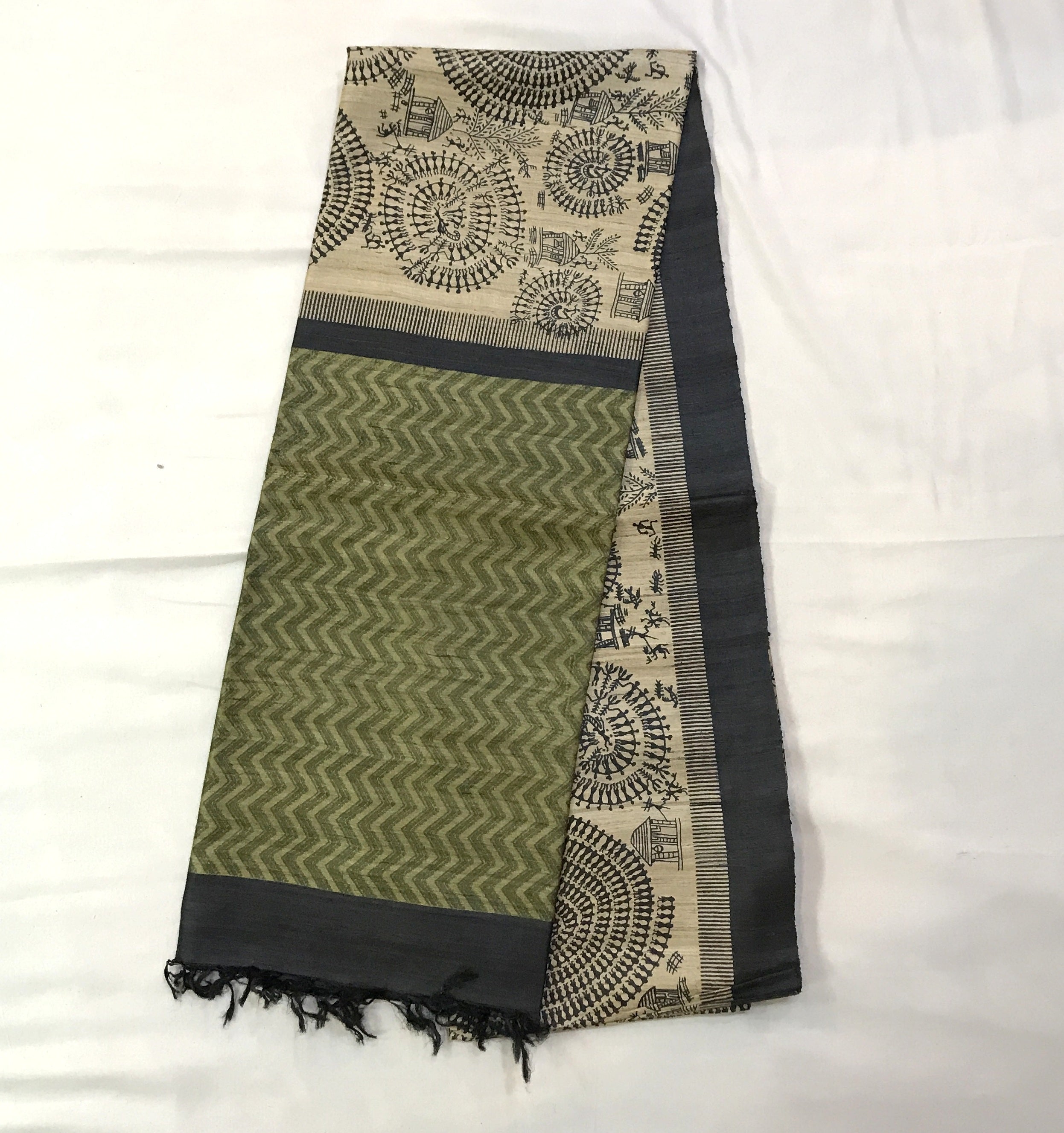 Blouse Colour: Contrast( Olive-green and saree comes along with tassels )