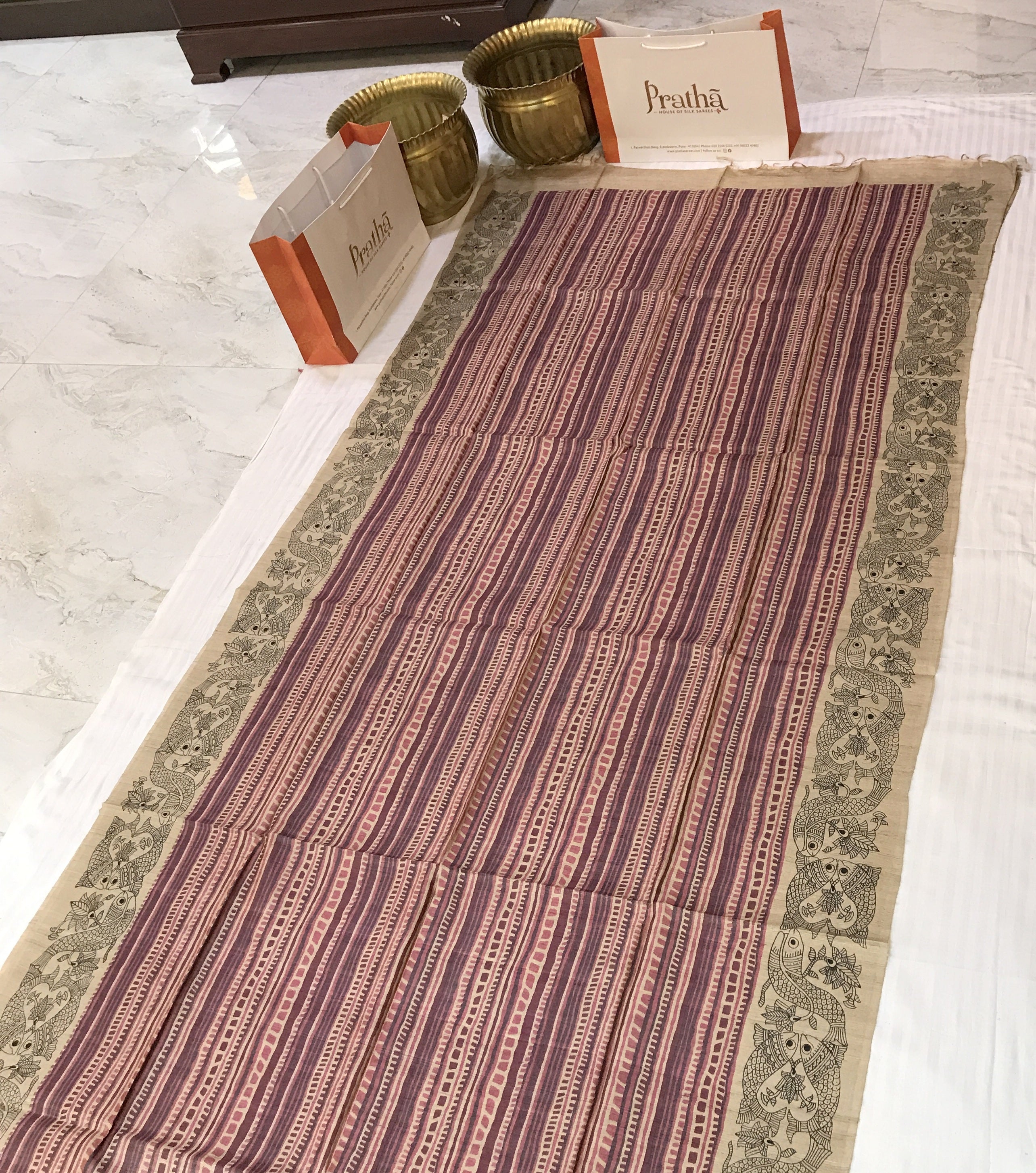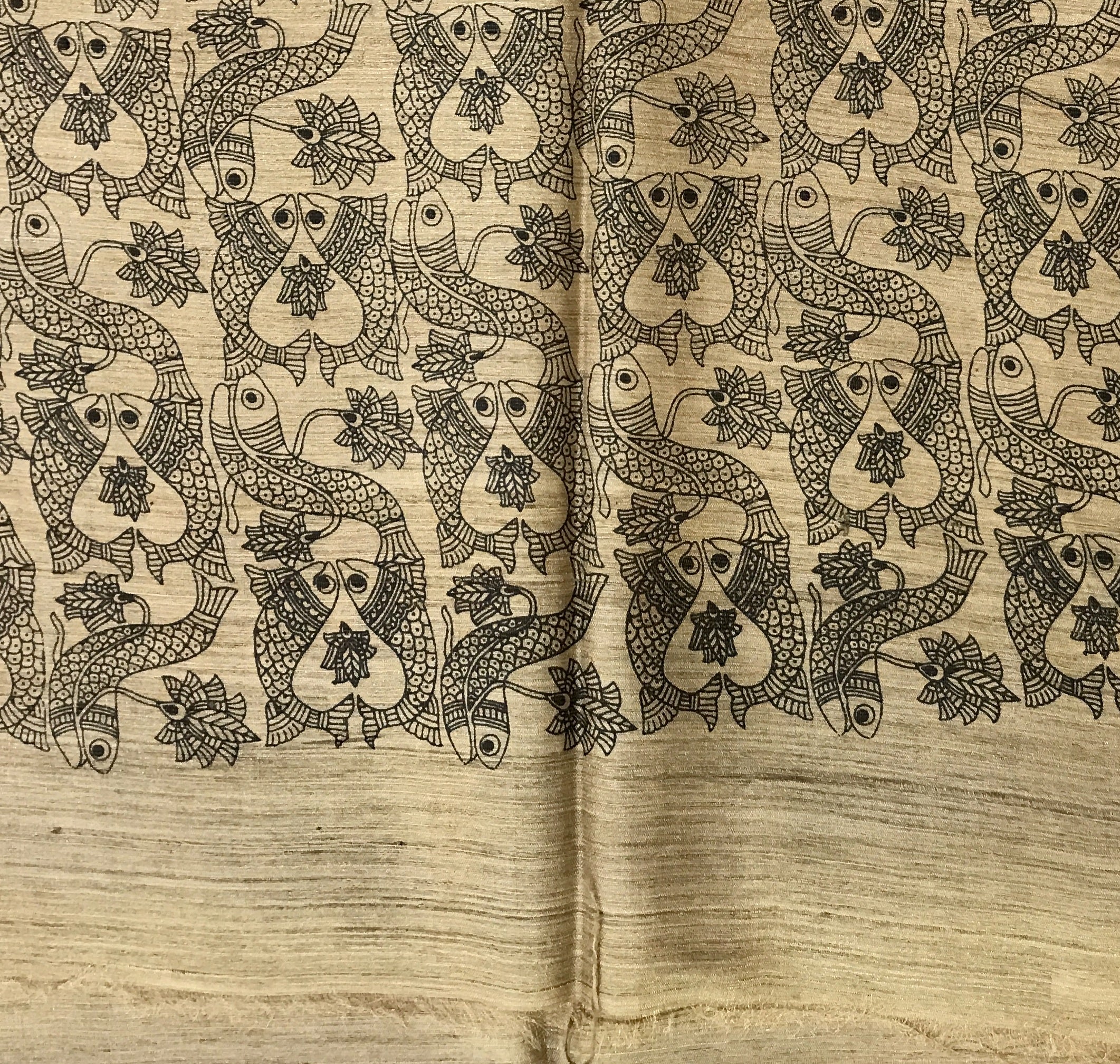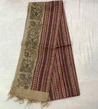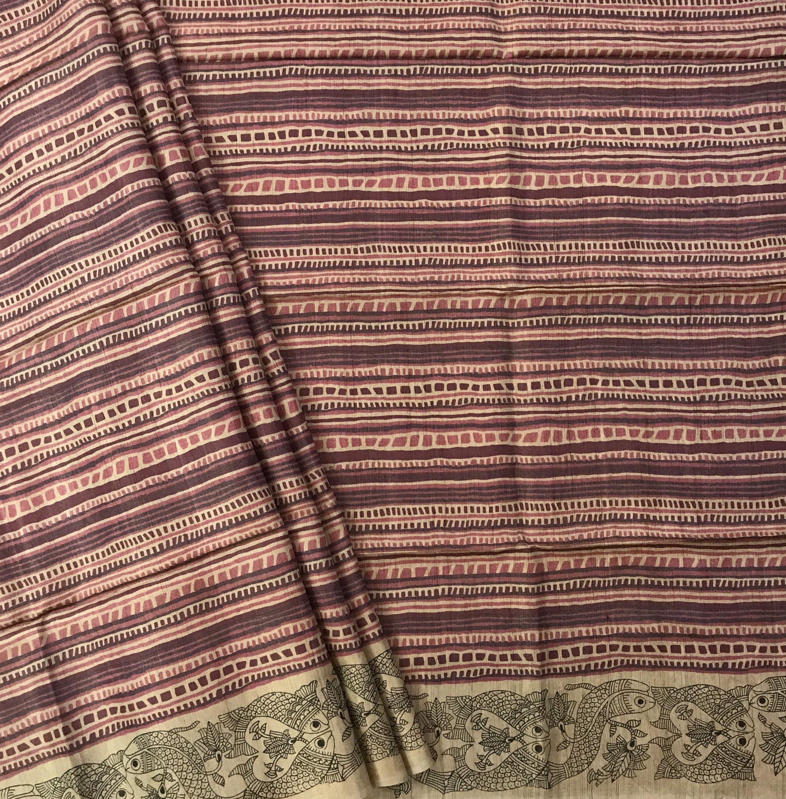 This graceful beige and maroon Tussar Silk saree exudes understated elegance through its artistic simplicity and traditional appeal. The saree features hand-block-inspired geometric stripes in soothing shades of maroon, brown, and beige, creating a rhythmic pattern that enhances its sophisticated charm. The highlight lies in its intricately printed border, adorned with detailed Madhubani-style fish motifs—symbolizing prosperity and good fortune—rendered in fine black lines on a natural beige base. The harmonious blend of earthy tones and artistic motifs makes this saree perfect for both formal and festive occasions, reflecting timeless craftsmanship with contemporary finesse.