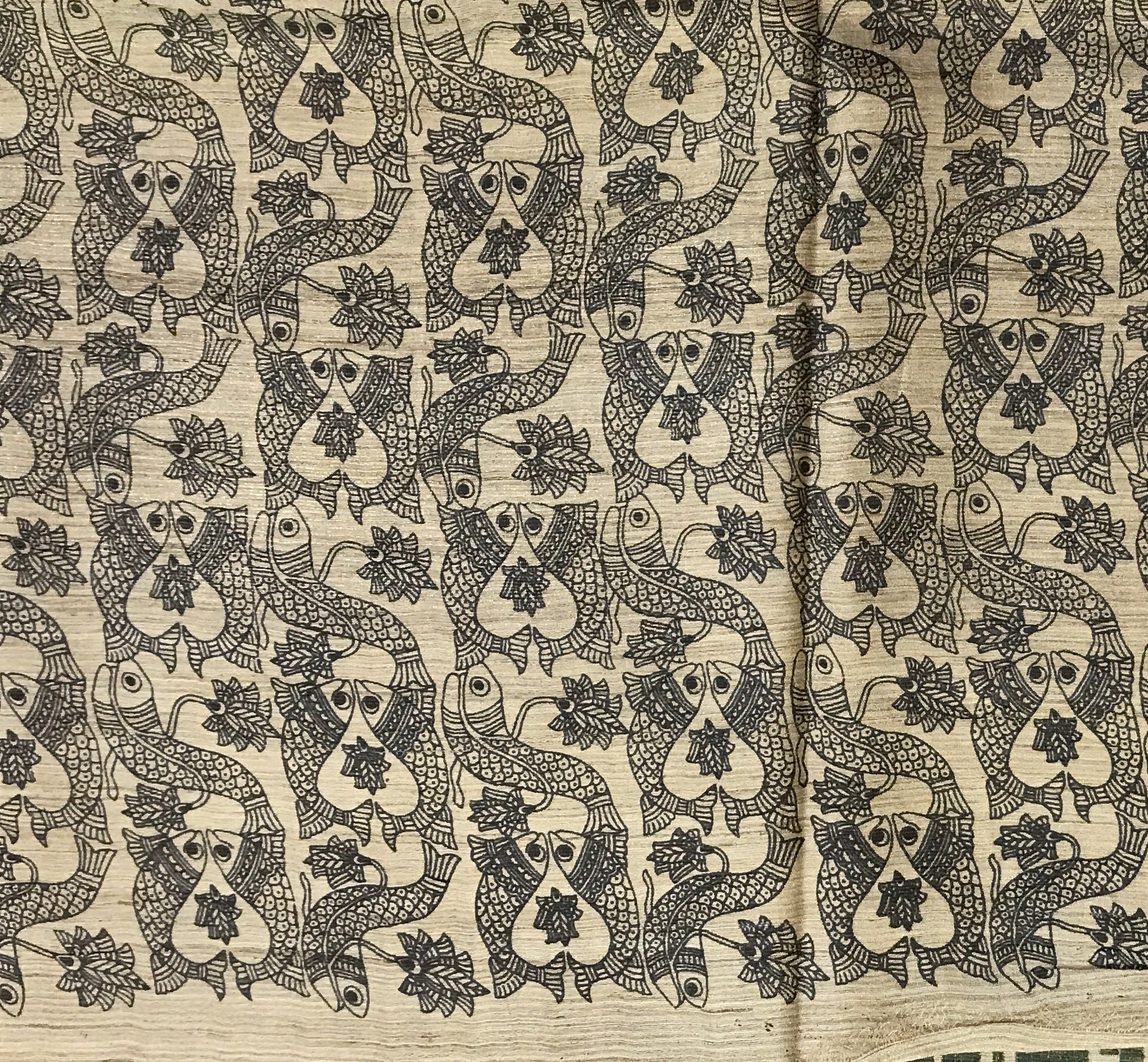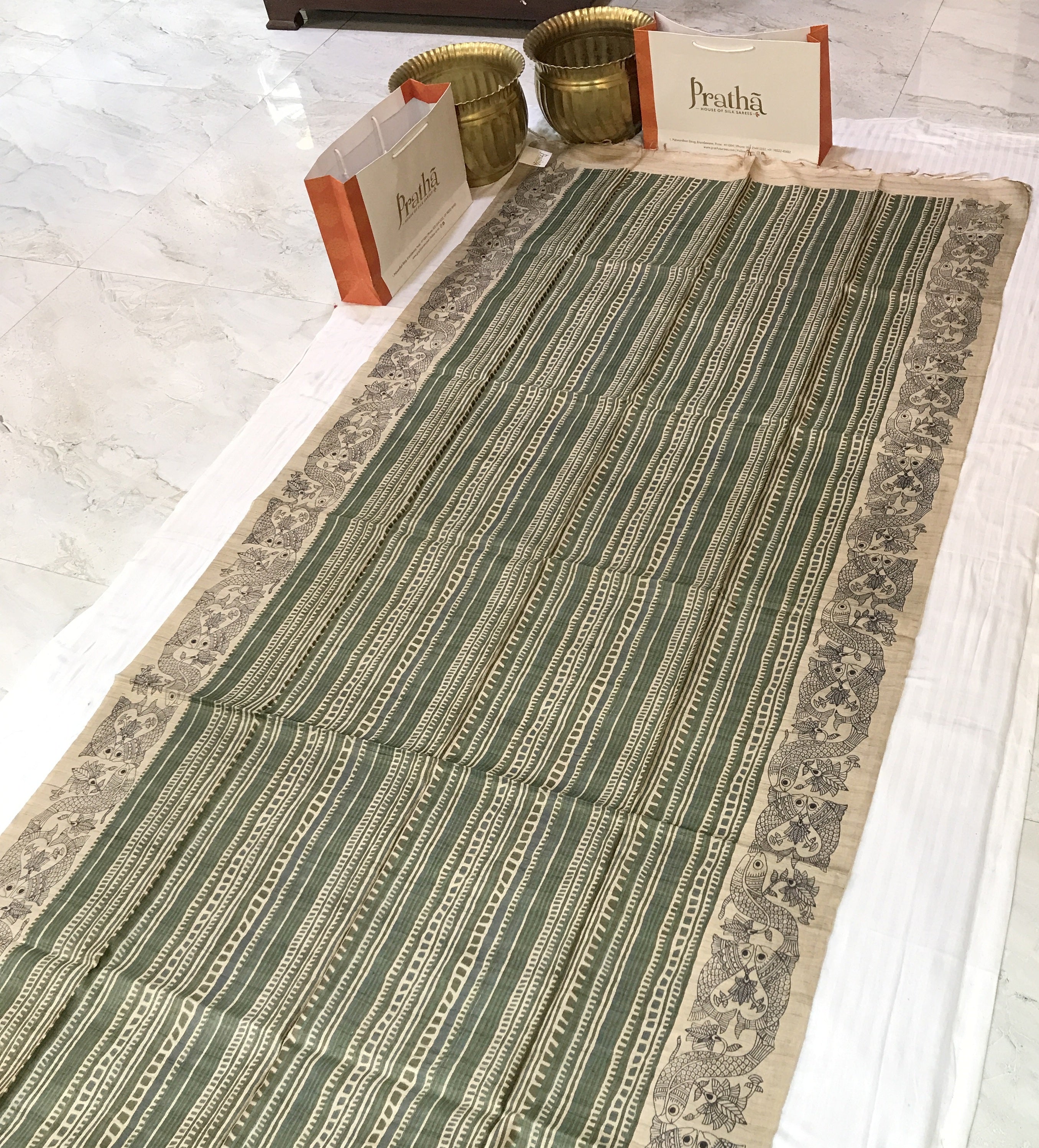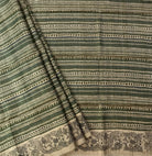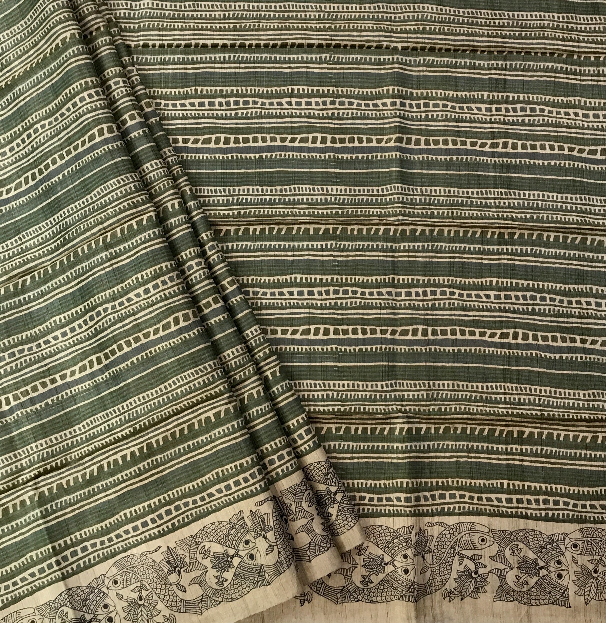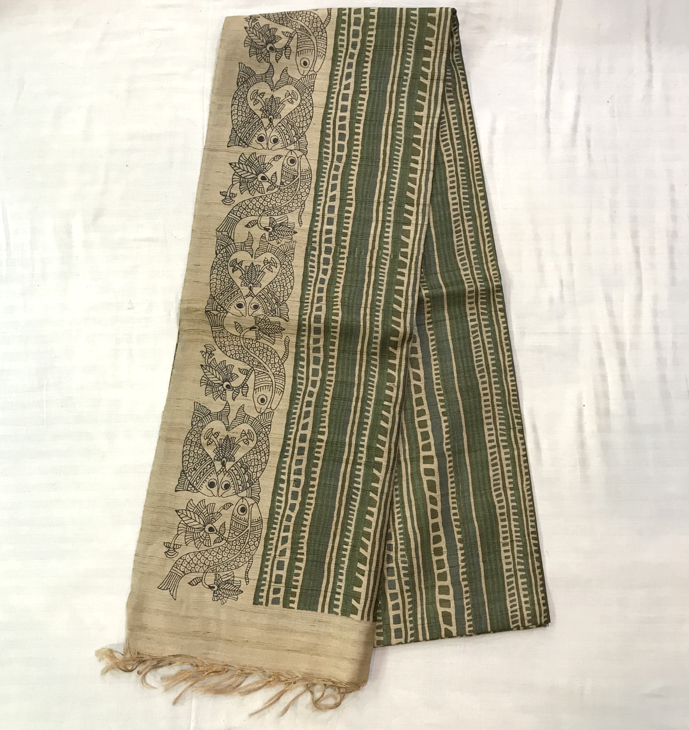 This graceful beige and green Tussar Silk saree exudes understated elegance through its artistic simplicity and traditional appeal. The saree features hand-block-inspired geometric stripes in soothing shades of maroon, brown, and beige, creating a rhythmic pattern that enhances its sophisticated charm. The highlight lies in its intricately printed border, adorned with detailed Madhubani-style fish motifs—symbolizing prosperity and good fortune—rendered in fine black lines on a natural beige base. The harmonious blend of earthy tones and artistic motifs makes this saree perfect for both formal and festive occasions, reflecting timeless craftsmanship with contemporary finesse.