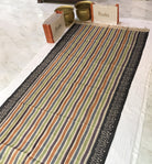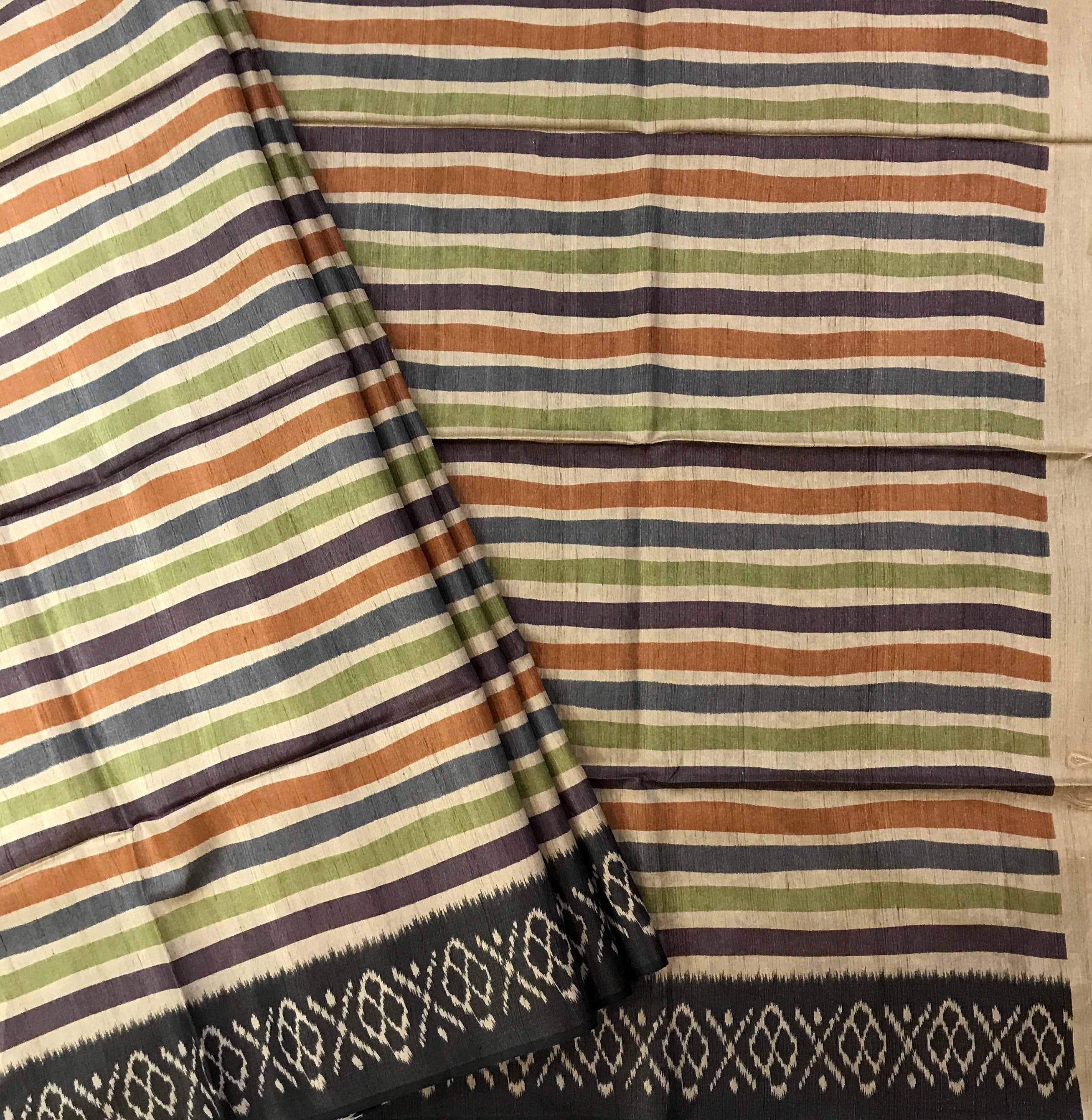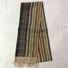 This beautiful saree showcases a harmonious blend of tradition and contemporary style. It features elegant horizontal stripes in shades of Purple, green, blue, orange that lend it a refreshing and sophisticated look. The subtle sheen of the fabric enhances its graceful drape, making it suitable for both formal and semi-casual occasions. The striking black border with intricate white Ikat-inspired motifs adds a touch of artistry and contrast, completing the saree’s aesthetic appeal beautifully.