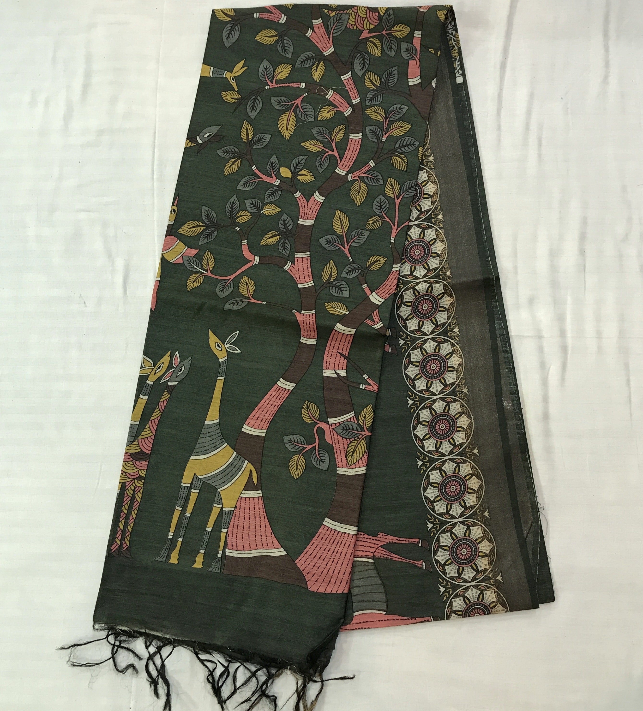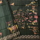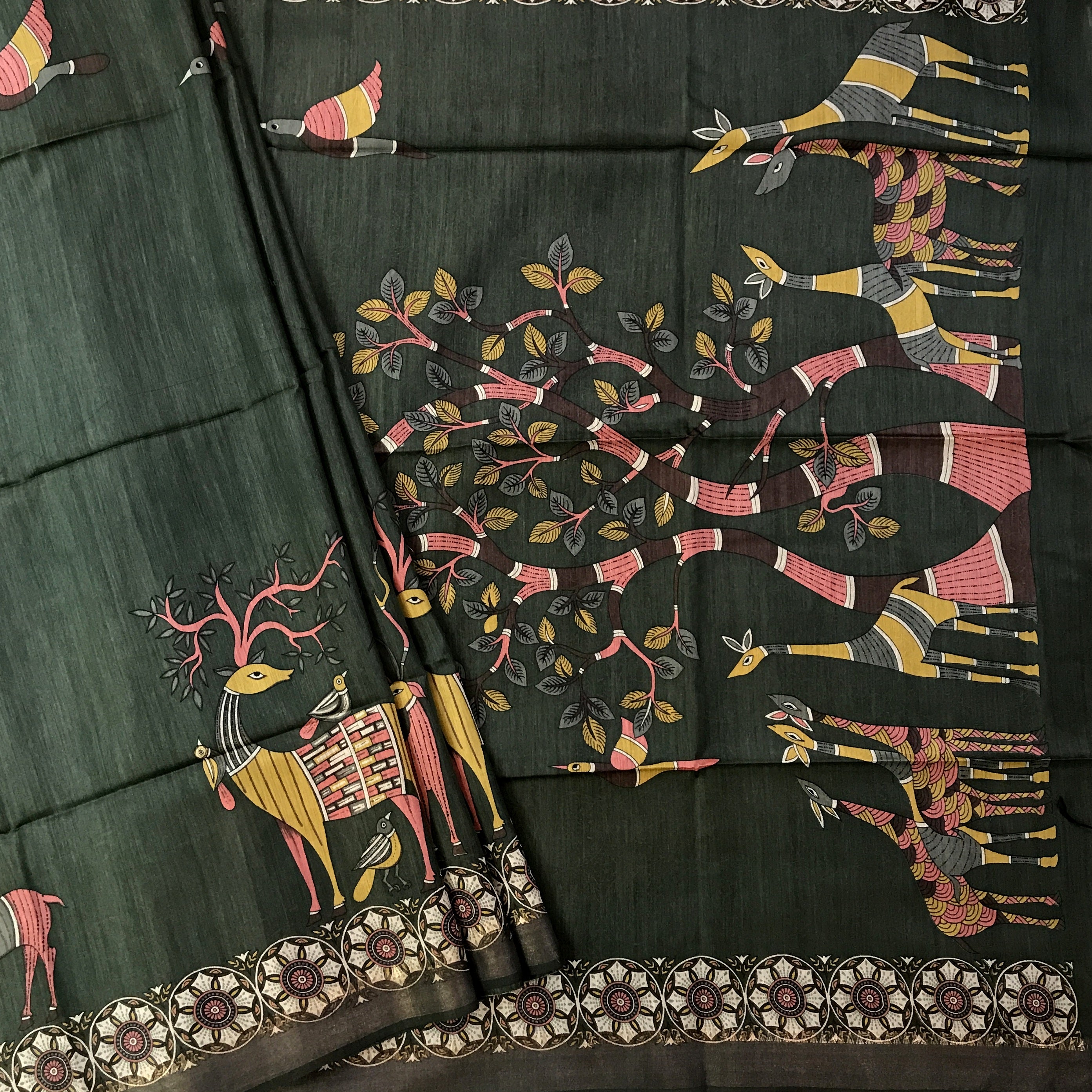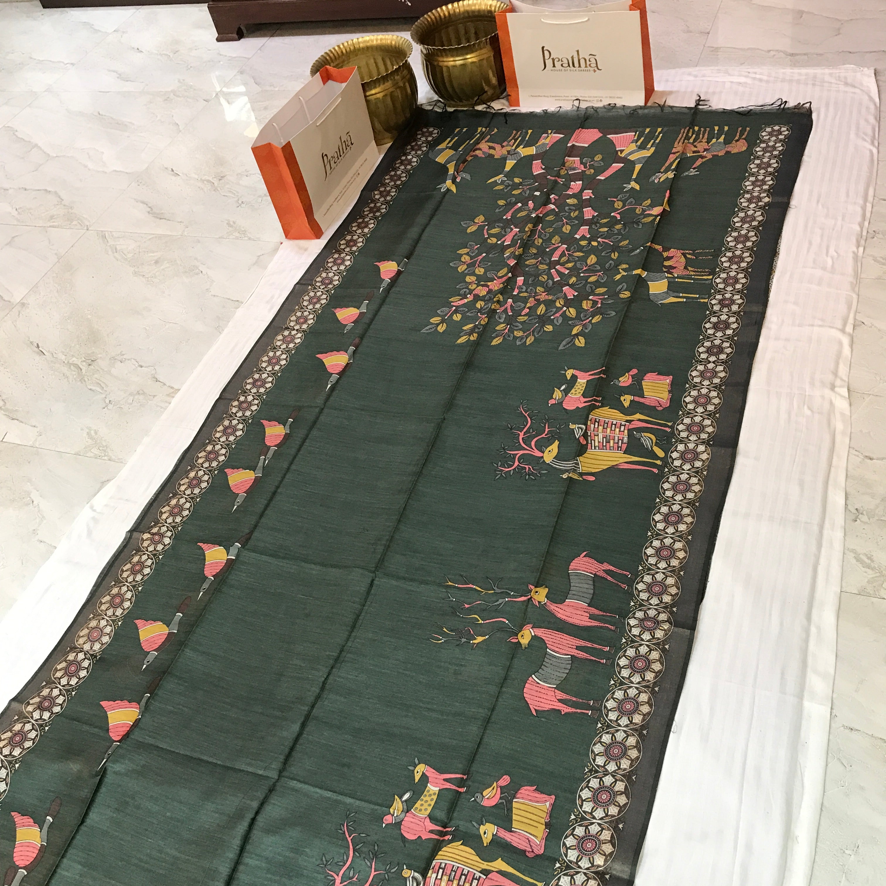 This elegant Green Tussar Silk saree beautifully showcases the essence of traditional Indian artistry with its striking varli print. The saree features detailed tribal motifs depicting musicians and dancers, skillfully illustrated in vibrant hues of green, pink , mustard adding life to the green base. The printed border in subtle brown tones enhances its aesthetic appeal, while the pallu narrates a captivating folk story through intricate artwork. Lightweight and graceful, this saree is perfect for cultural gatherings, festive events, and artistic showcases, where tradition meets contemporary charm with poise.