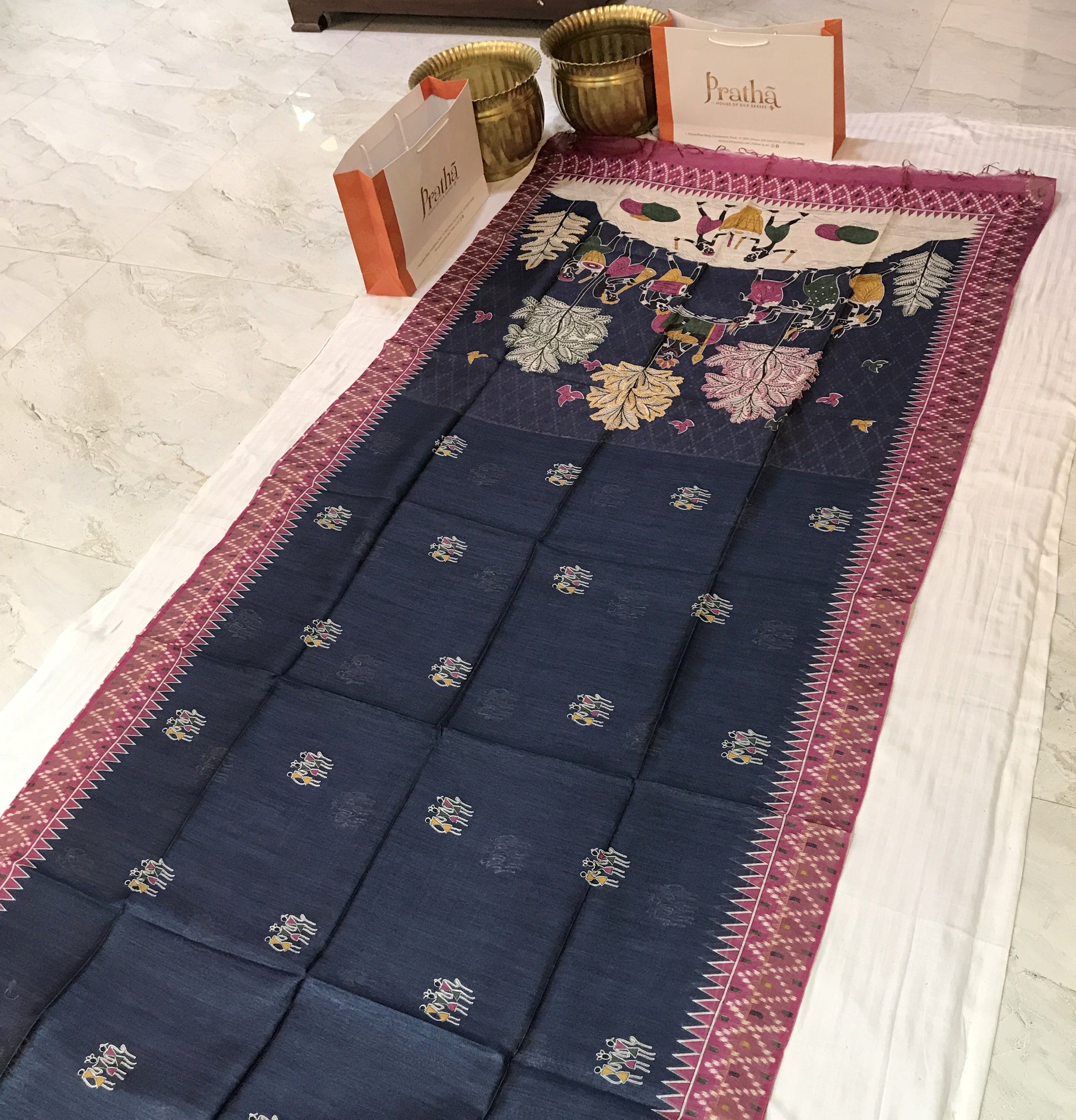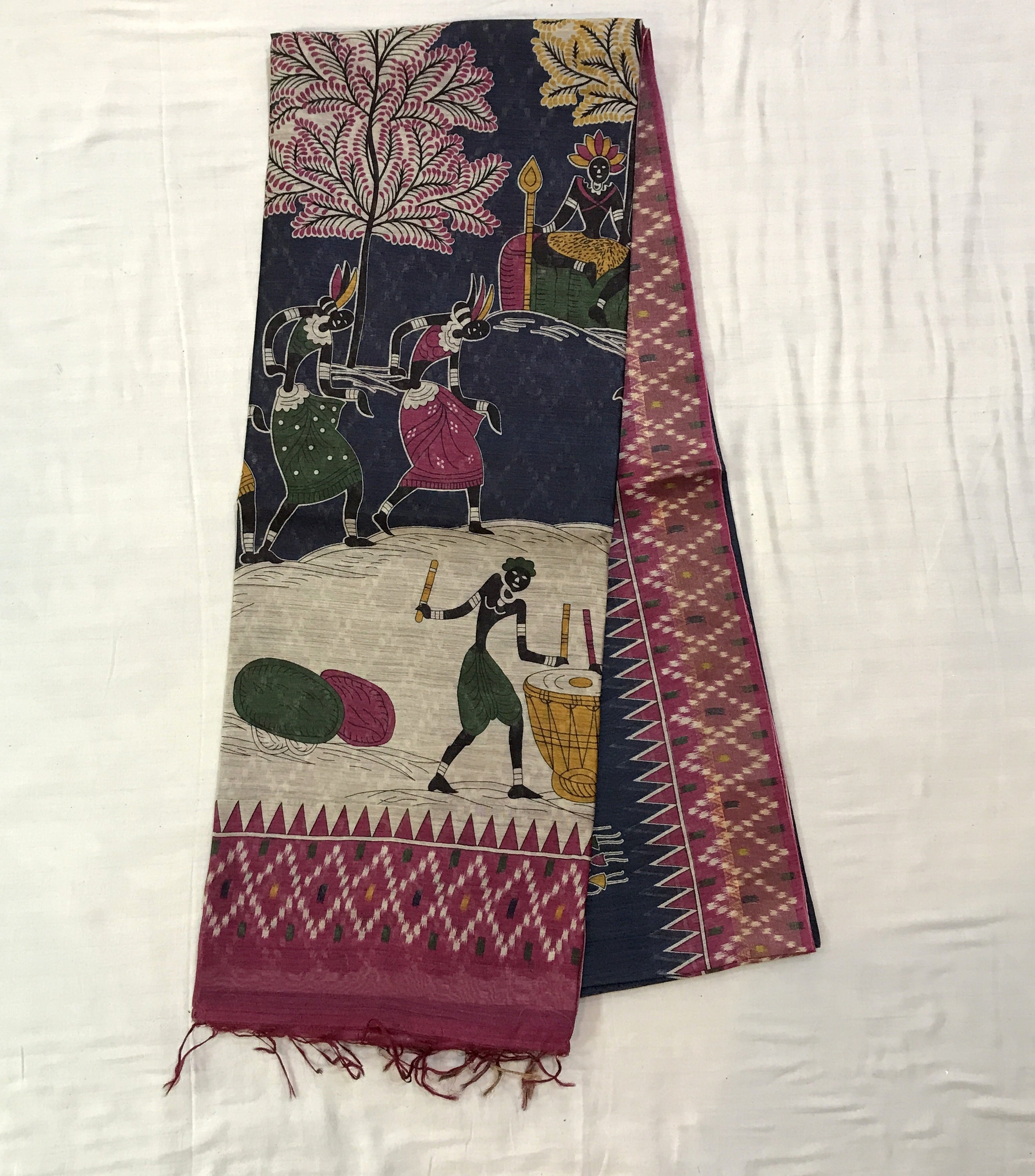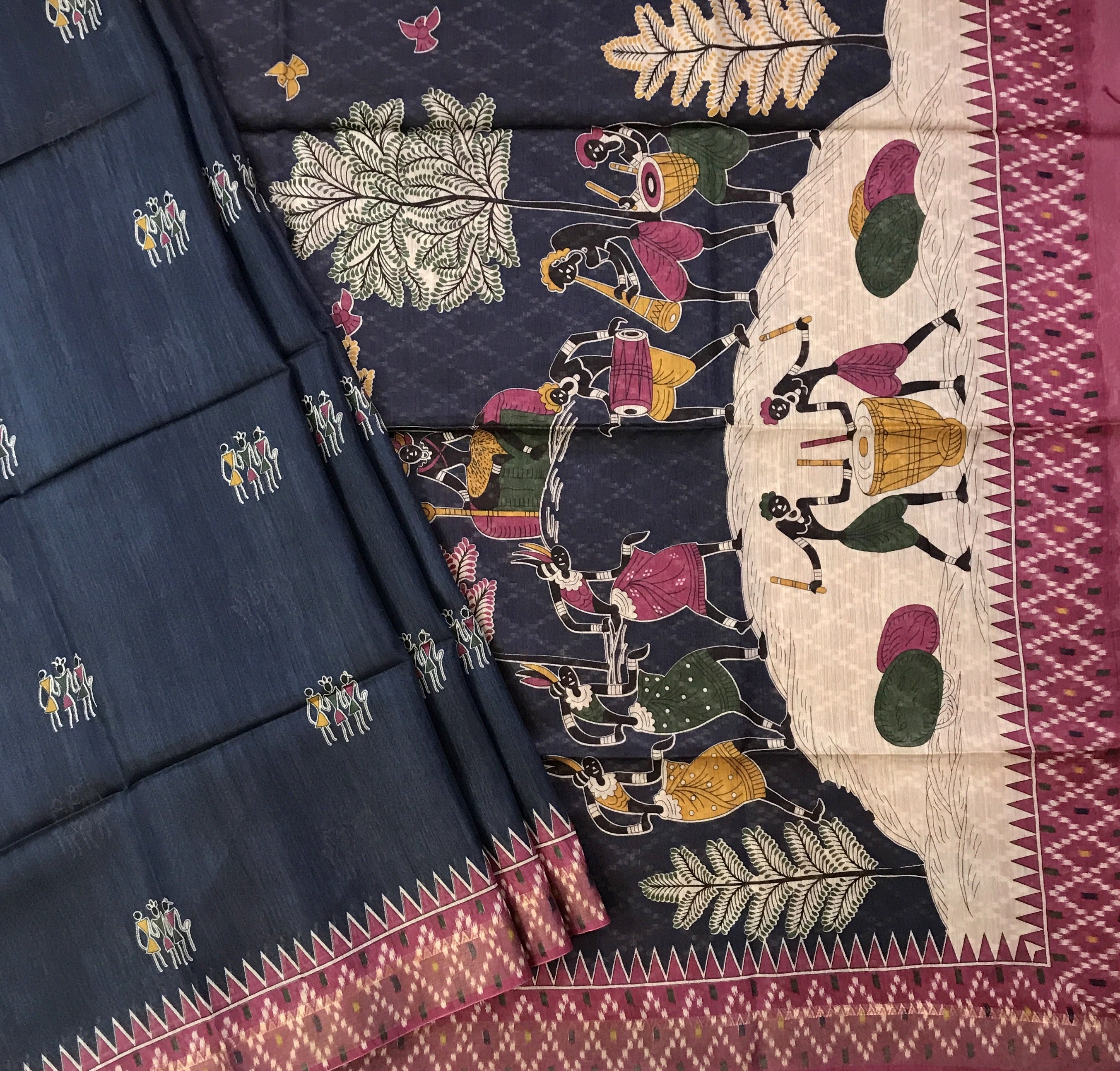 This elegant navy blue Tussar Silk saree celebrates the vibrancy of Indian tribal art through its captivating Warli-inspired print. The saree features intricate motifs of tribal musicians and dancers depicted in lively shades of pink, mustard, green, and ivory, evoking the joyous rhythm of a traditional village festival. The deep navy base enhances the charm of these folk illustrations, while the contrasting pink and ivory Ikat-patterned border lends a rich ethnic finish. The pallu beautifully narrates a festive scene of music, dance, and celebration, making it a perfect blend of culture and craftsmanship. Graceful and lightweight, this saree is ideal for festive gatherings, cultural events, and artistic showcases, exuding a timeless fusion of heritage and elegance.