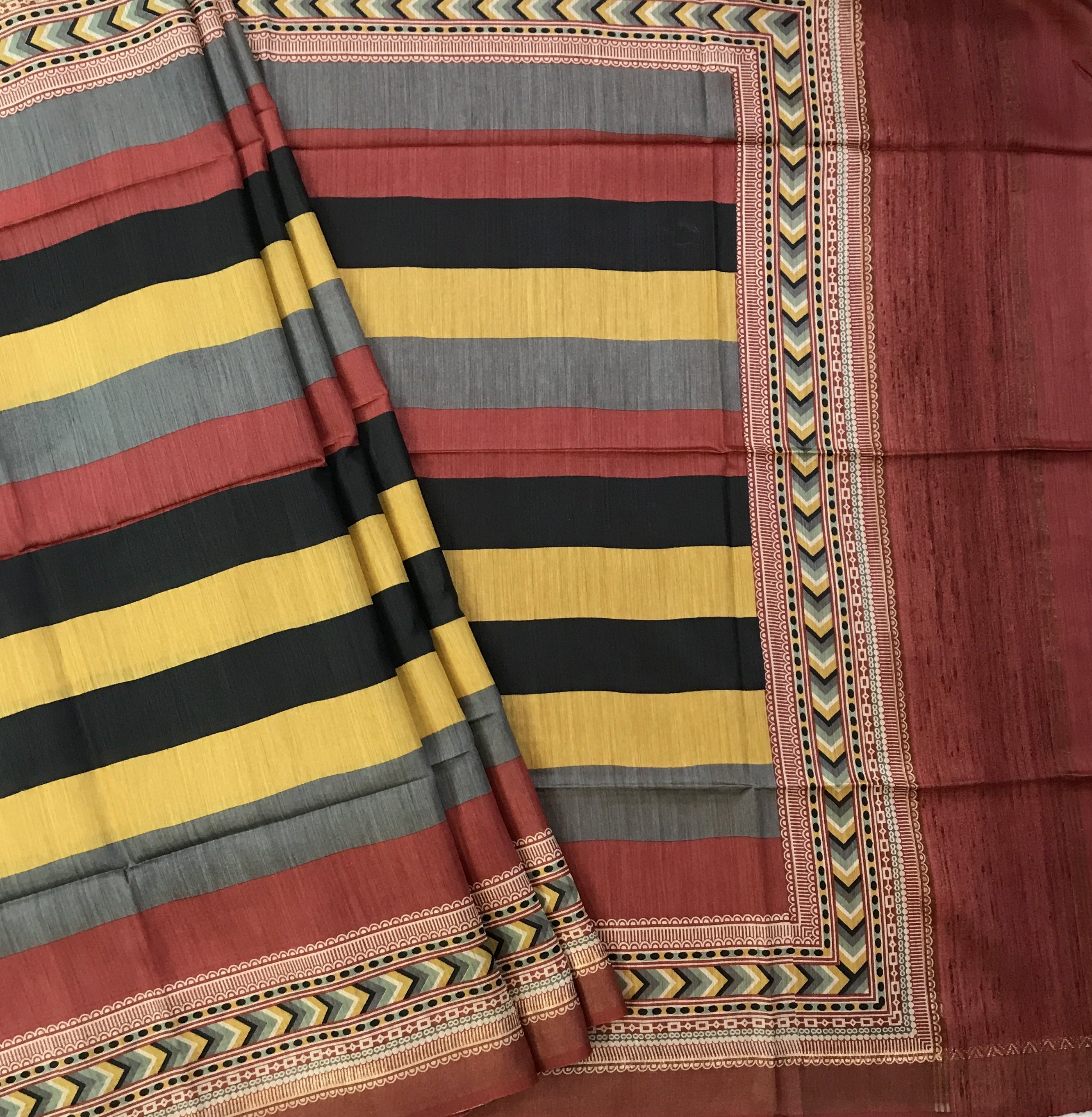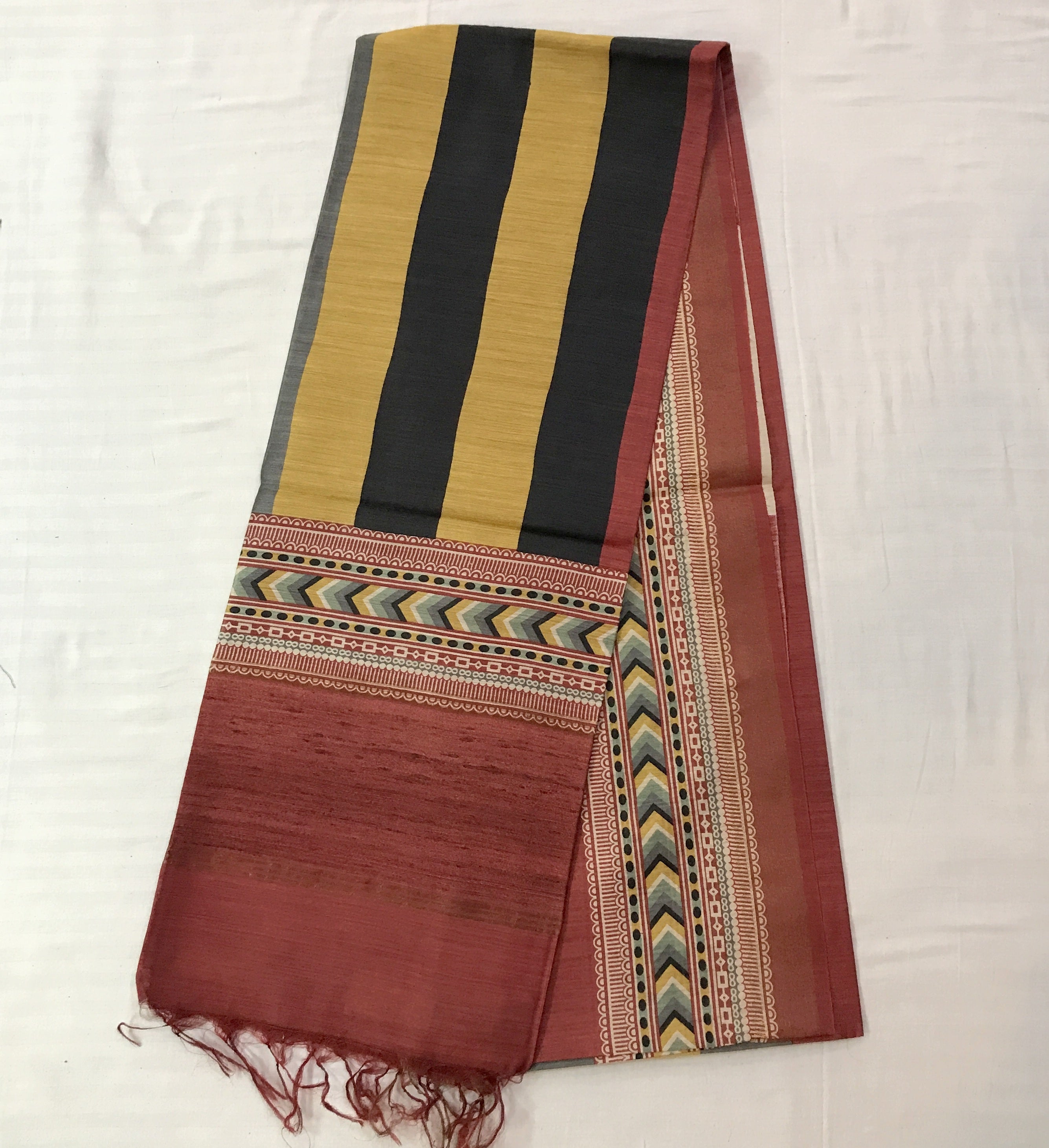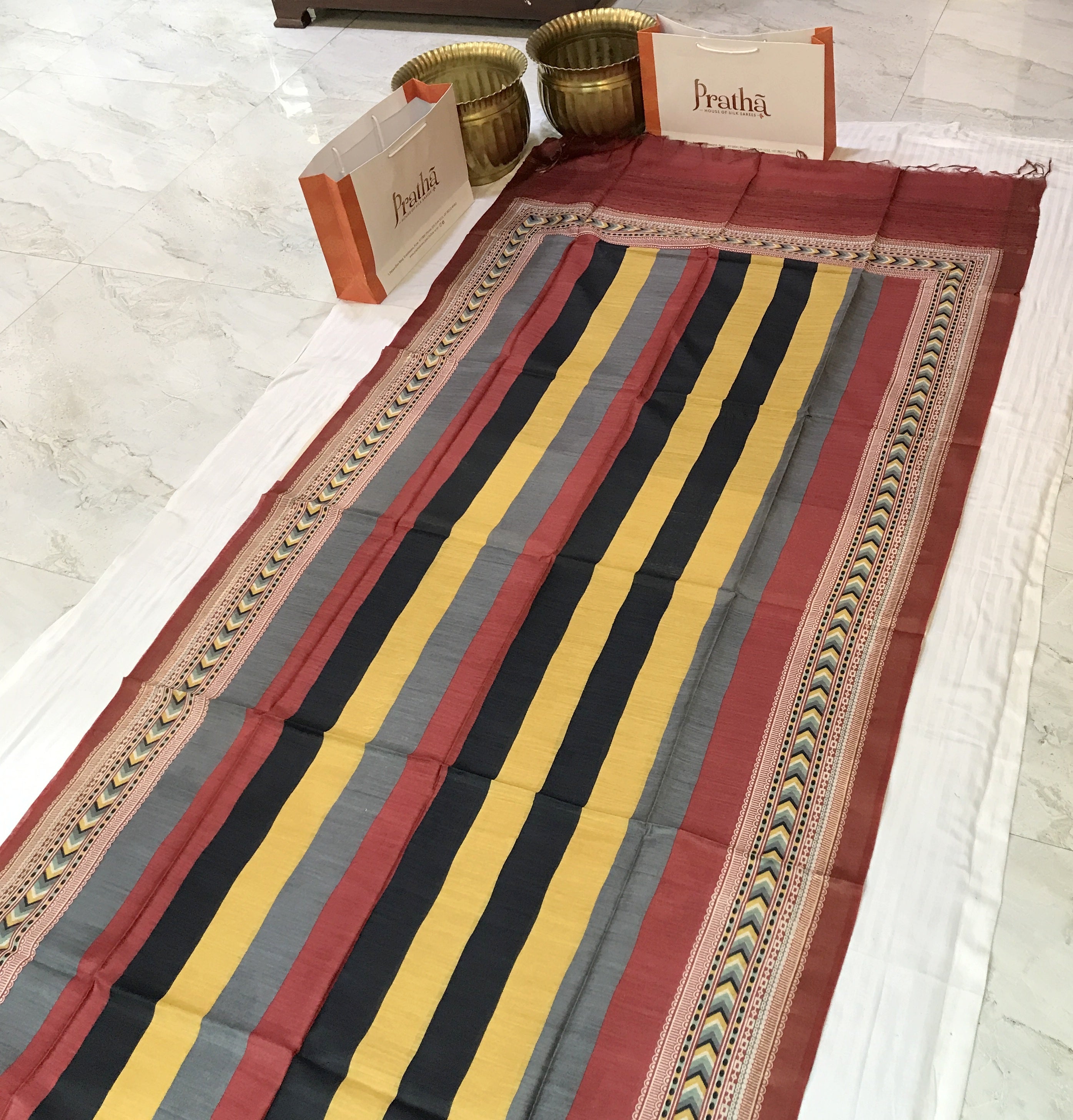 This beautiful saree showcases a harmonious blend of tradition and contemporary style. It features elegant horizontal stripes in shades of Yellow, black, brown, pink that lend it a refreshing and sophisticated look. The subtle sheen of the fabric enhances its graceful drape, making it suitable for both formal and semi-casual occasions. The striking red border with intricate white Ikat-inspired motifs adds a touch of artistry and contrast, completing the saree’s aesthetic appeal beautifully.