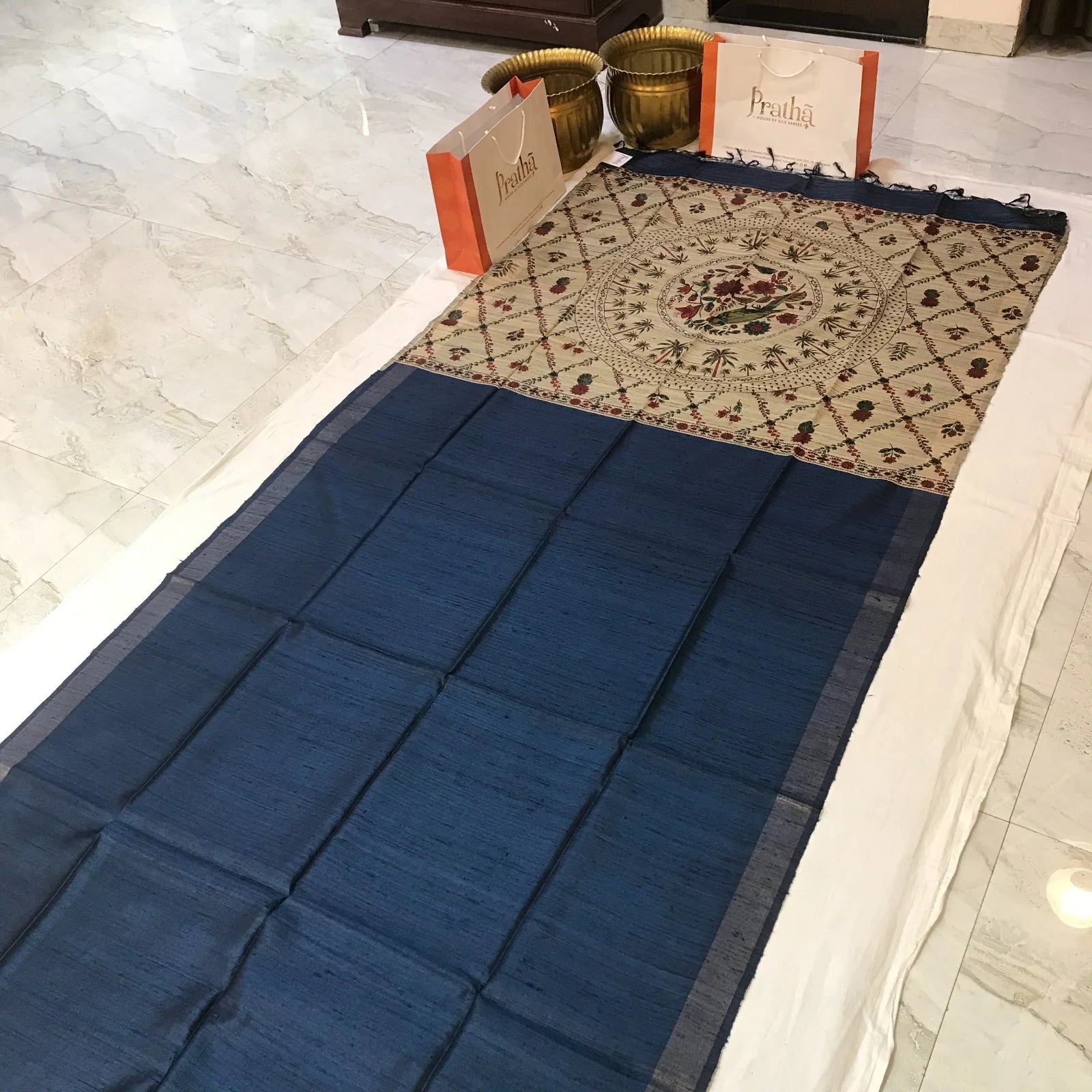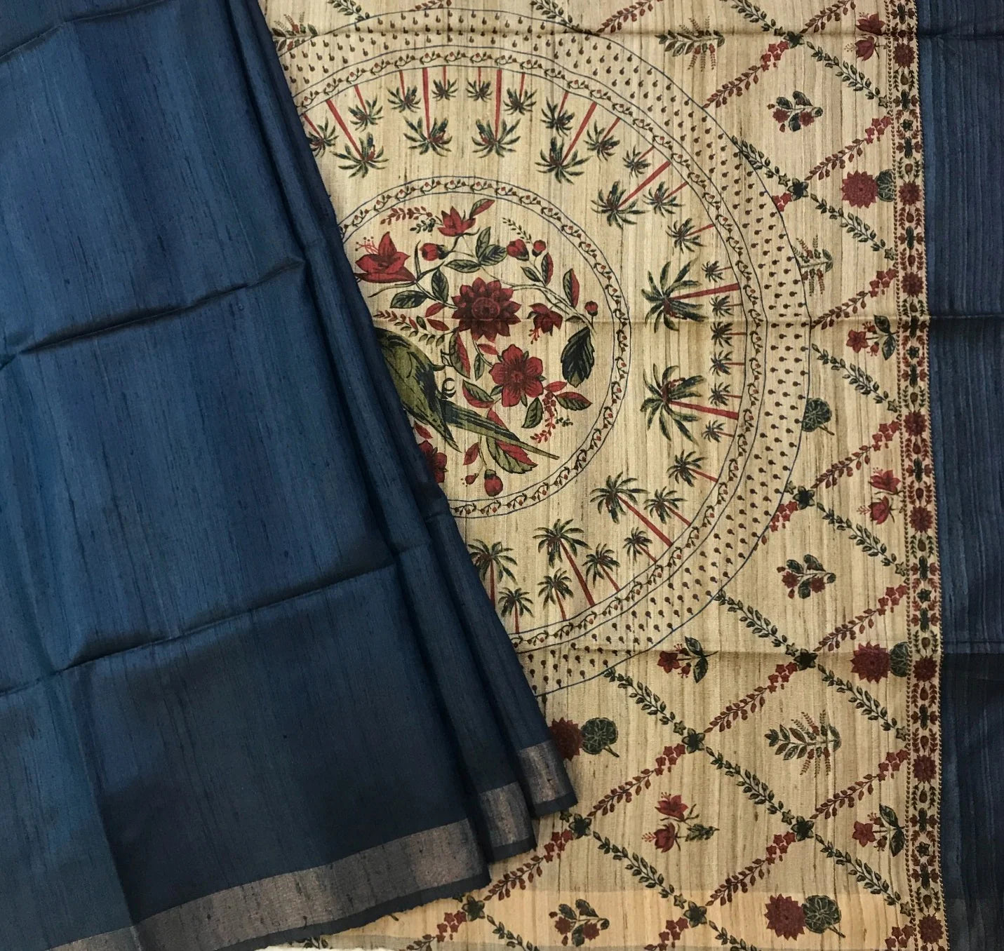 This very beautiful print ( design ) , which looks very unique and great when we wear this saree. This plain blue saree in dupionis Tussar Silk style saree with print design in all over pallu looks fantastic. This saree is light in weight and looks fantastic at corporate events, casual brunches as well as get-togethers.