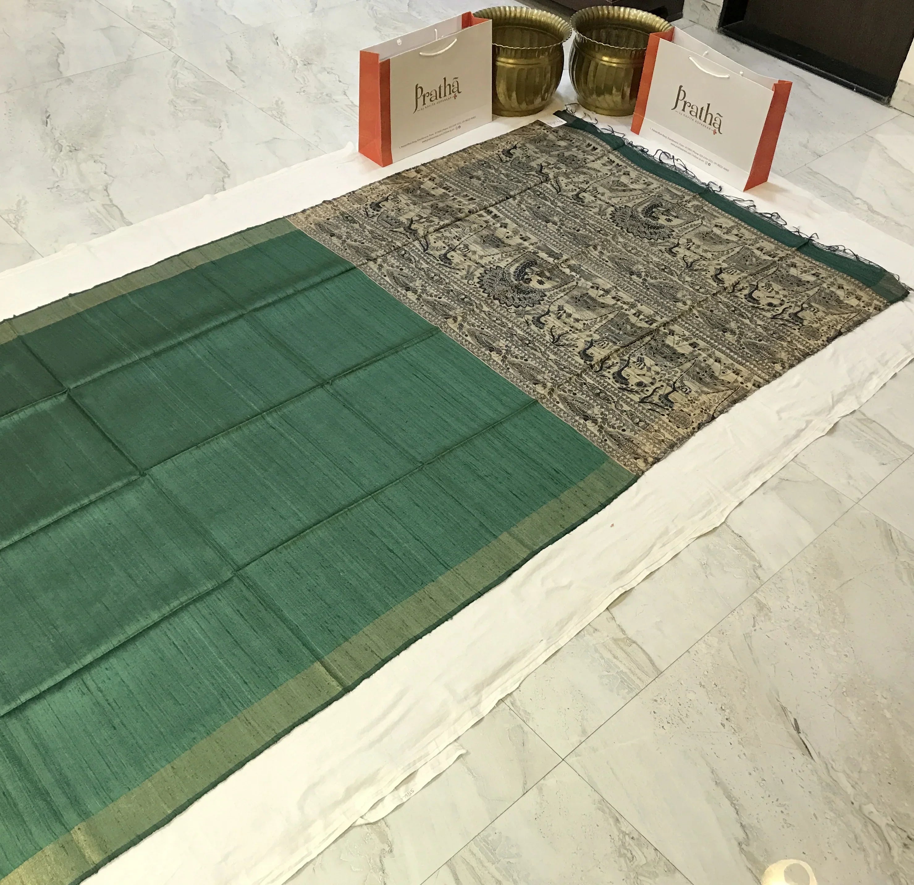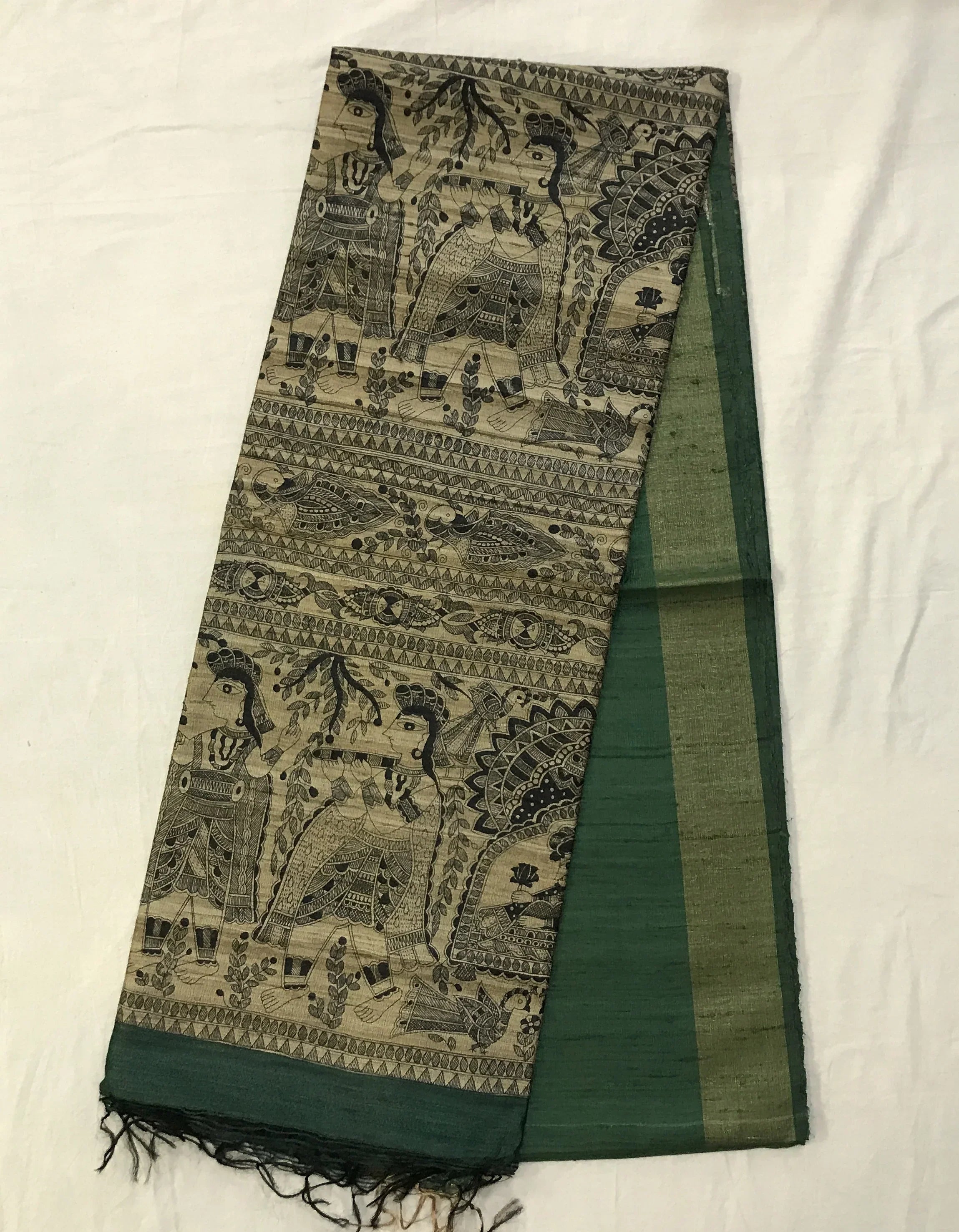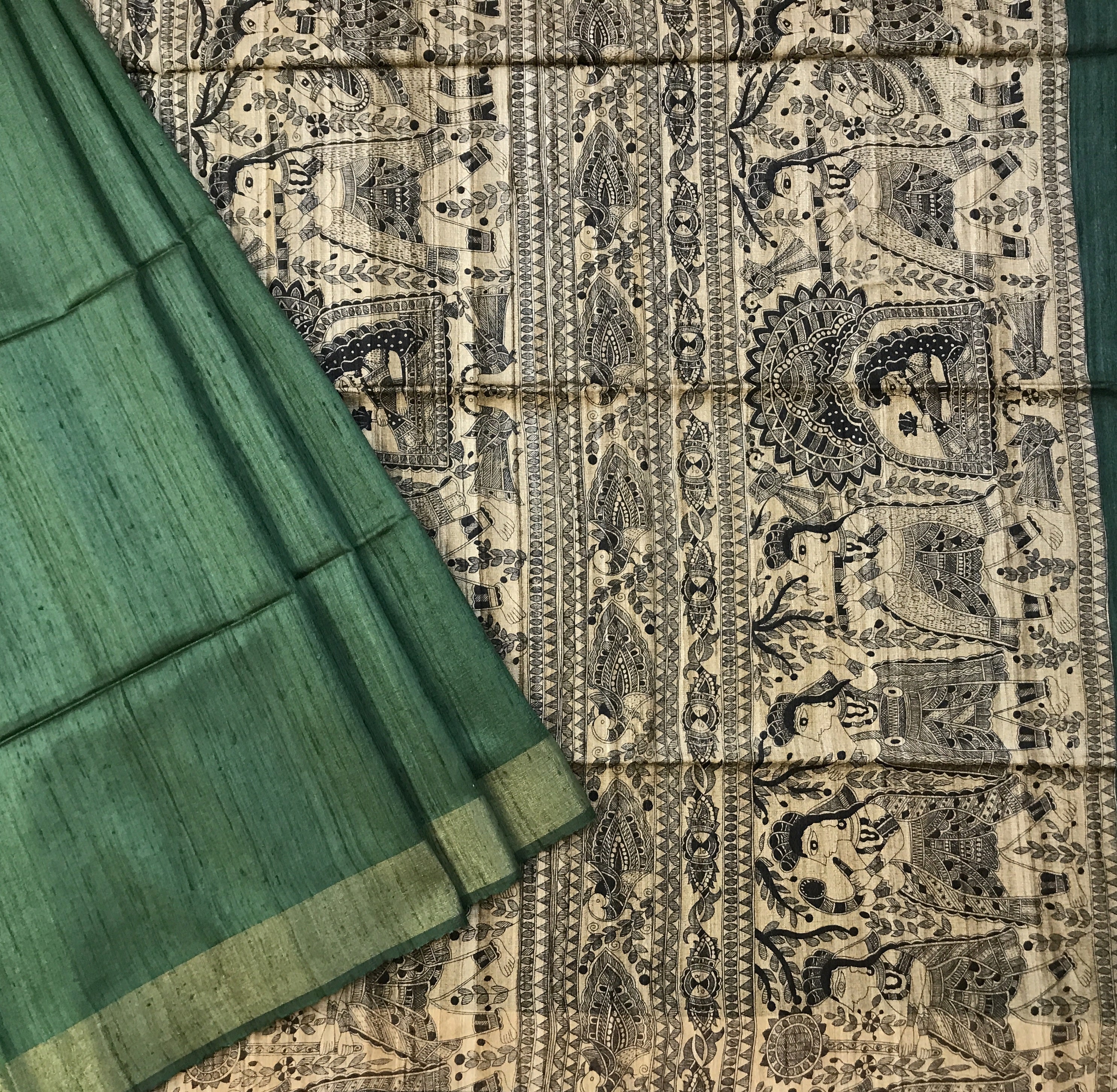 This madhubani print ( design ) is famous art , which looks very unique and great when we wear this saree. This plain green saree in Tussar Silk style saree with madhubani print design in all over pallu looks fantastic. This saree is light in weight and looks fantastic at corporate events, casual brunches as well as get-togethers.