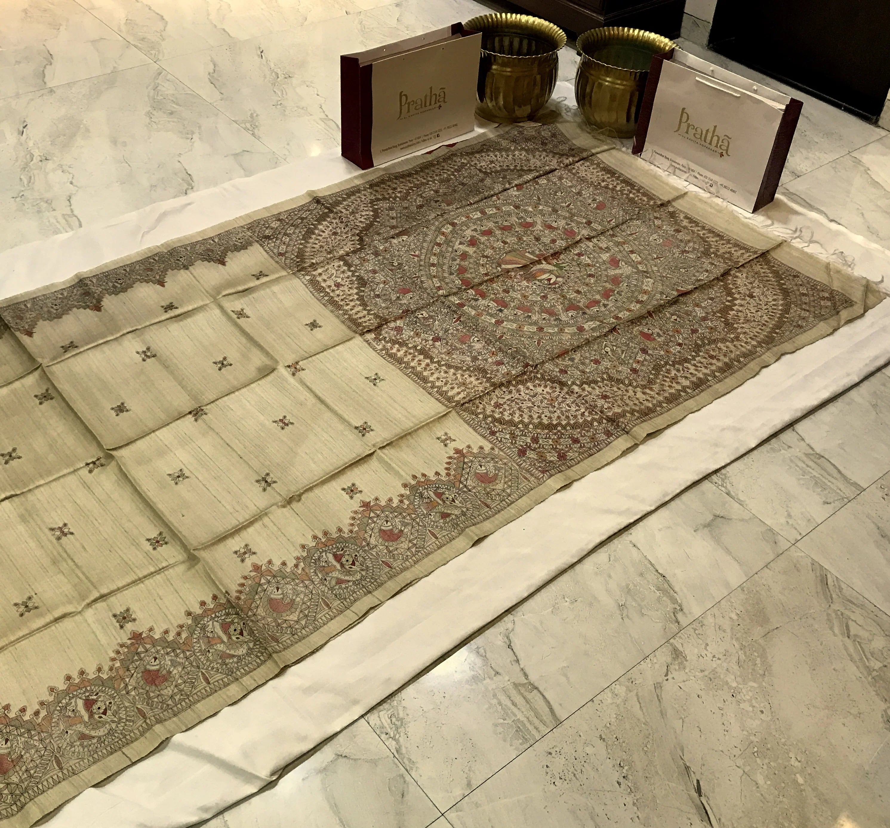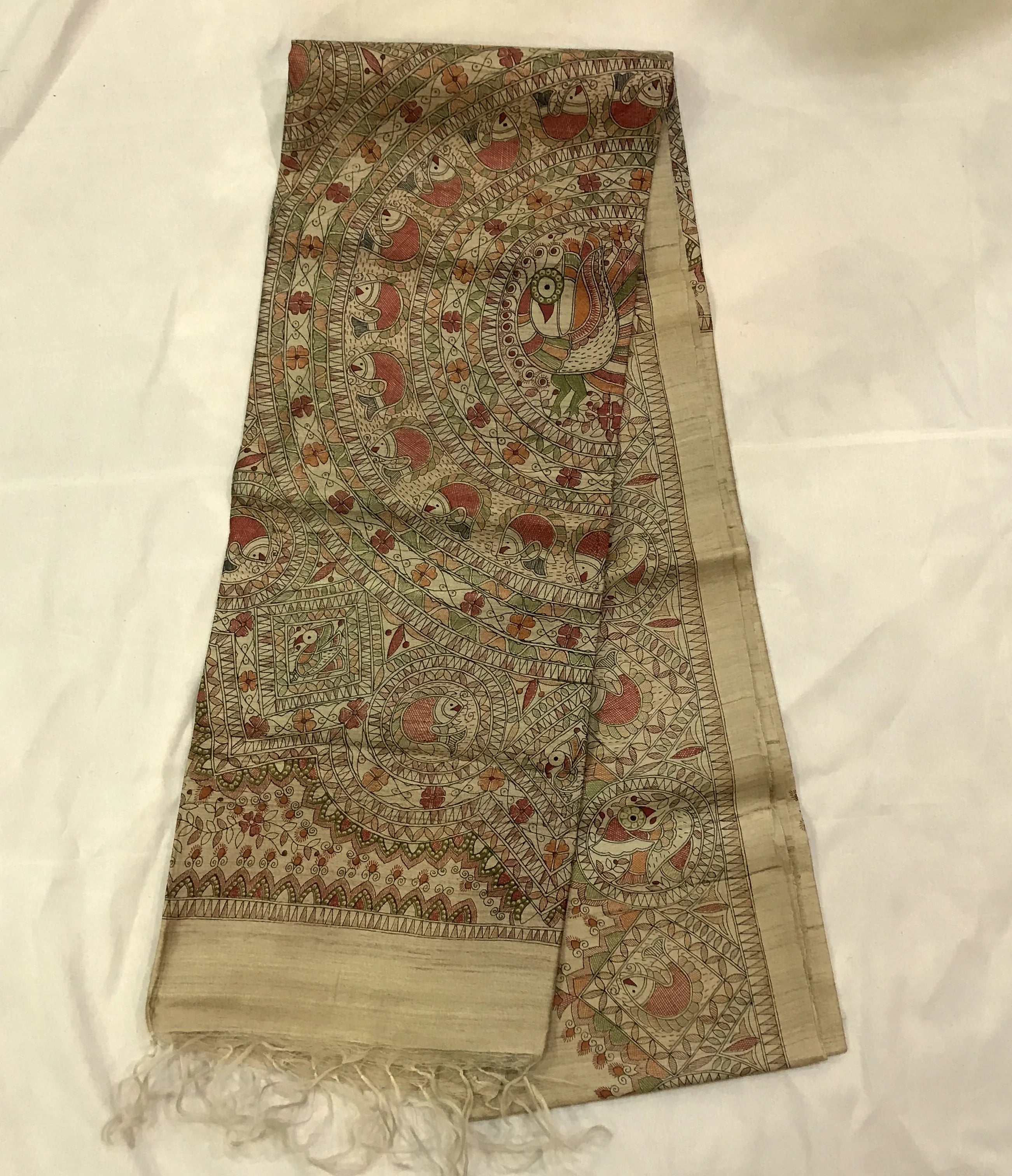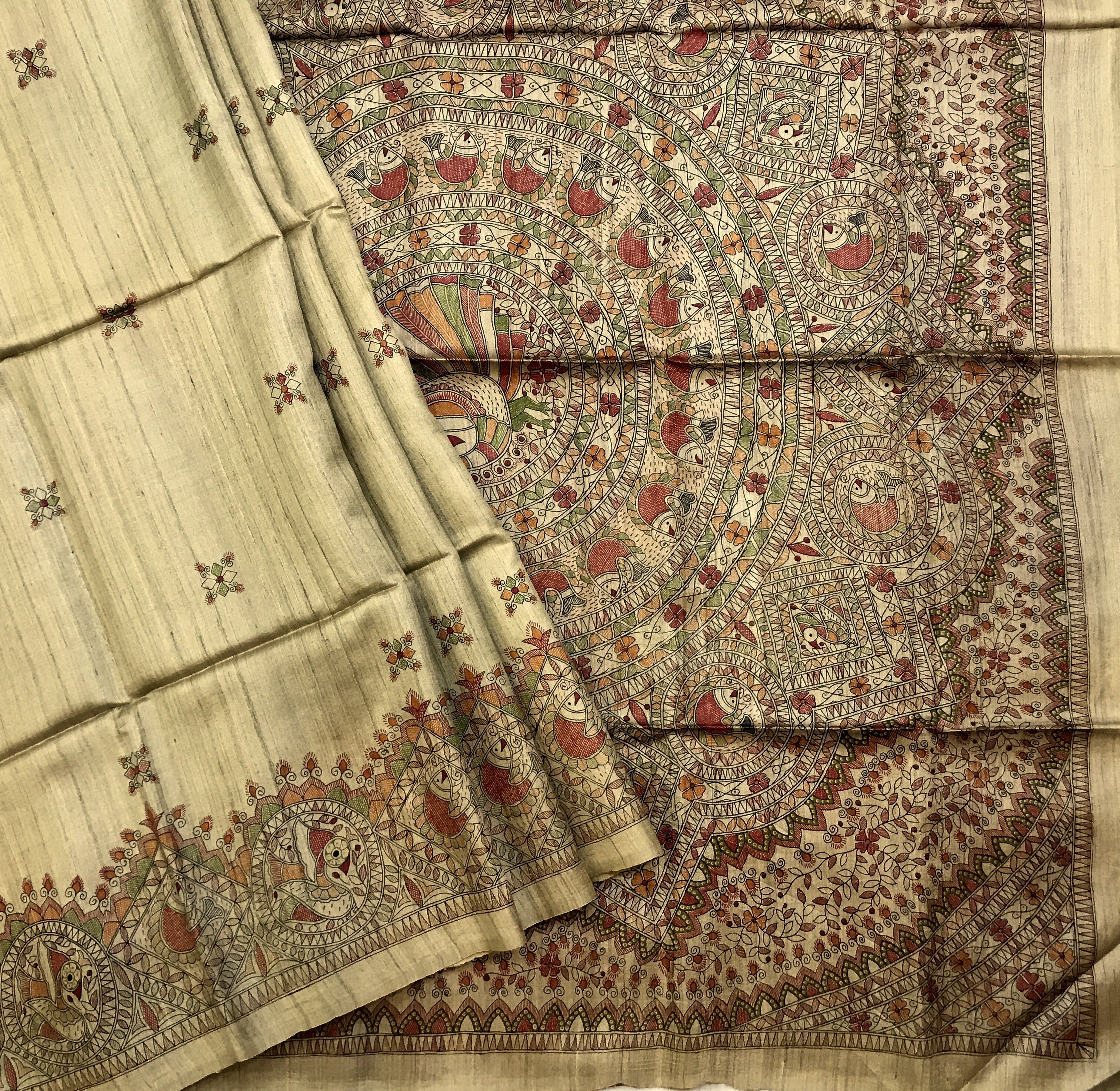A lovely fresh shade of off-white in pure Tussar Silk style saree with madhubani print design in all over pallu looks fantastic. his madhubani print ( design ) is famous art, wchich looks very unique and great when were this saree. This saree is light in weight and looks fantastic at corporate events, casual brunches as well as get-togethers.