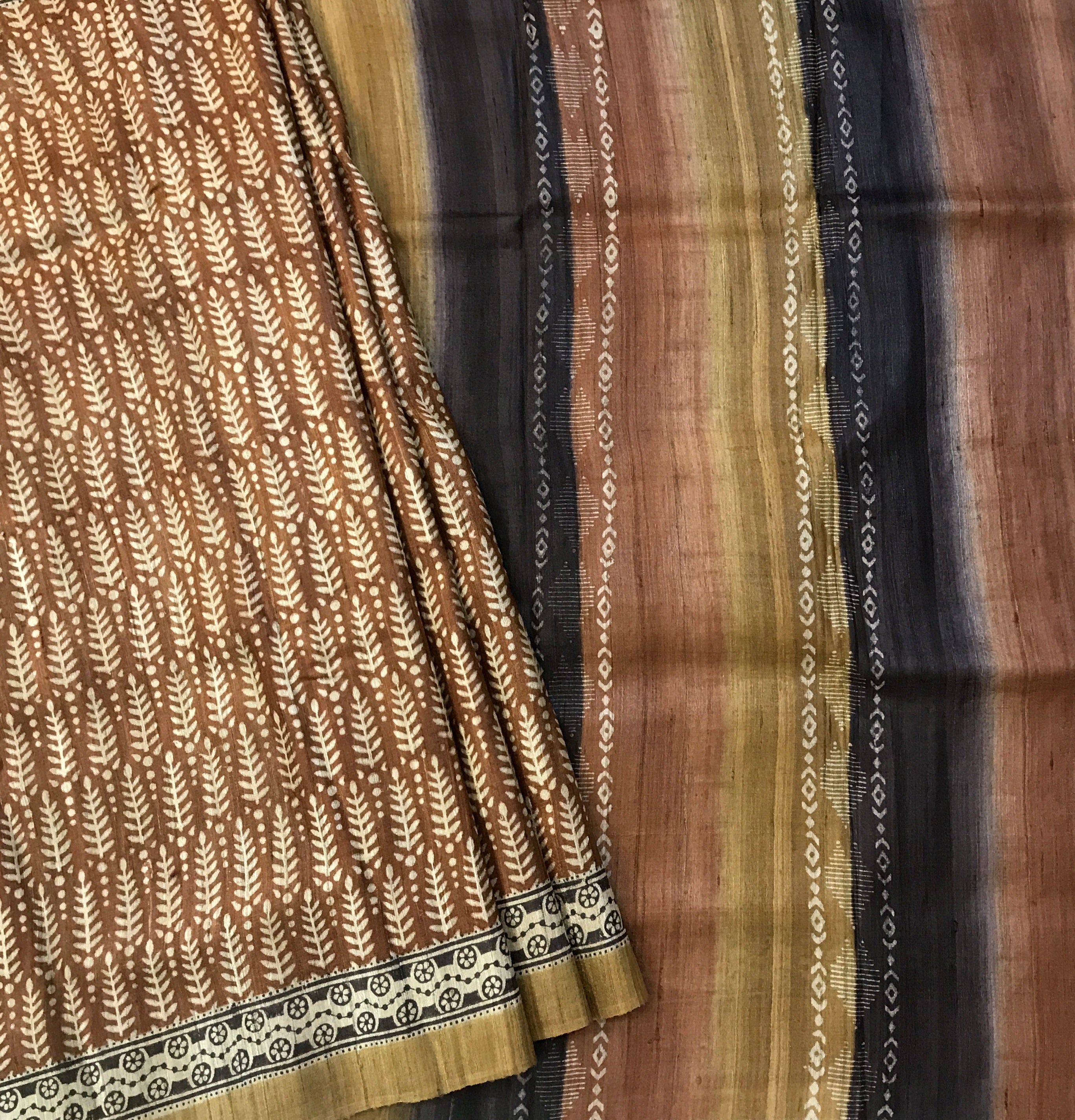 A soothing printed tussar silk saree in a printed design with a combination of all beautiful warm colours, this saree is a keepsake. The brown and black coloured pallu adds a quirk to the otherwise traditional. From a casual friends meet, to a brunch and from an office meeting to a n evening party, this one is a perfect classy outfit for all!