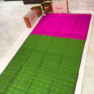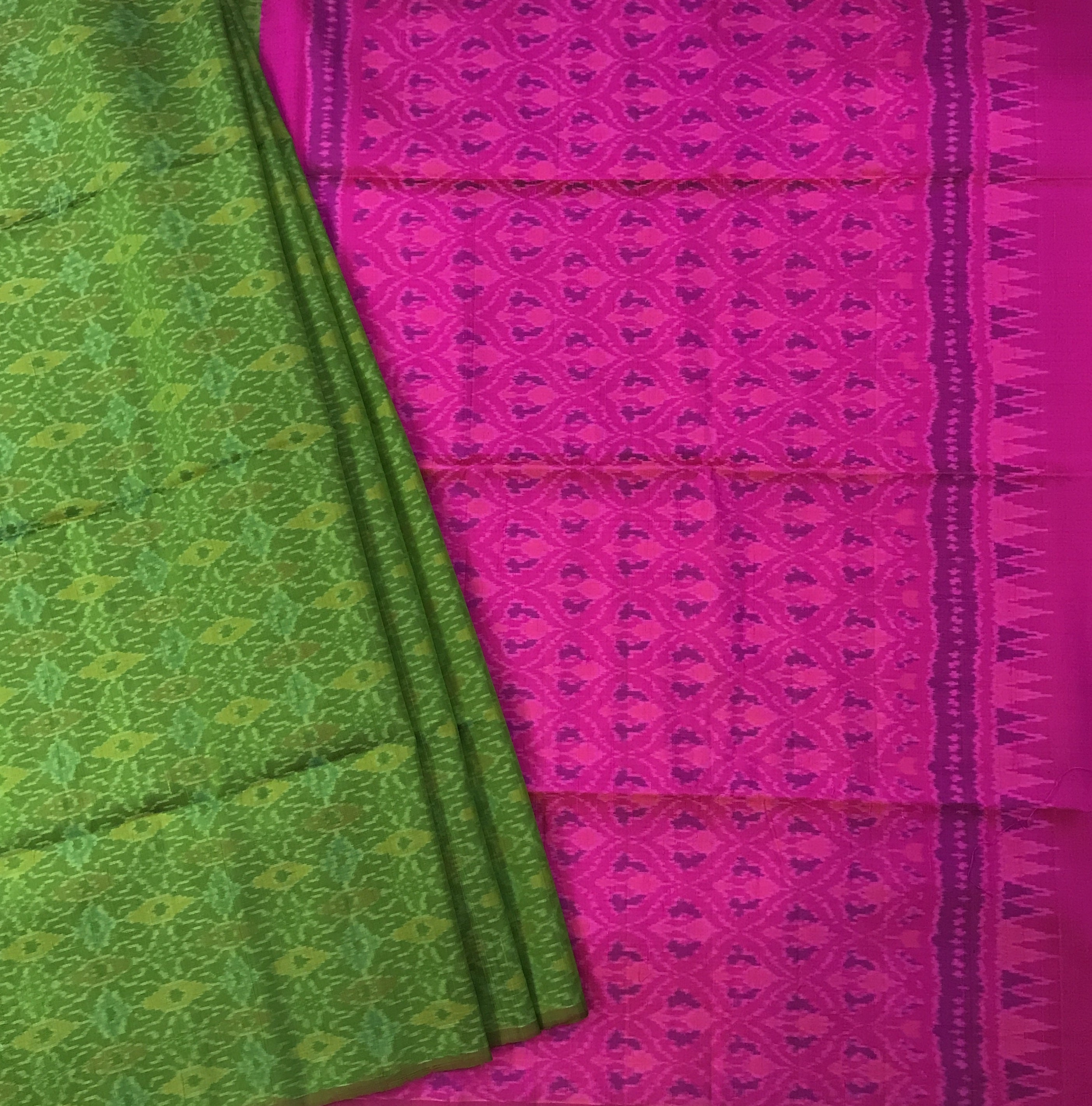 A classic Leaf green coloured Raw Silk ikkat saree with its traditional ikkat print design all over the saree, this one is special! A very pretty ikkat design all over the body looks classy with the a stunning green colour plain border and pink pallu makes this one festive!