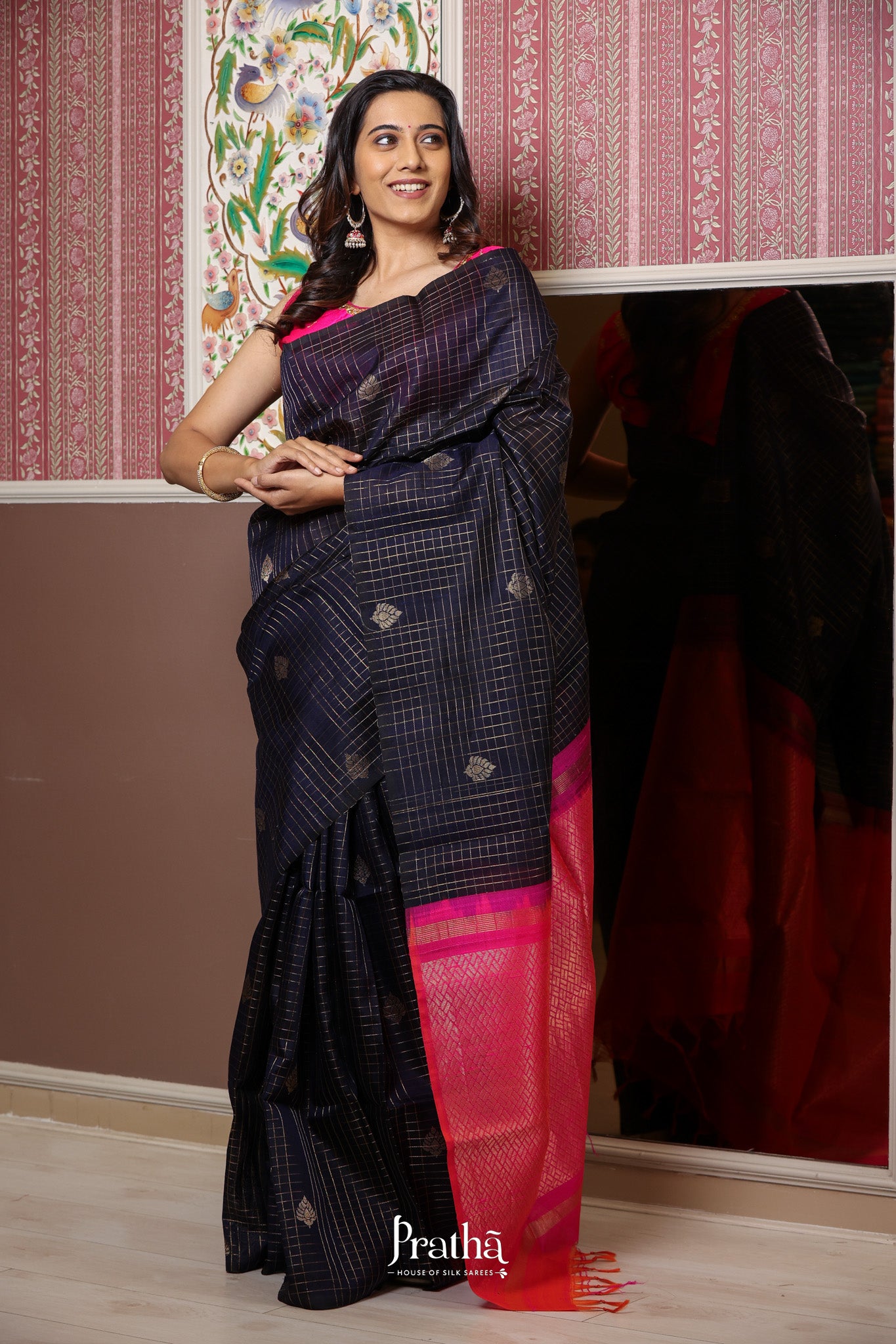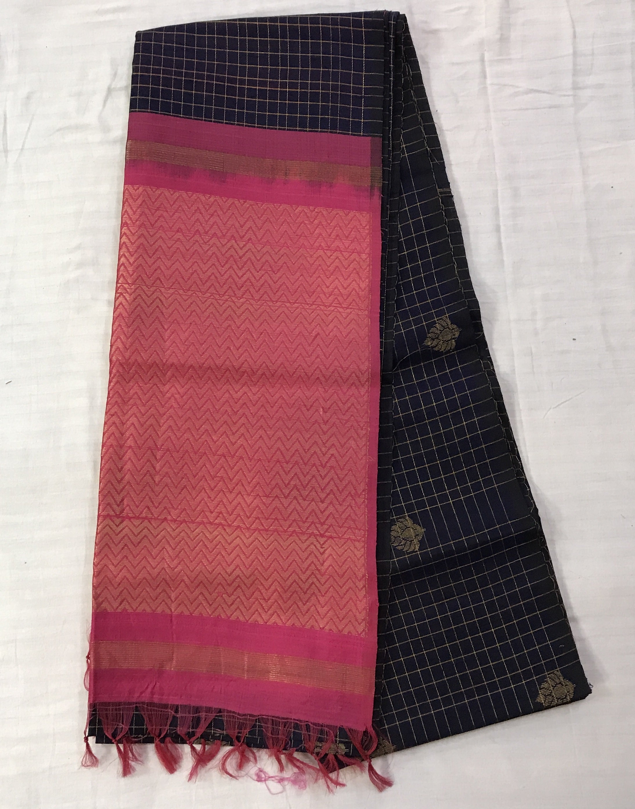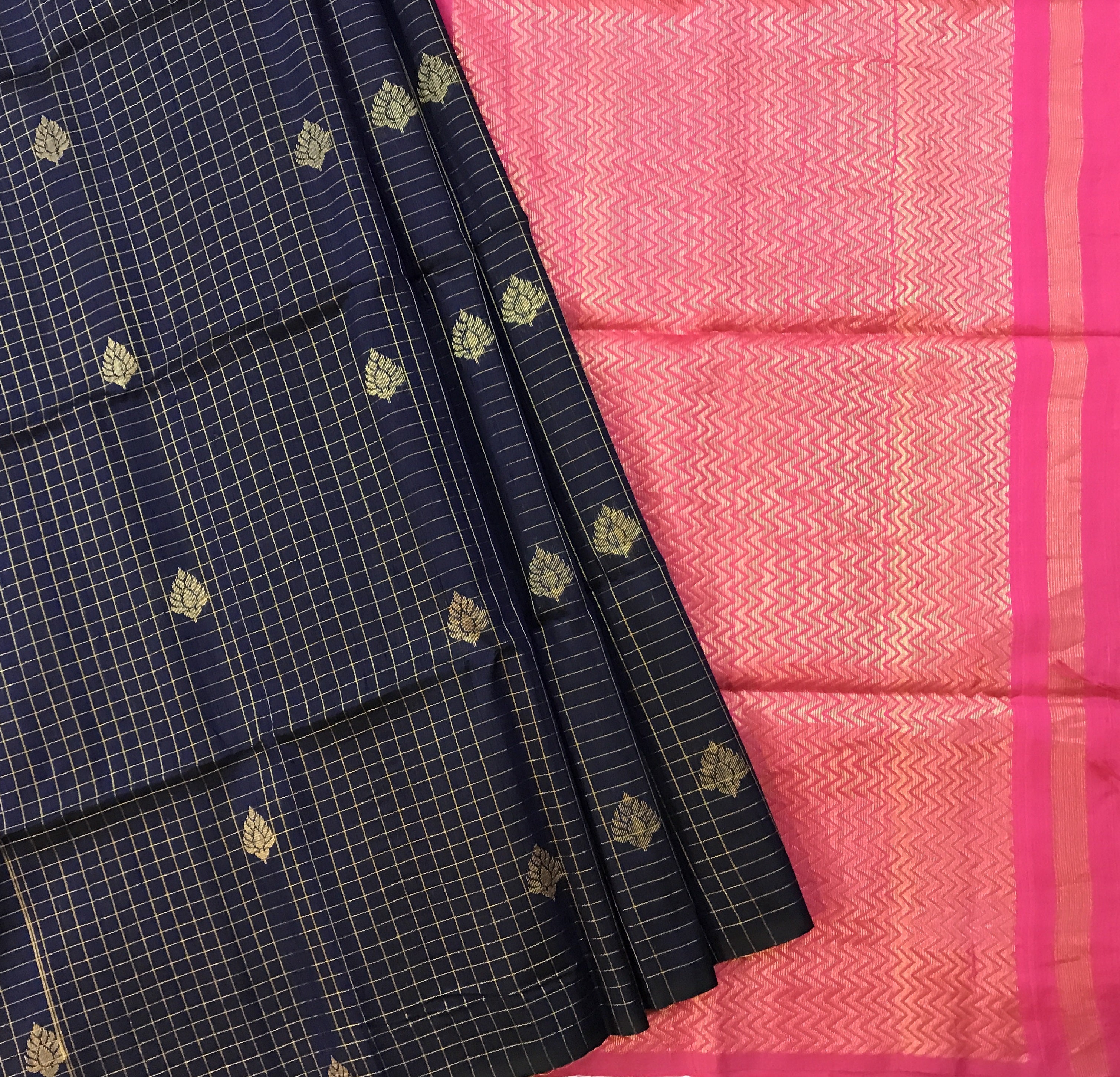 A blue raw silk with a zari checks and butta , running through the saree, looks ravishing. with the contrast pink pallu this saree is adorable. May you be casual or at a party, or a small function, you can flaunt it at anywhere.