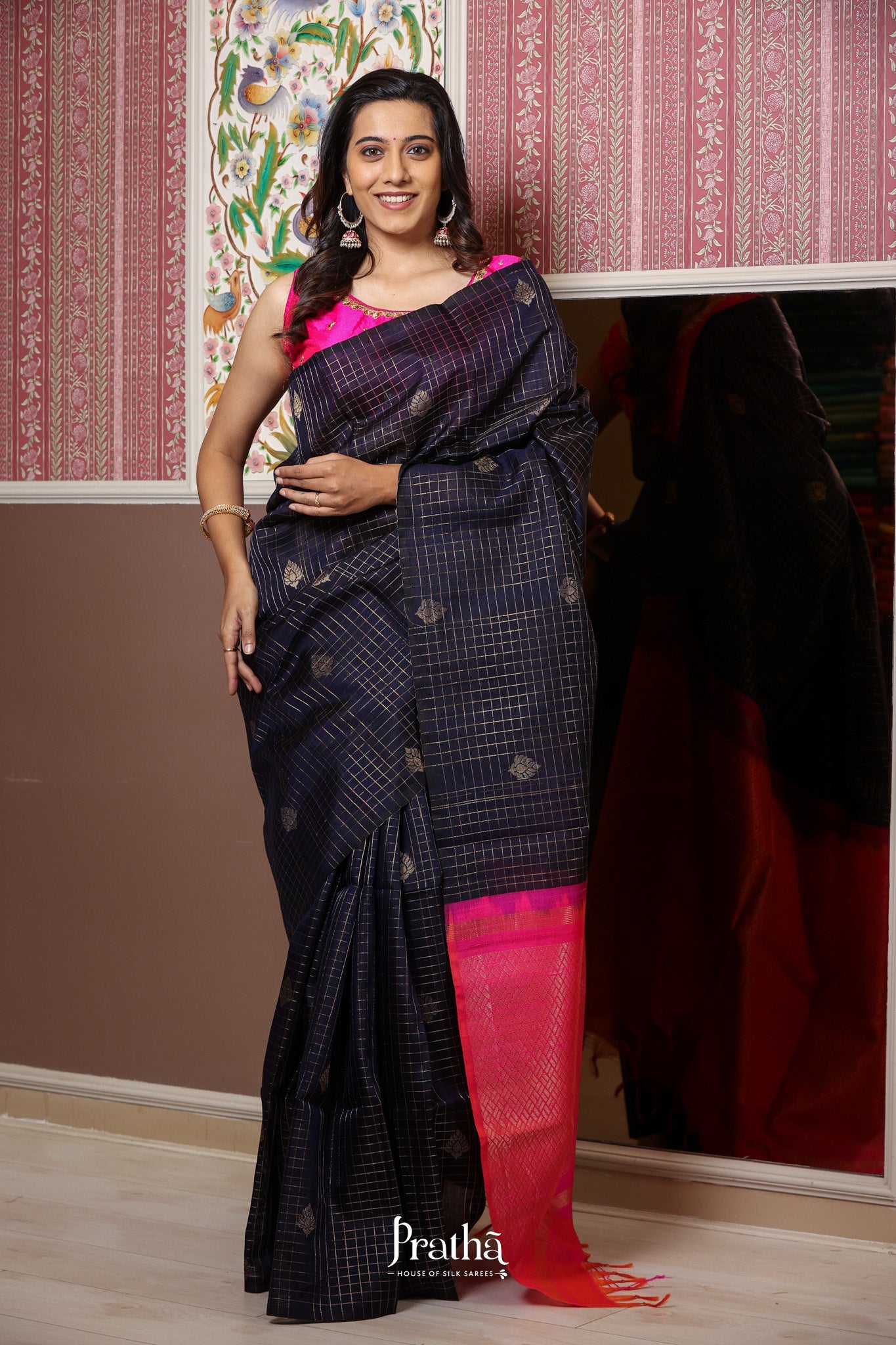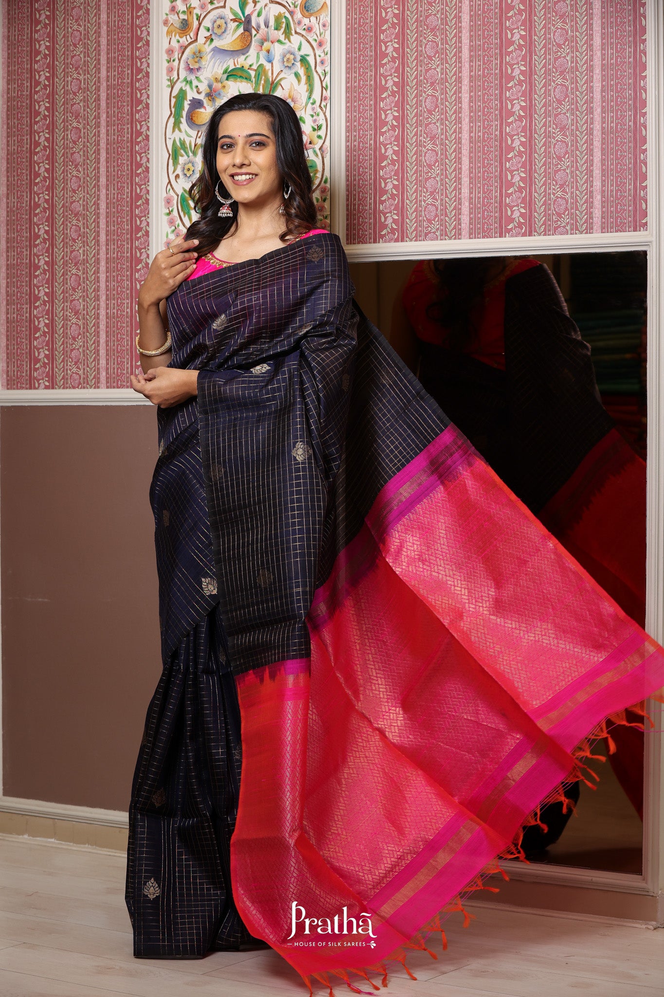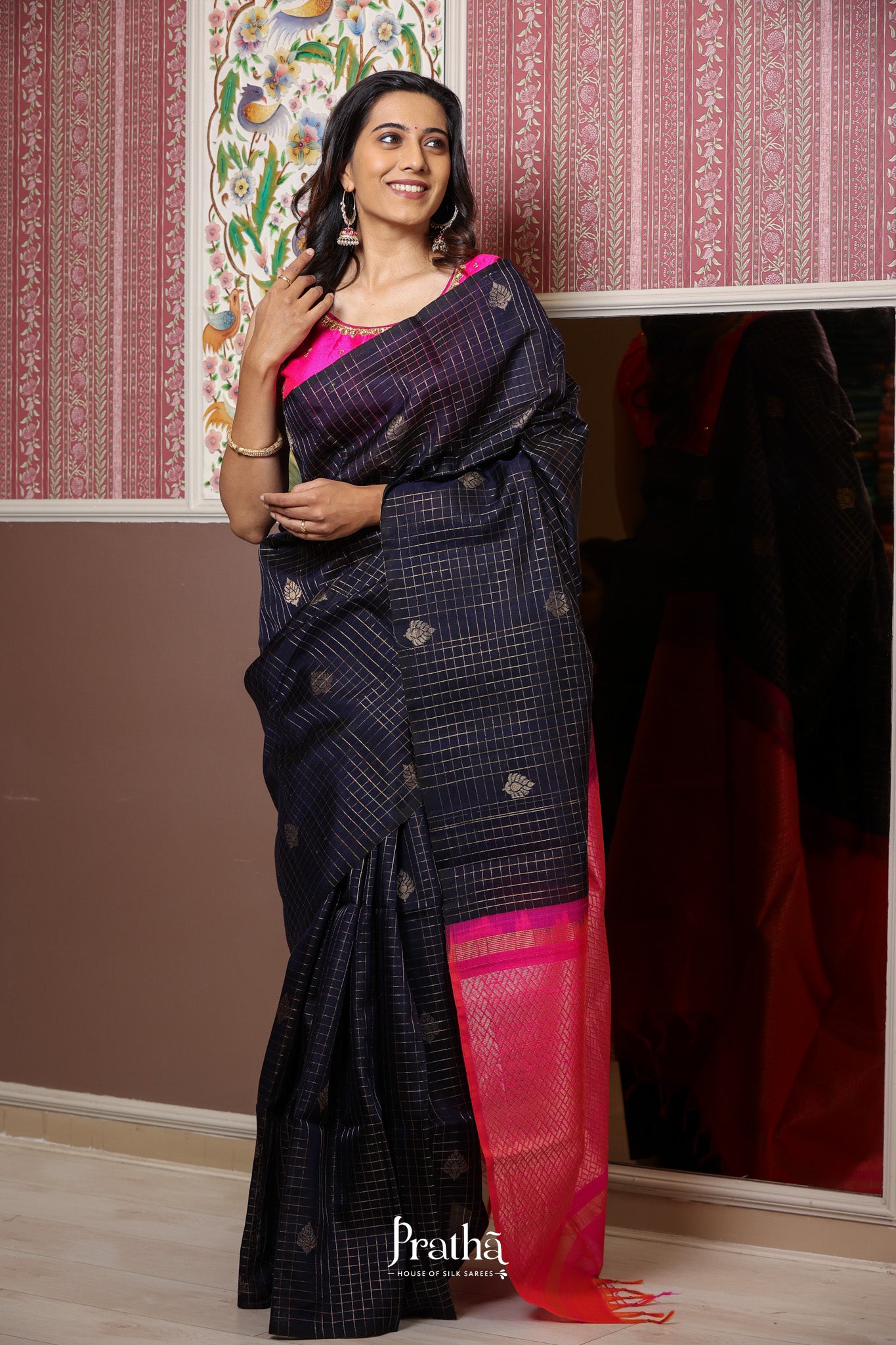 A blue raw silk with a zari checks and butta , running through the saree, looks ravishing. with the contrast pink pallu this saree is adorable. May you be casual or at a party, or a small function, you can flaunt it at anywhere.