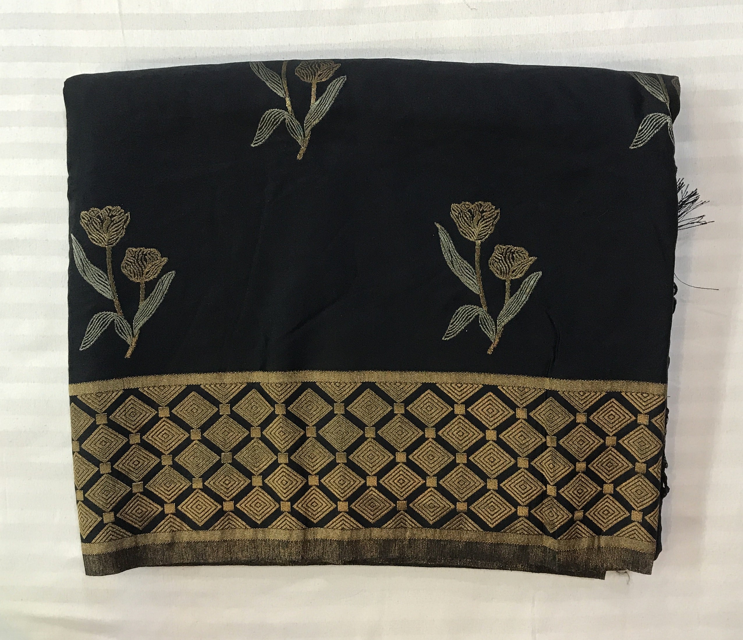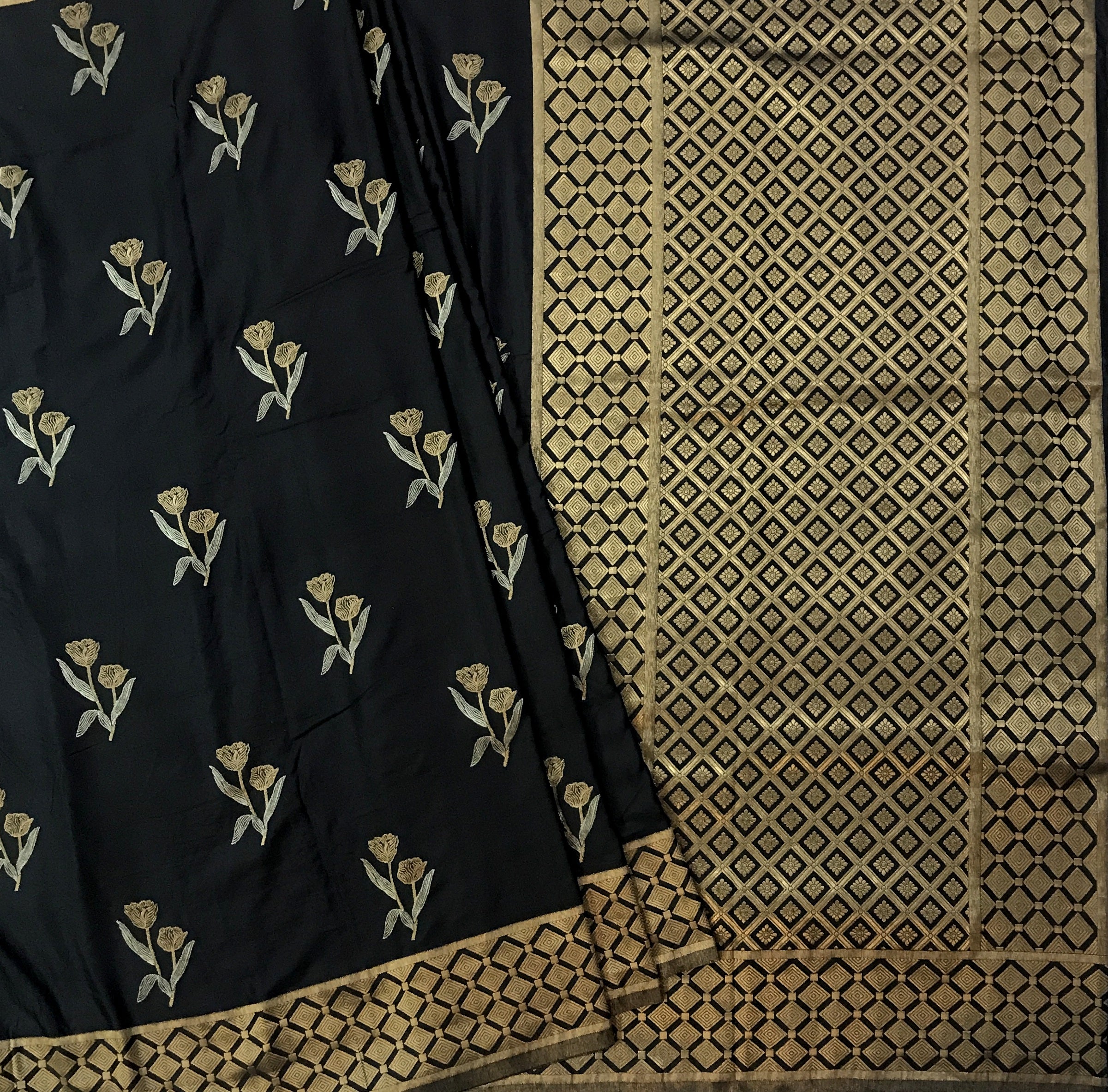 Stylish and timeless, this black silk saree is adorned with leaf motifs that bring a bold, artistic flair. The look is elevated by a beautifully crafted intricate border, making it a perfect pick for celebrations and special events.