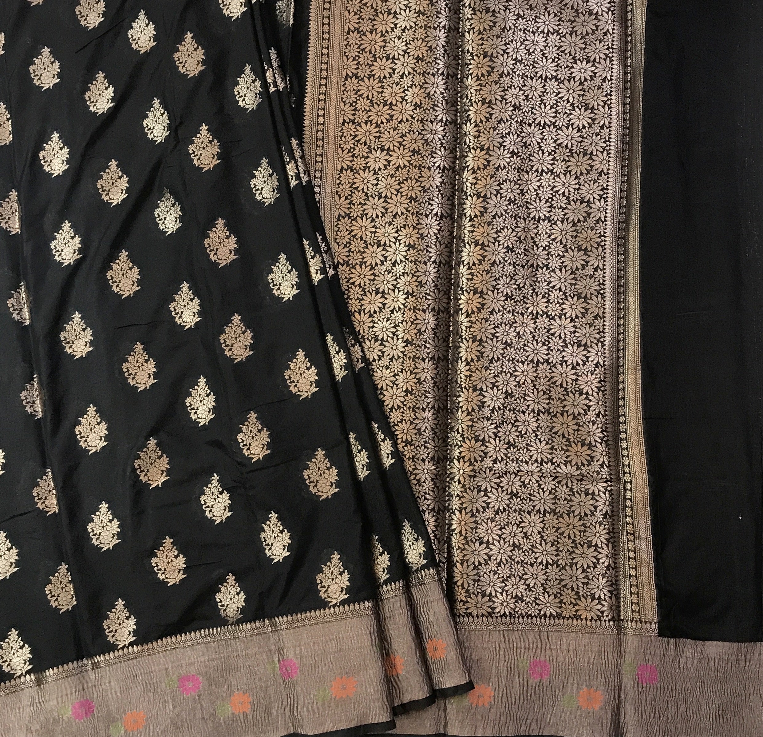 A stunning black saree adorned with rich copper floral buttis, paired with an intricately woven pallu featuring all-over zari floral patterns. The subtle tissue-style meenakari border with charming colourful accents adds a unique and graceful touch, making it perfect for festive occasions.