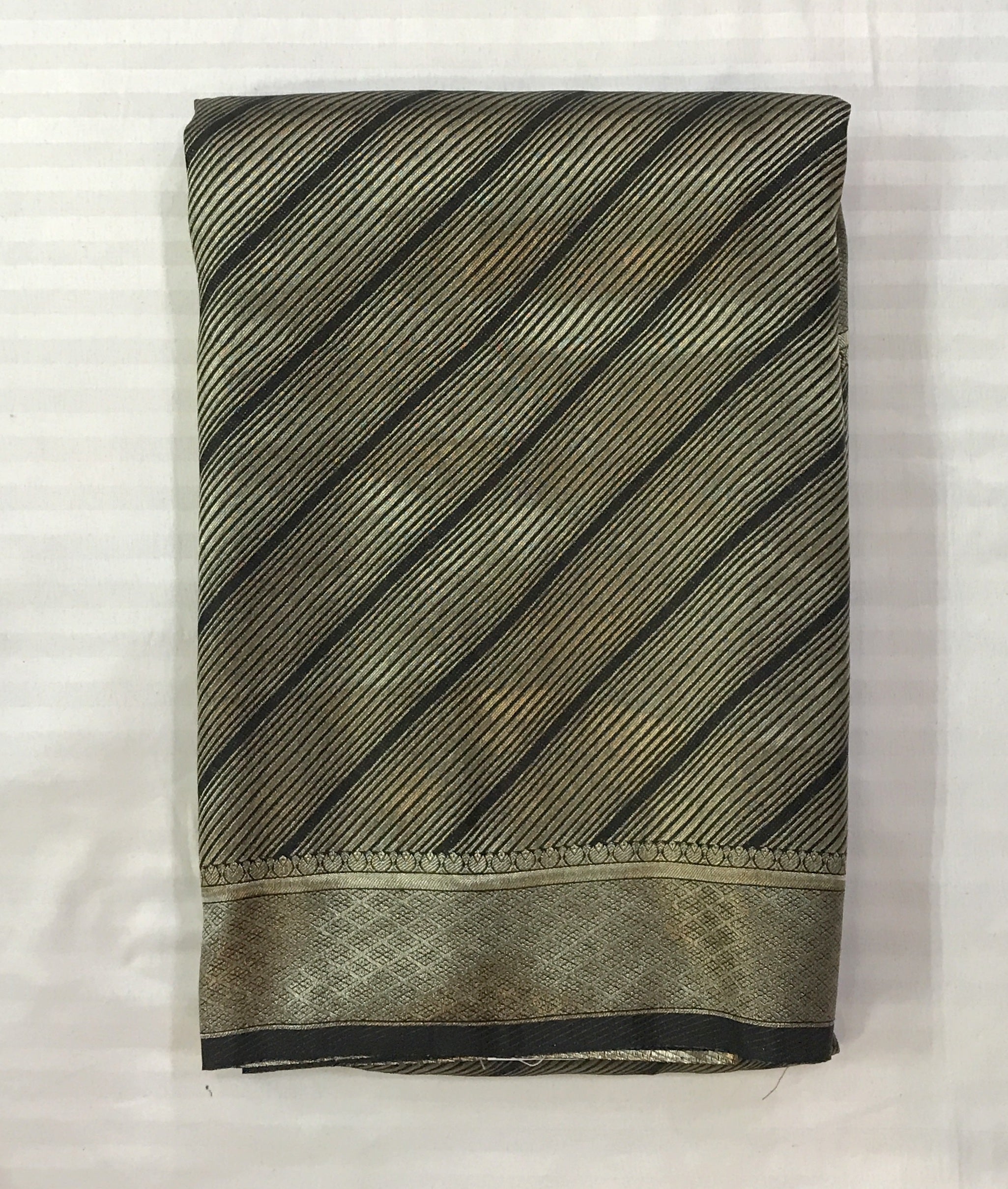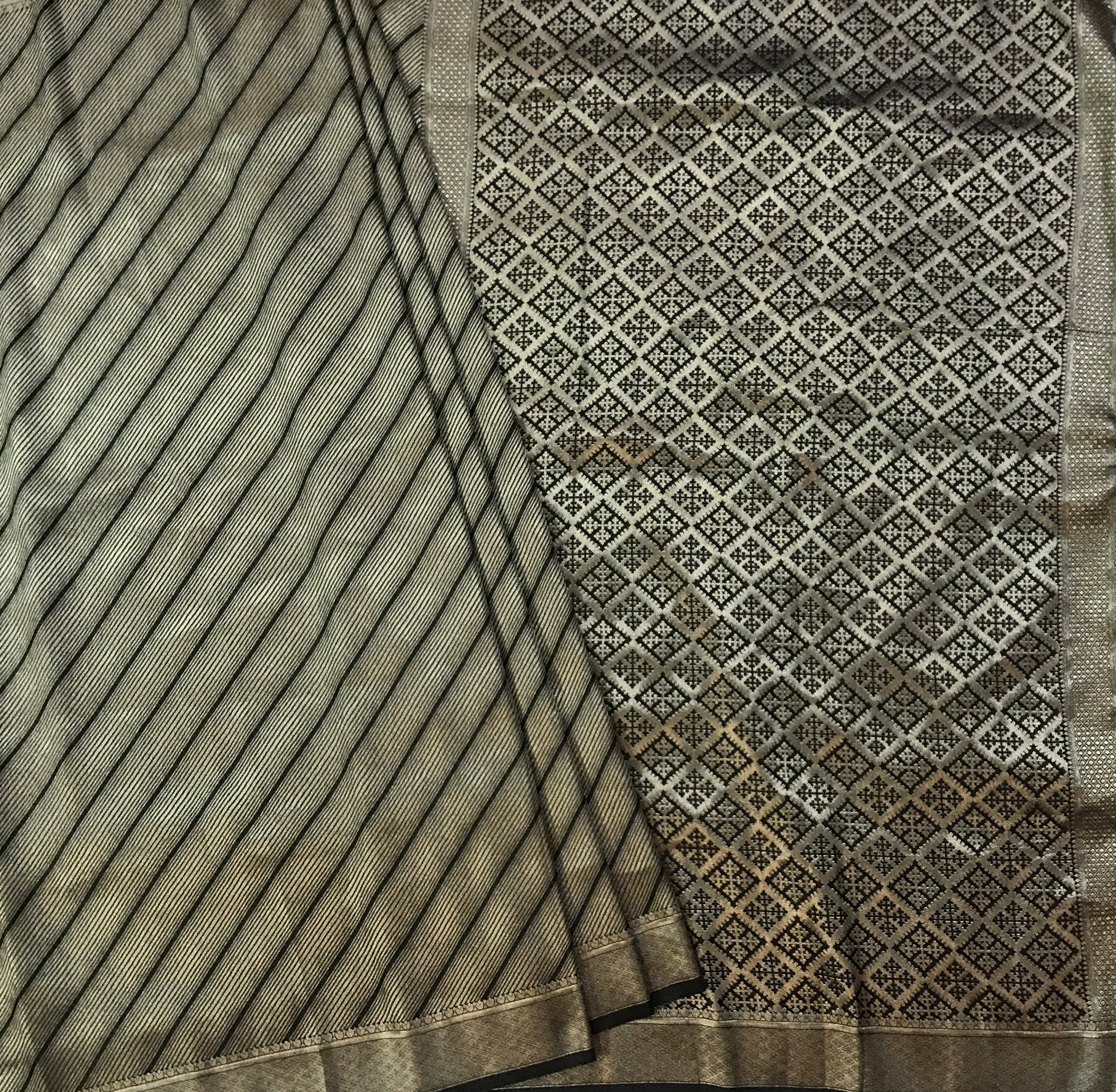 A sophisticated black Banarasi saree featuring sleek diagonal zari stripes on the body and a beautifully detailed geometric-patterned pallu. The subtle, refined zari border completes its classy and timeless look.