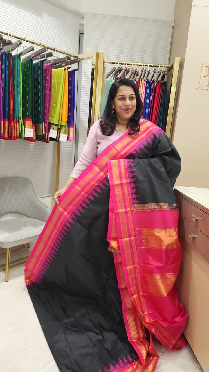 The plain Irkal in a beautiful shade of purple with orange border, this one is a fashionably unique drape! This pure silk power loom Irkal in these beautiful colours is a keepsake. The plain weave with its traditional temple border and the classic irkal golden zari pallu looks stunning.