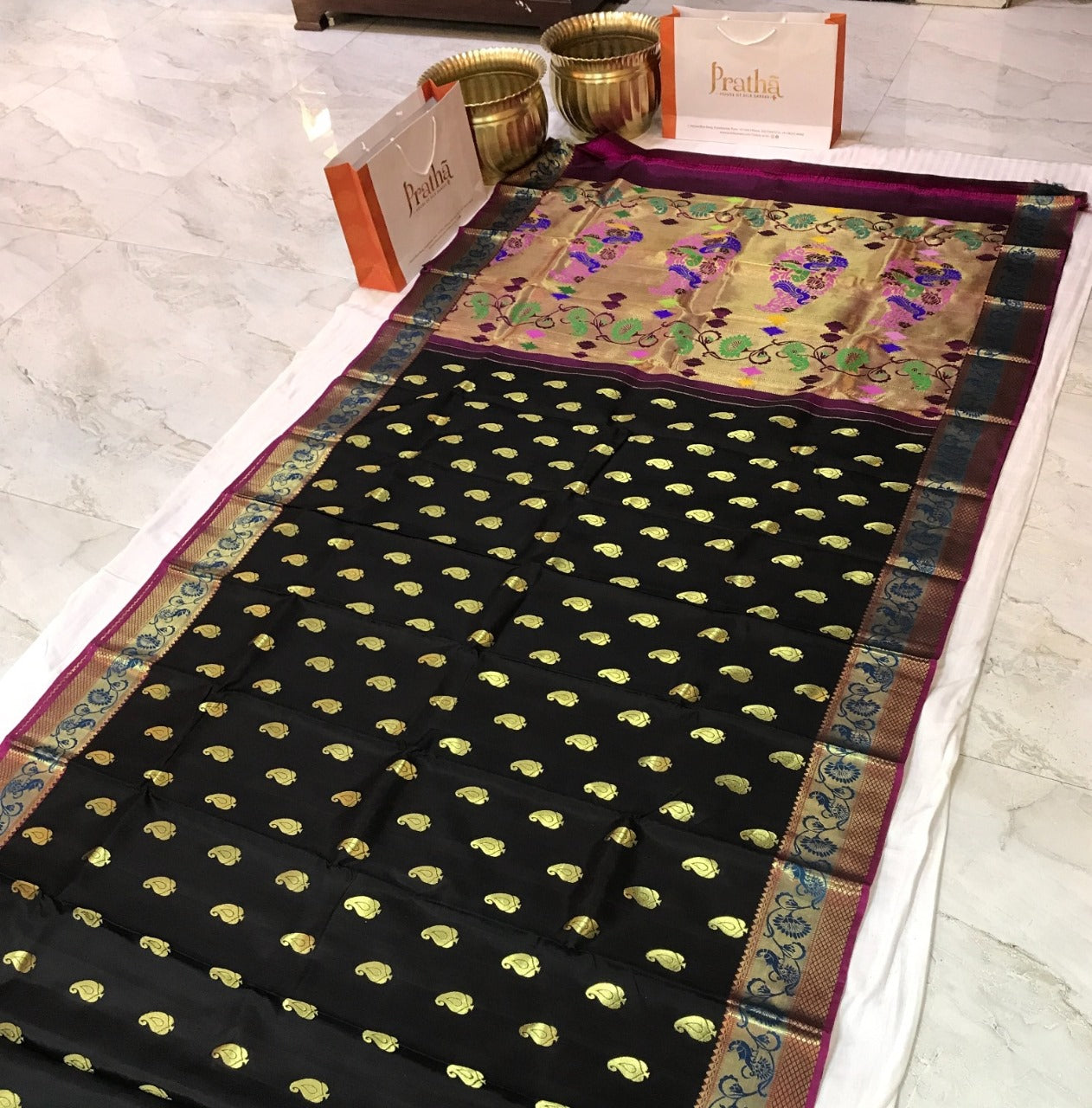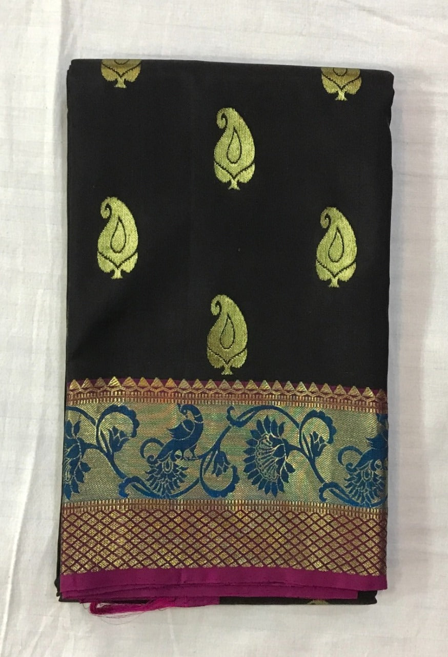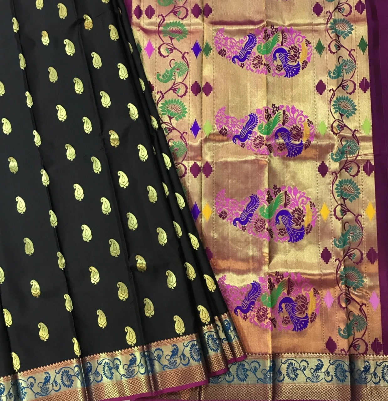 This black coloured elegant Kanjeevaram silk saree features delicate koyri butti woven across the body, symbolizing grace and tradition. It is beautifully complemented by a rich designer contrast zari border, intricately crafted to enhance its regal appeal. Blending heritage with timeless beauty, this saree is perfect for festive and special occasions.