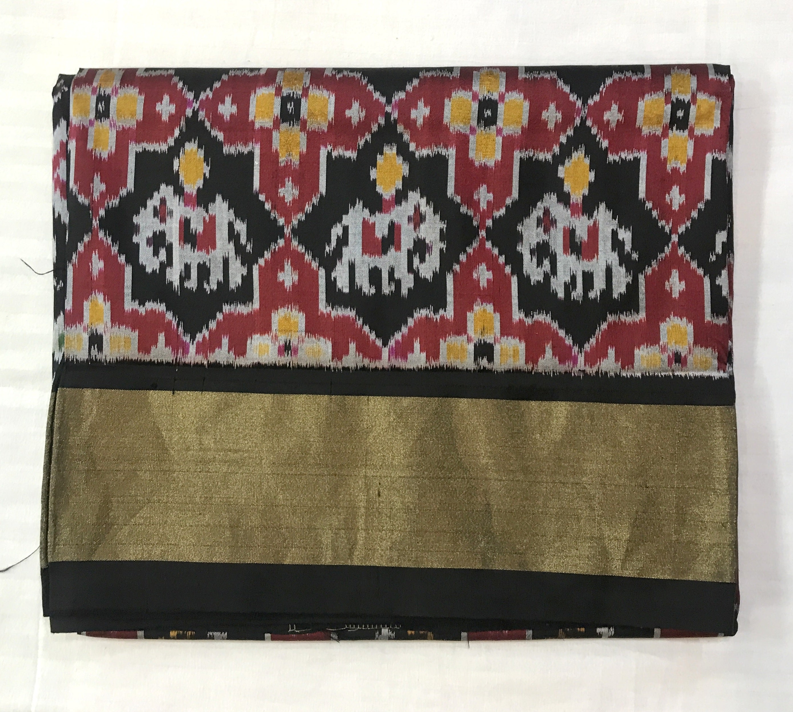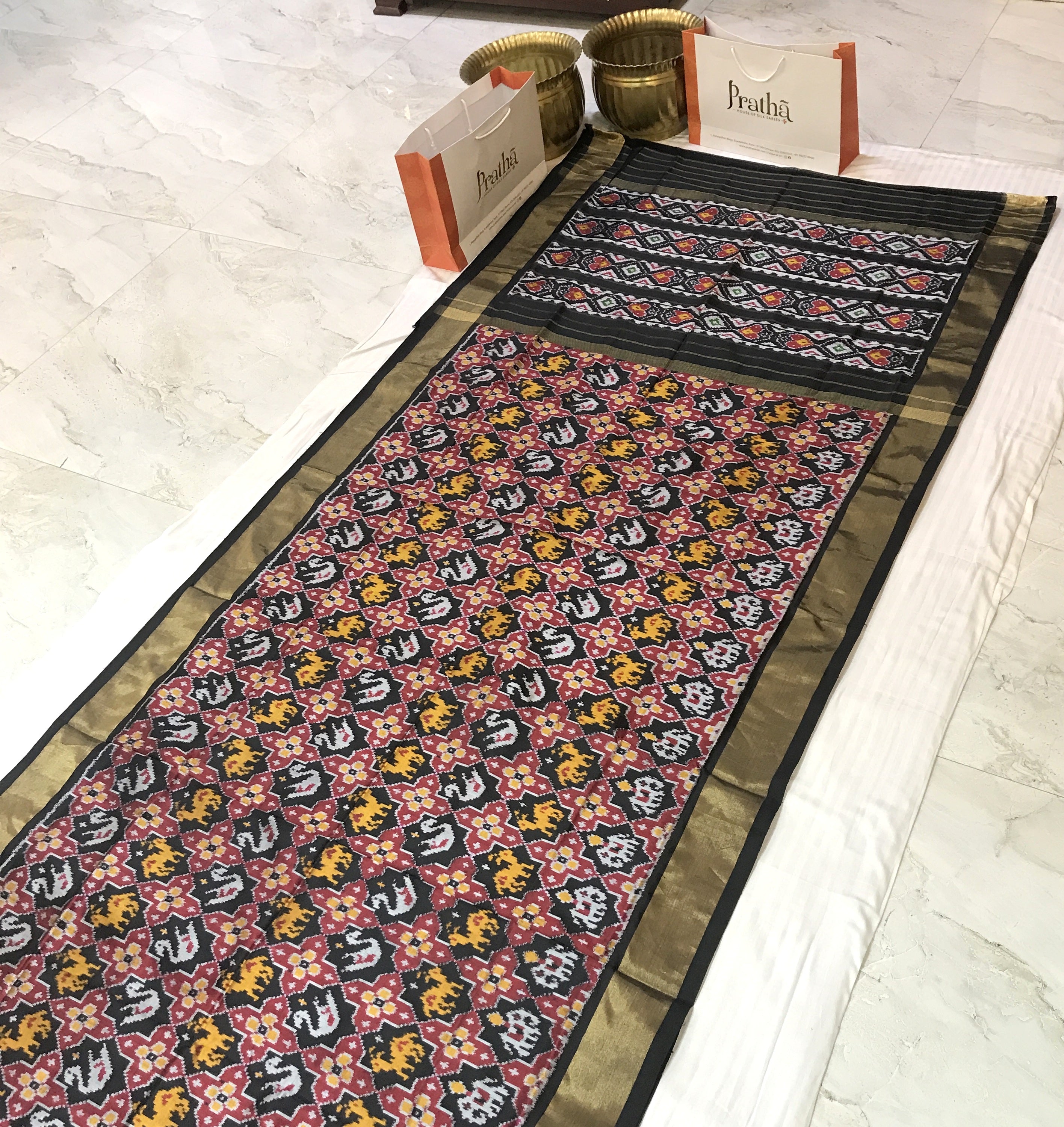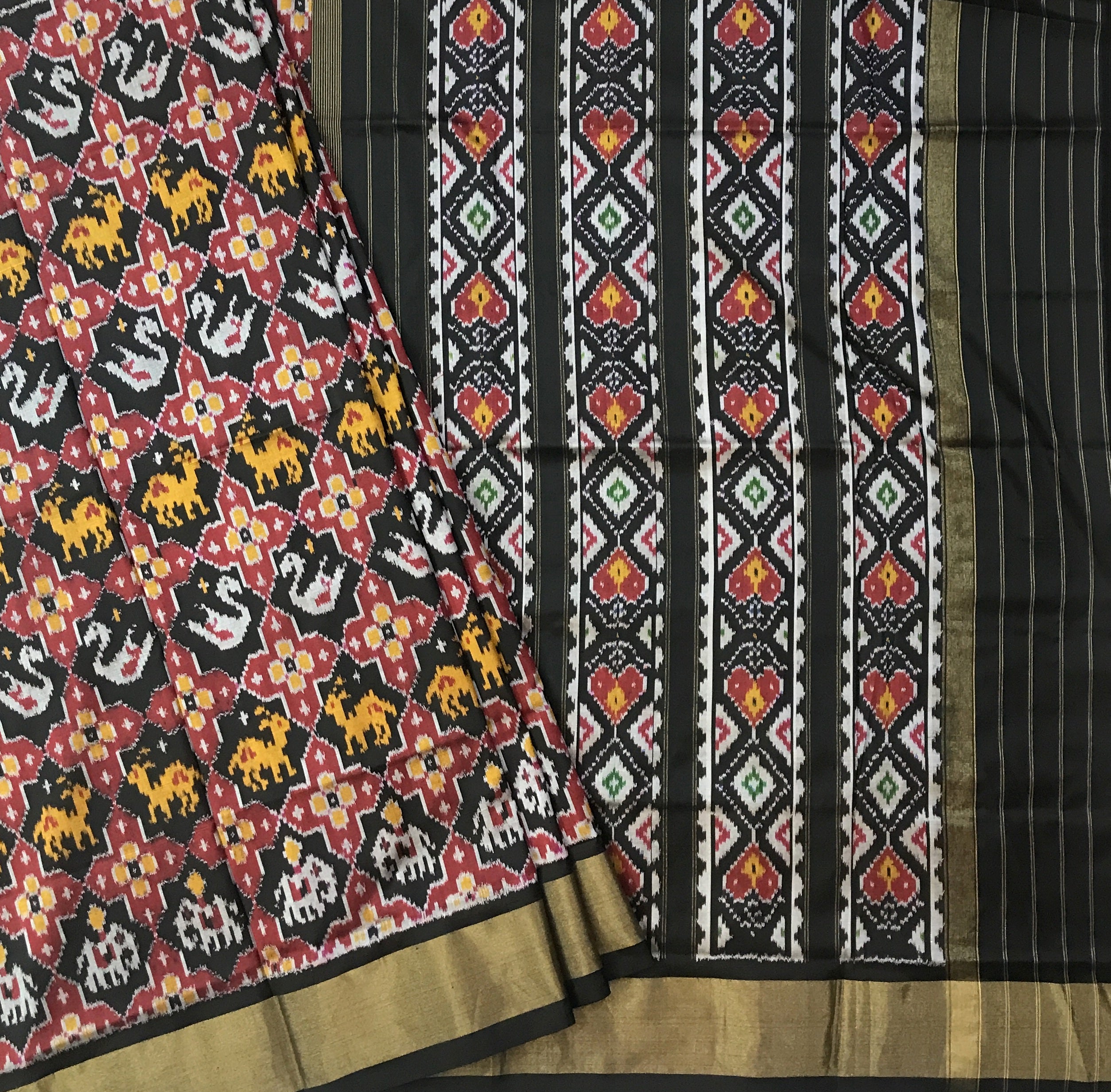 This exquisite handwoven Ikat saree beautifully brings together tradition and vibrancy with its striking multicoloured motifs crafted on a rich brick-red base. The saree features classic animal and floral Ikat patterns in shades of white, yellow, and black, giving it a lively and culturally rooted charm. The contrasting black pallu stands out with its vertical rows of intricate geometric Ikat designs in red, green, white, and yellow, adding depth and elegance to the weave. Finished with a subtle golden zari border, this saree is a perfect pick for those who admire bold artistry and authentic craftsmanship in Ikat textiles.