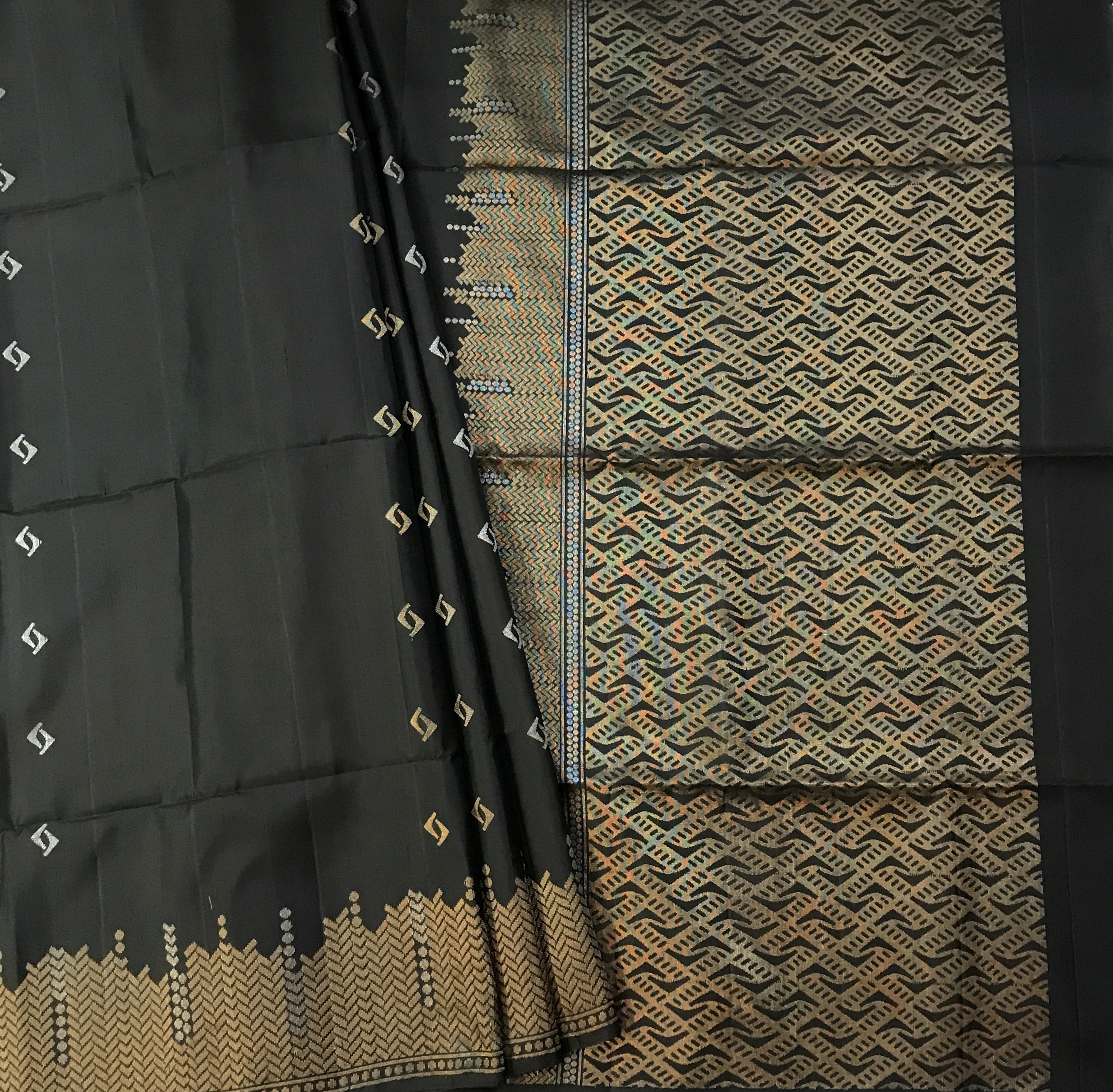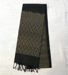 This black colour saree has a small floral shaped silver-golden alternate butta along with a beautiful intricate design golden zari border. This Soft Silk saree flaunts beautiful brocaded design pallu in self color this weave a classy feel. Comfortable to wear and easy to drape this saree is look special. This black color makes this saree a prefect casual or party wear.