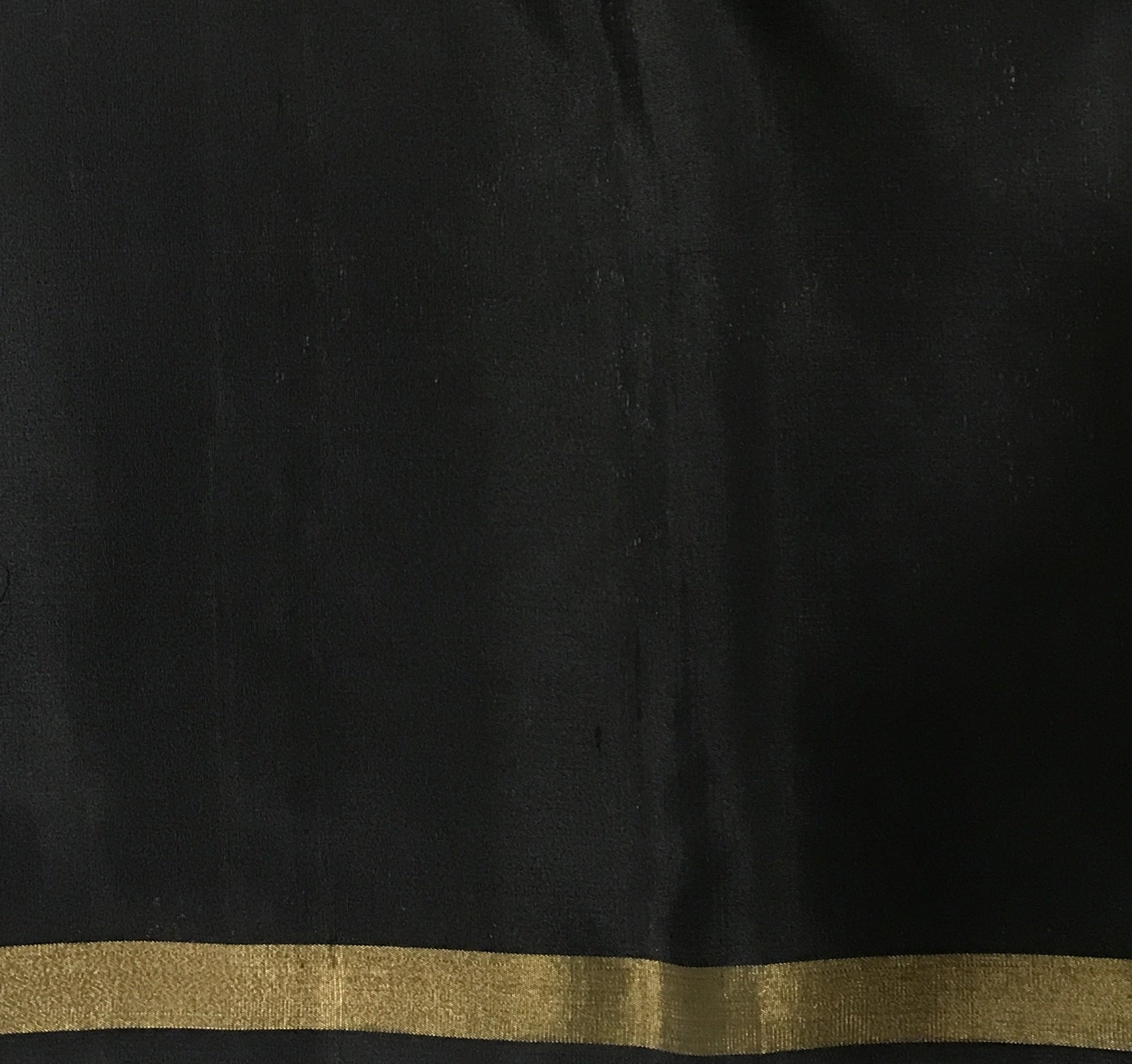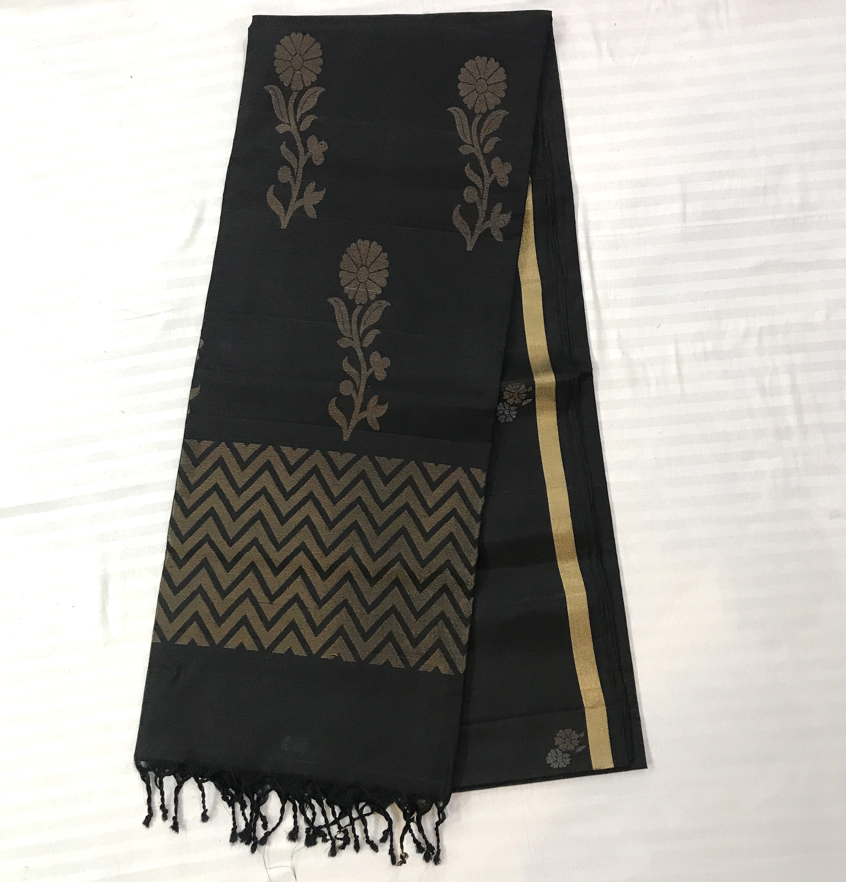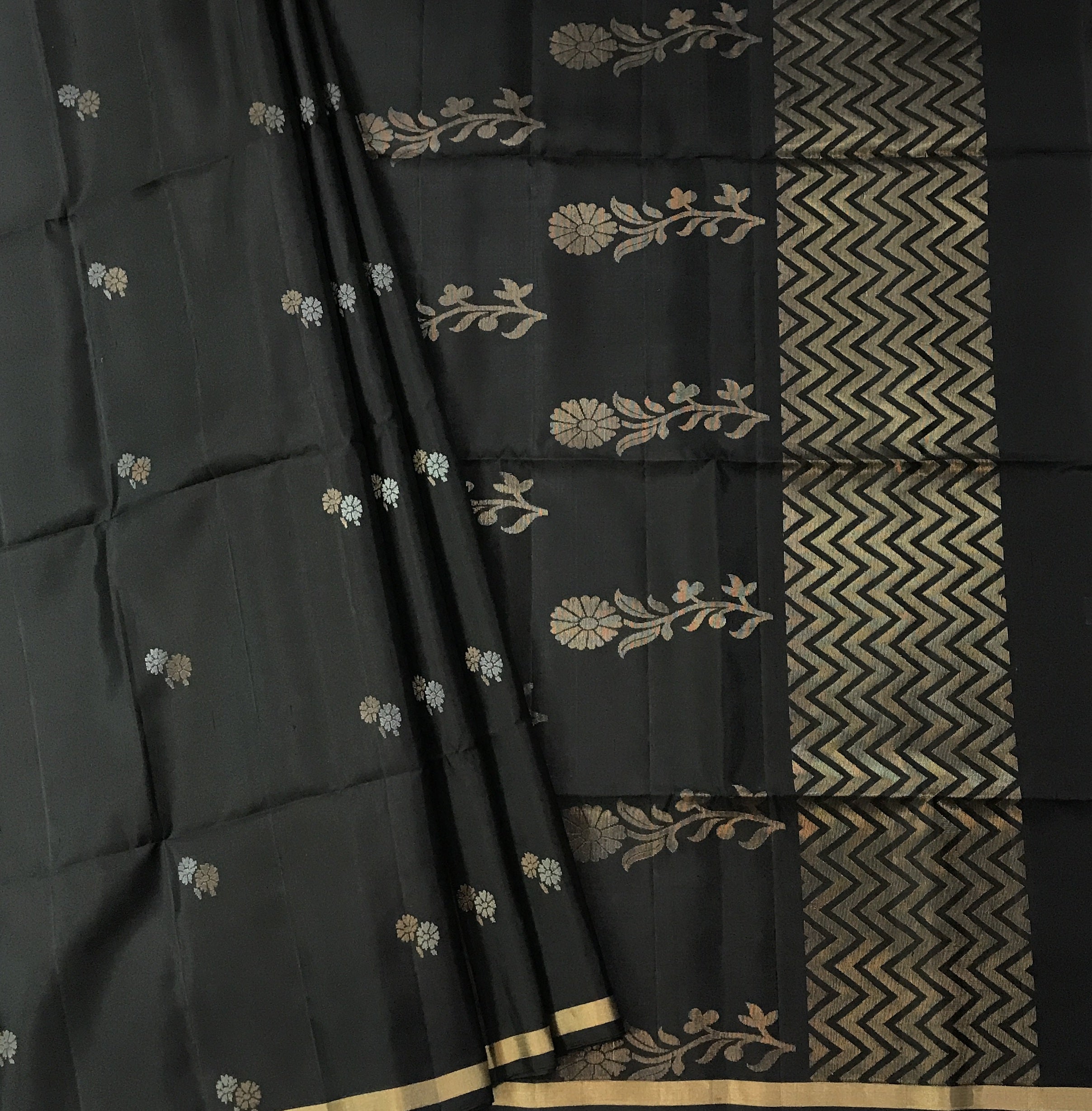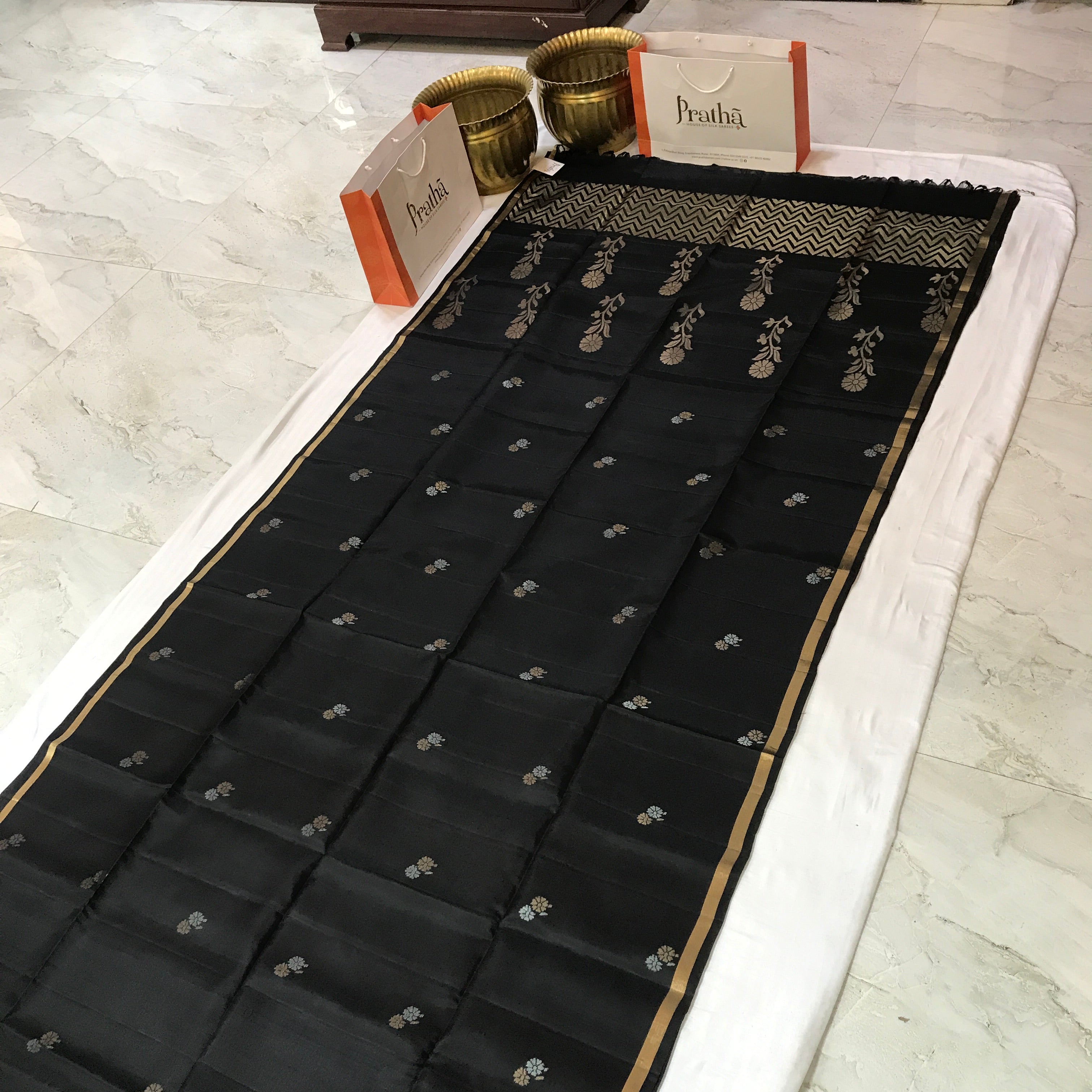 A lovely shade of black Soft Silk always wins hearts, especially when it teams up with a golden zari at its pallu looks fantastic can be worn during the day as well as at night! Do not miss this saree has a very beautiful butti design woven in golden silver zari and charming zari pallu looks beautiful.