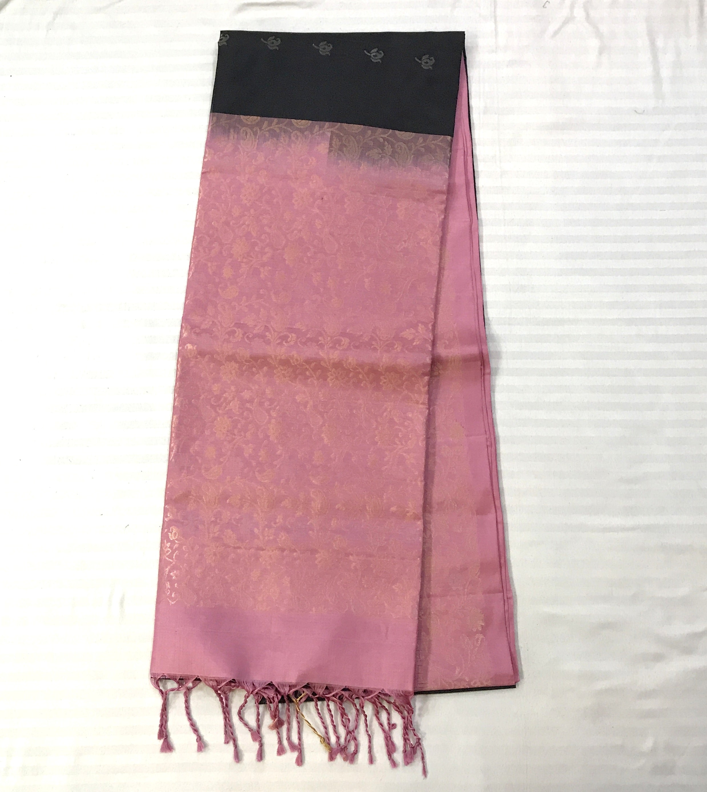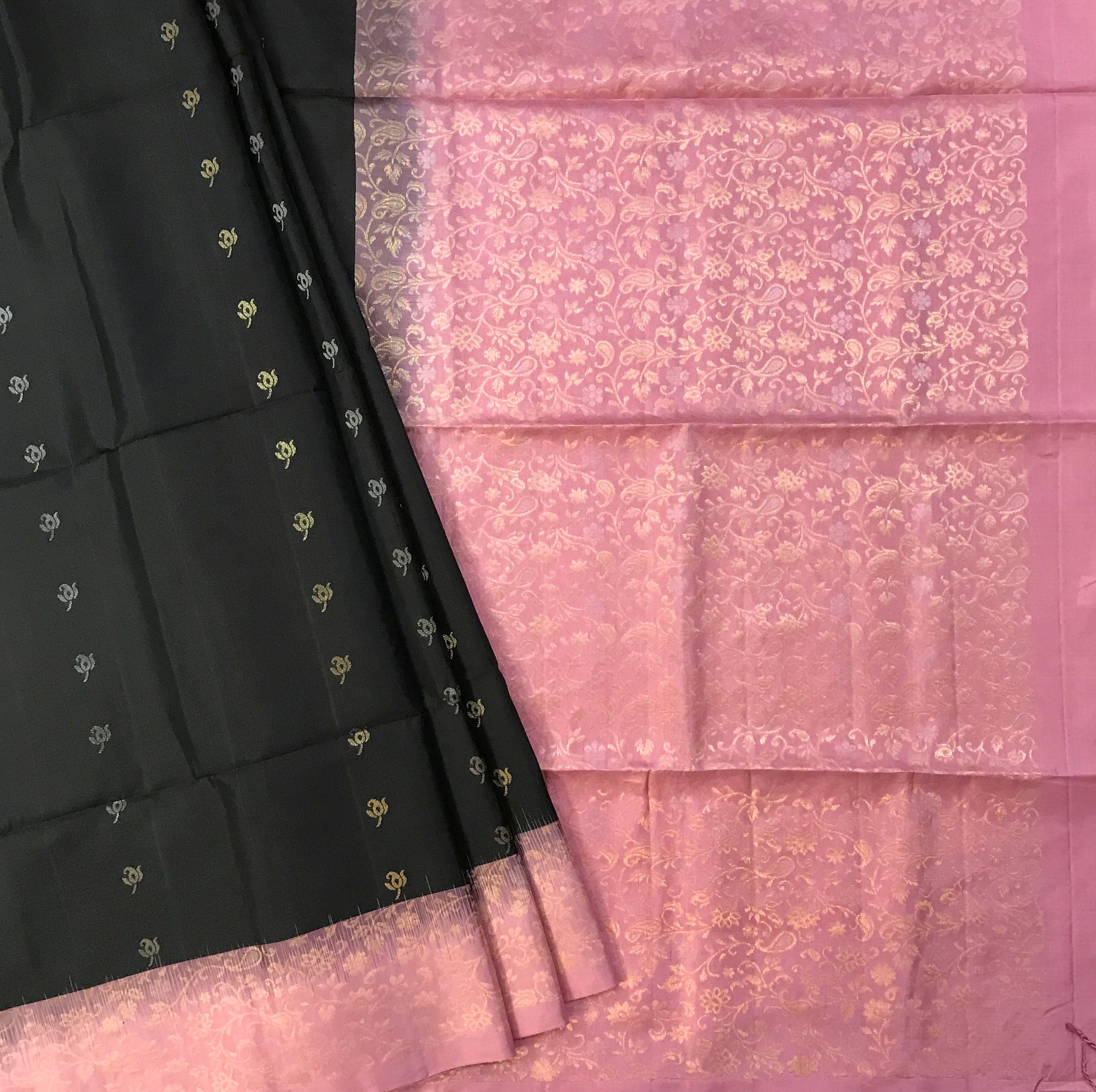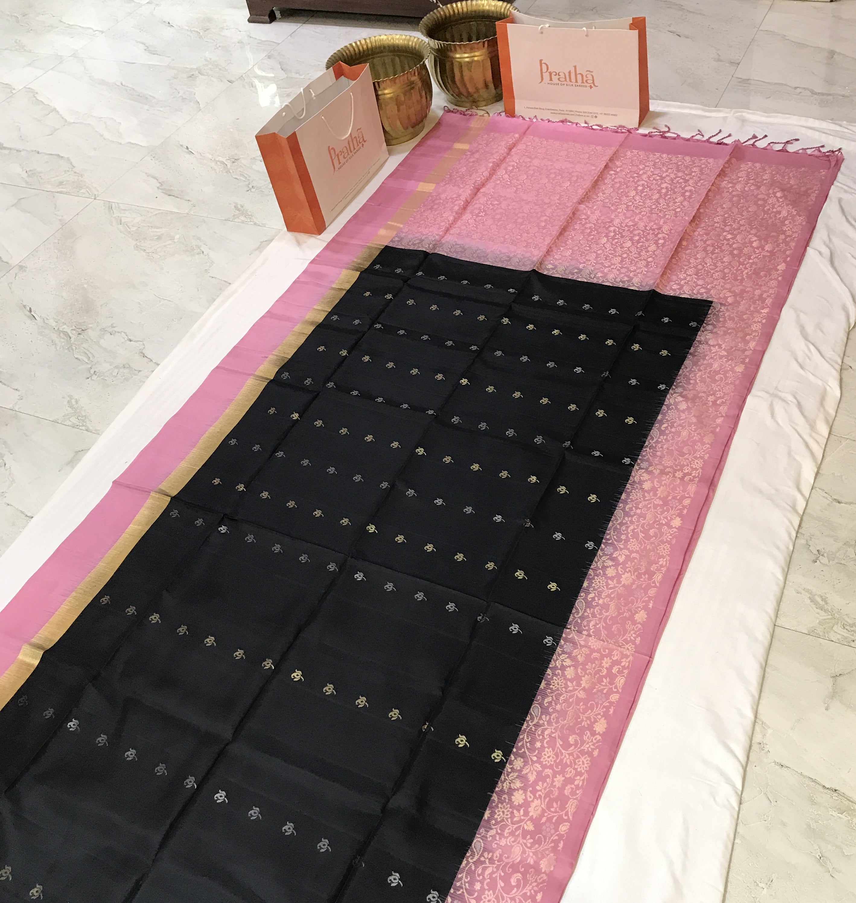This black pure Soft Silk handwoven saree flaunts beautiful unique motifs intricately woven in golden-silver zari threads. The fresh black colour against the pink designer border and pallu, makes this a fantastic combination. Light in weight and easy to drape this is a perfect casual / party / corporate wear saree.